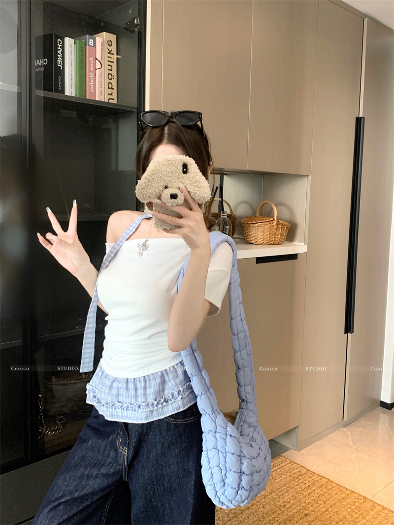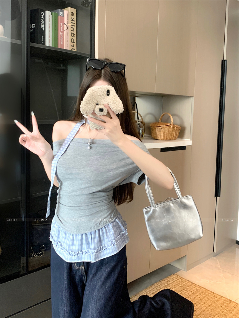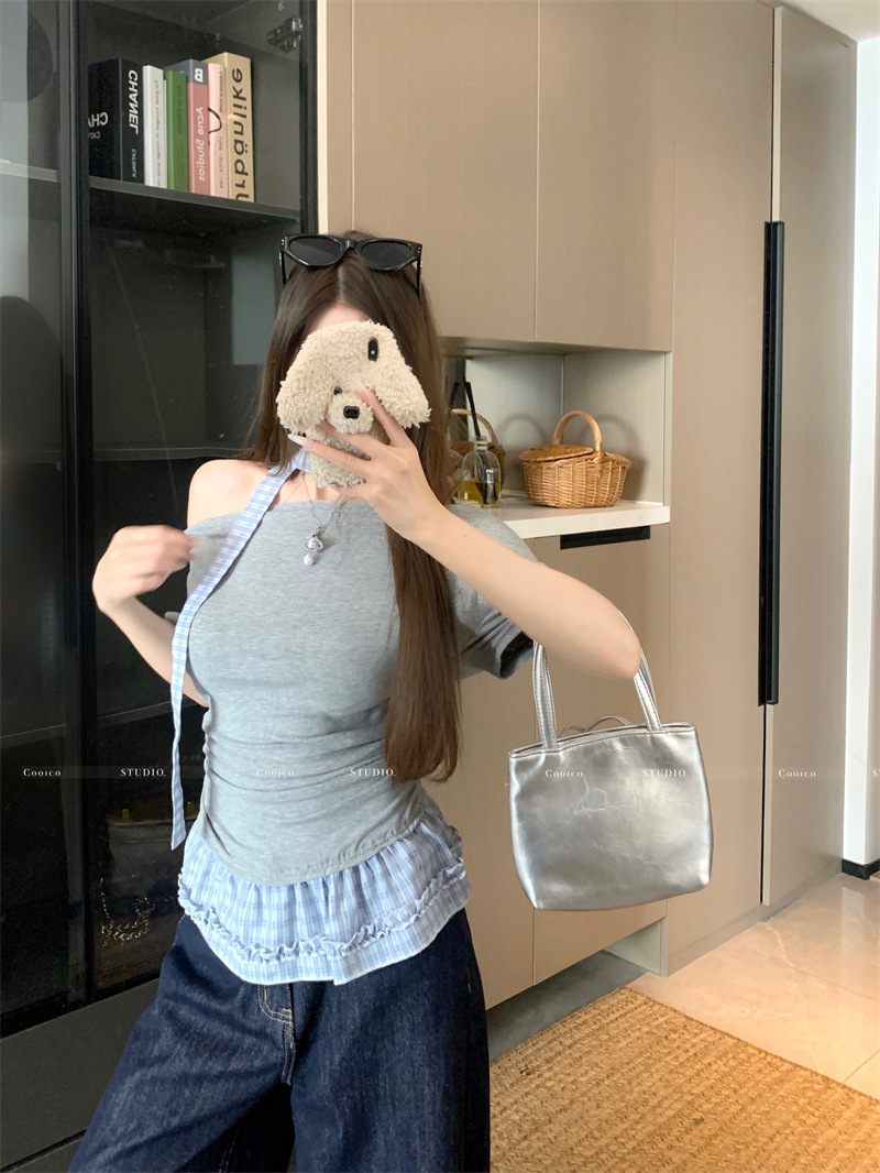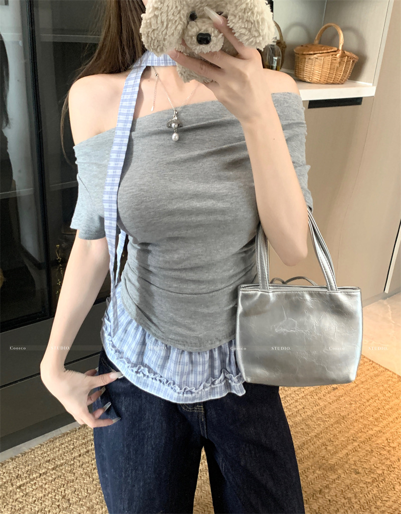 여름 시크 허리 슬리밍 탑 인을 위한 니치 디자인 가짜 투피스 대비 체크 무늬 반팔 슬로프 숄더 티셔츠