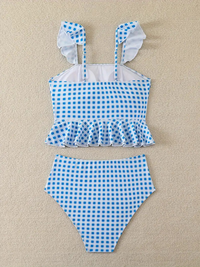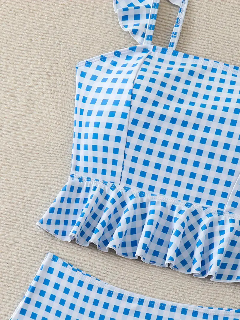 新款欧美蓝色格子高级印花荷叶边可爱两件套时尚性感日系复古泳衣