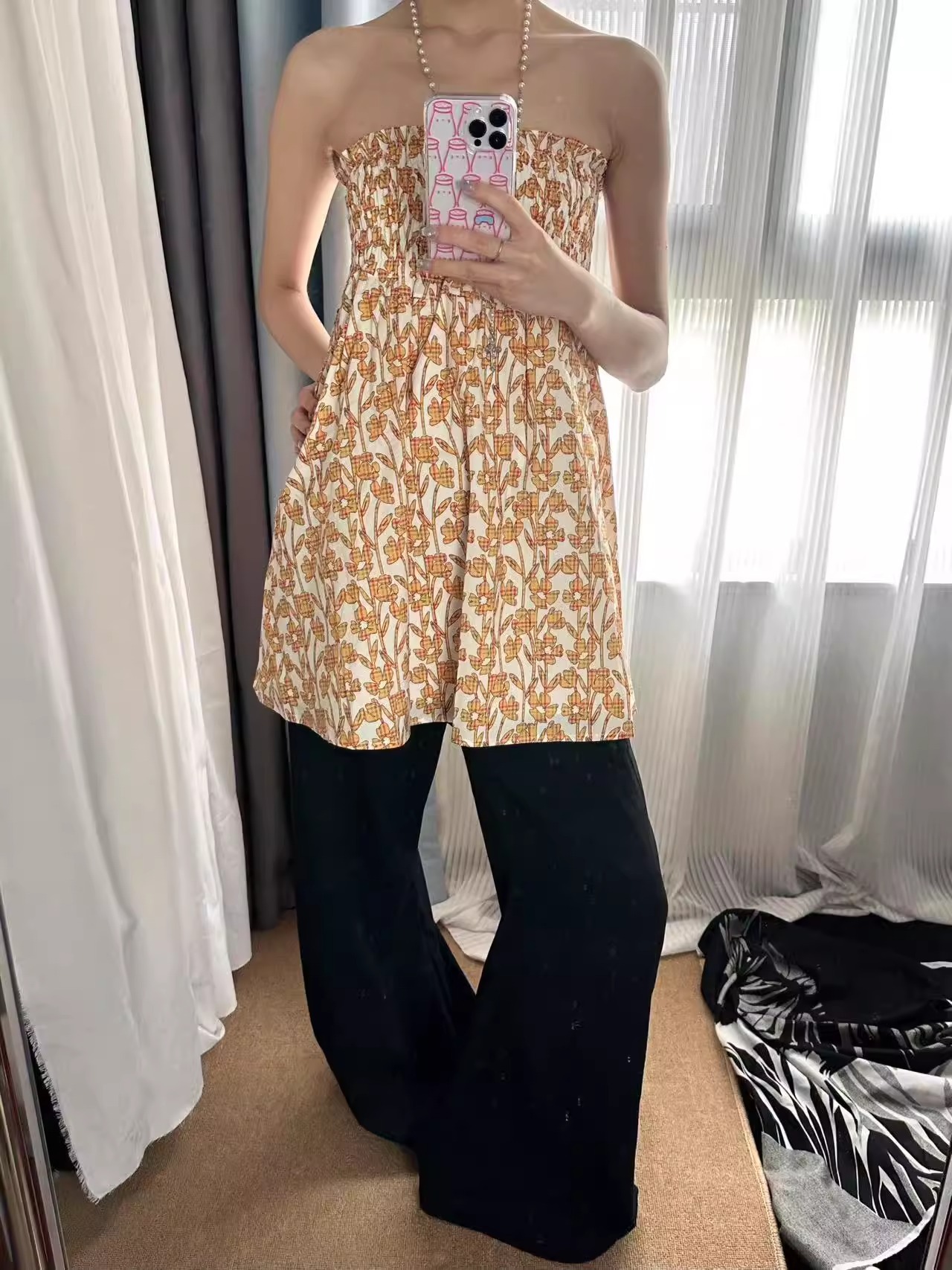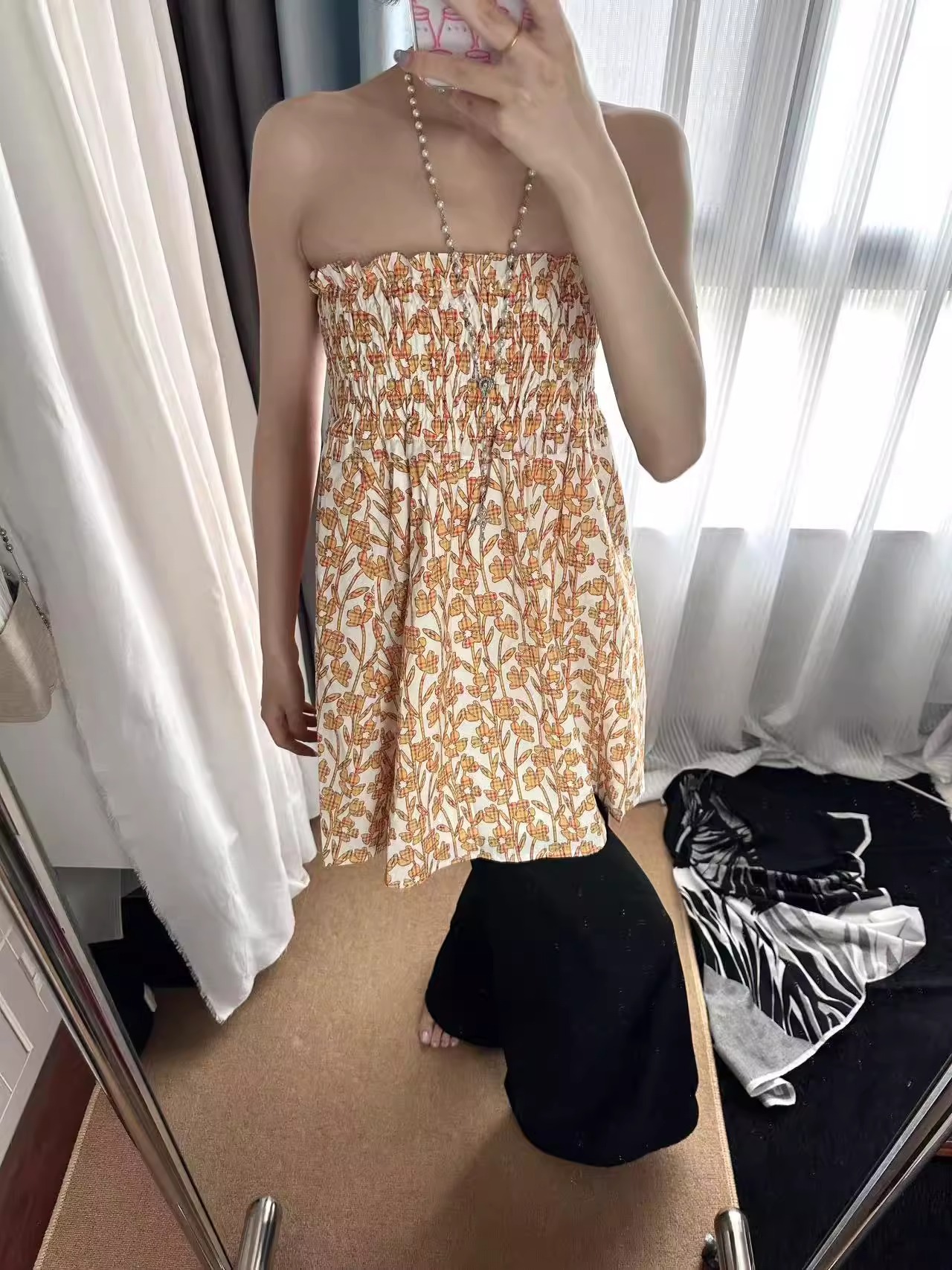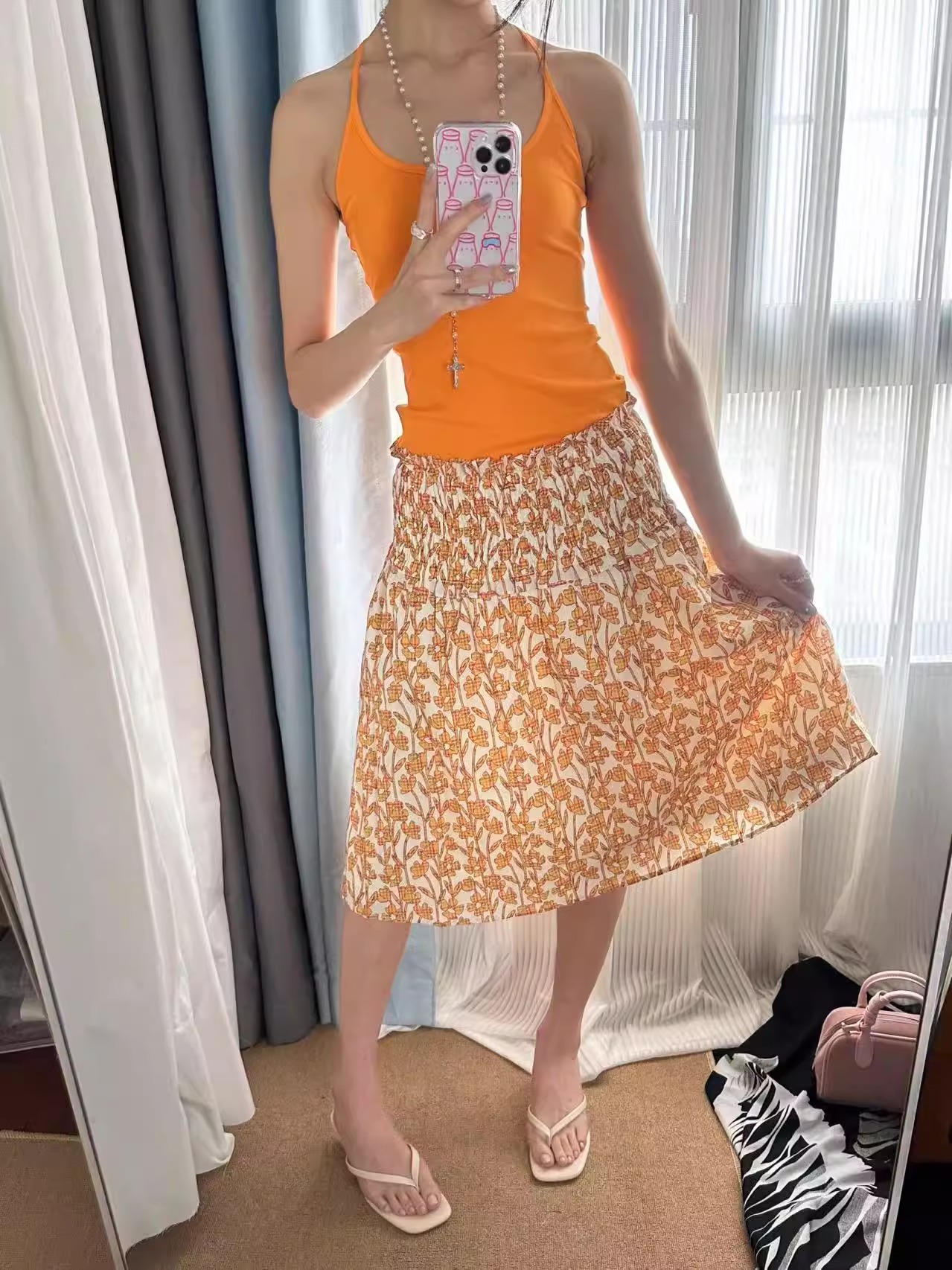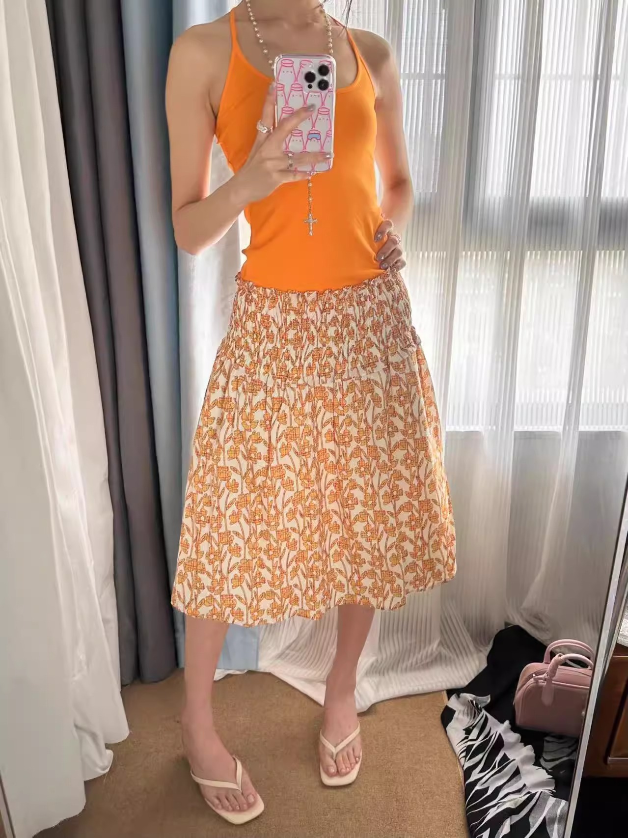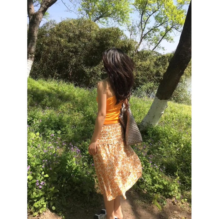 [재고 있음] 여성용 프렌치 레트로 꽃무늬 튜브탑 스커트 투웨어 여름 섬 리조트 스타일 오렌지 컬러