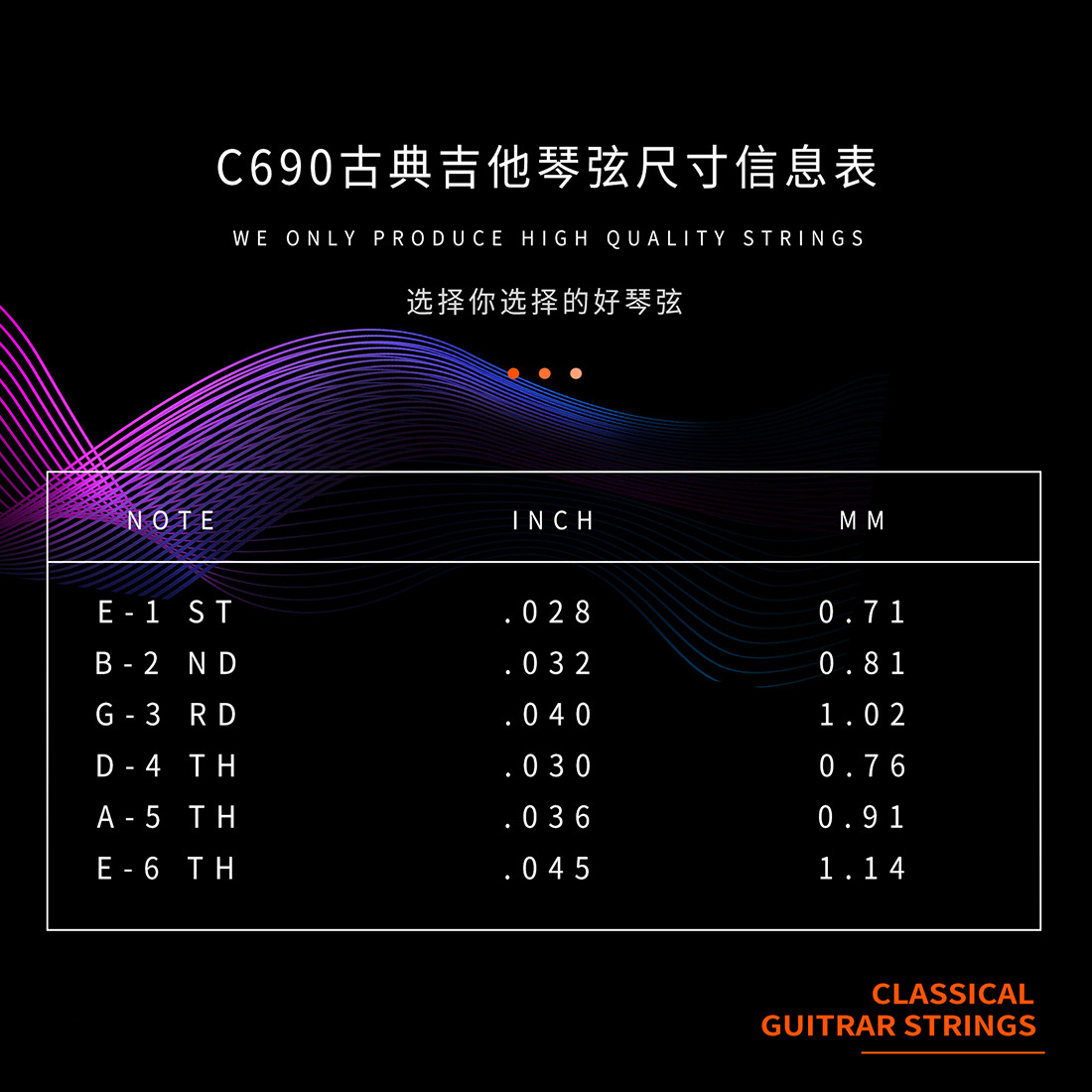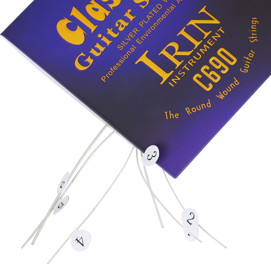 用途卖点:IRIN爱润C690古典吉他弦尼龙+镀银缠绕(28.45),古典吉他弦镀银铜合金+尼龙线+涂层,1、6根贴弦号标识打一圈