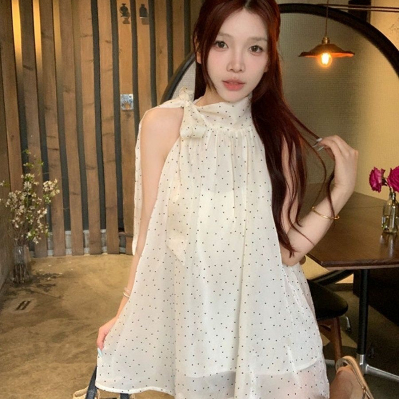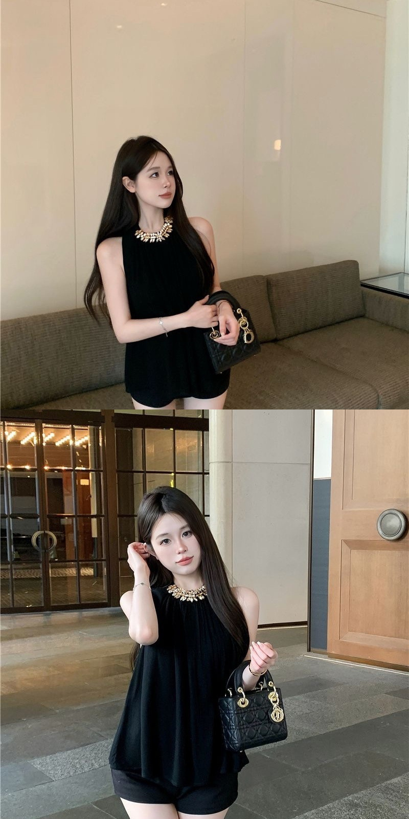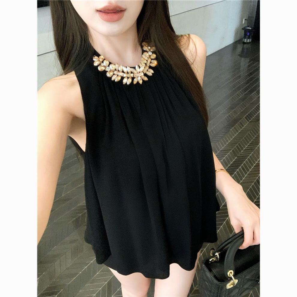 여성을위한 블랙 홀터넥 민소매 쉬폰 셔츠 2024 여름 새로운 스타일 헤비 드릴 체인 느슨한 슬리밍 셔츠 핫 소녀 탑스토어 가기