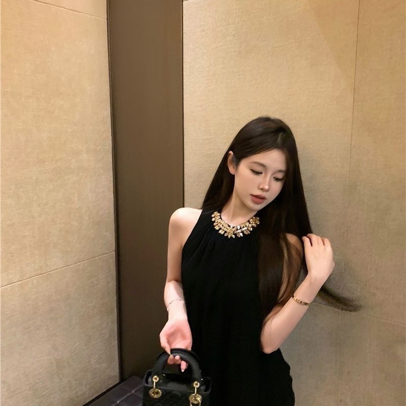 여성을위한 블랙 홀터넥 민소매 쉬폰 셔츠 2024 여름 새로운 스타일 헤비 드릴 체인 느슨한 슬리밍 셔츠 핫 소녀 탑