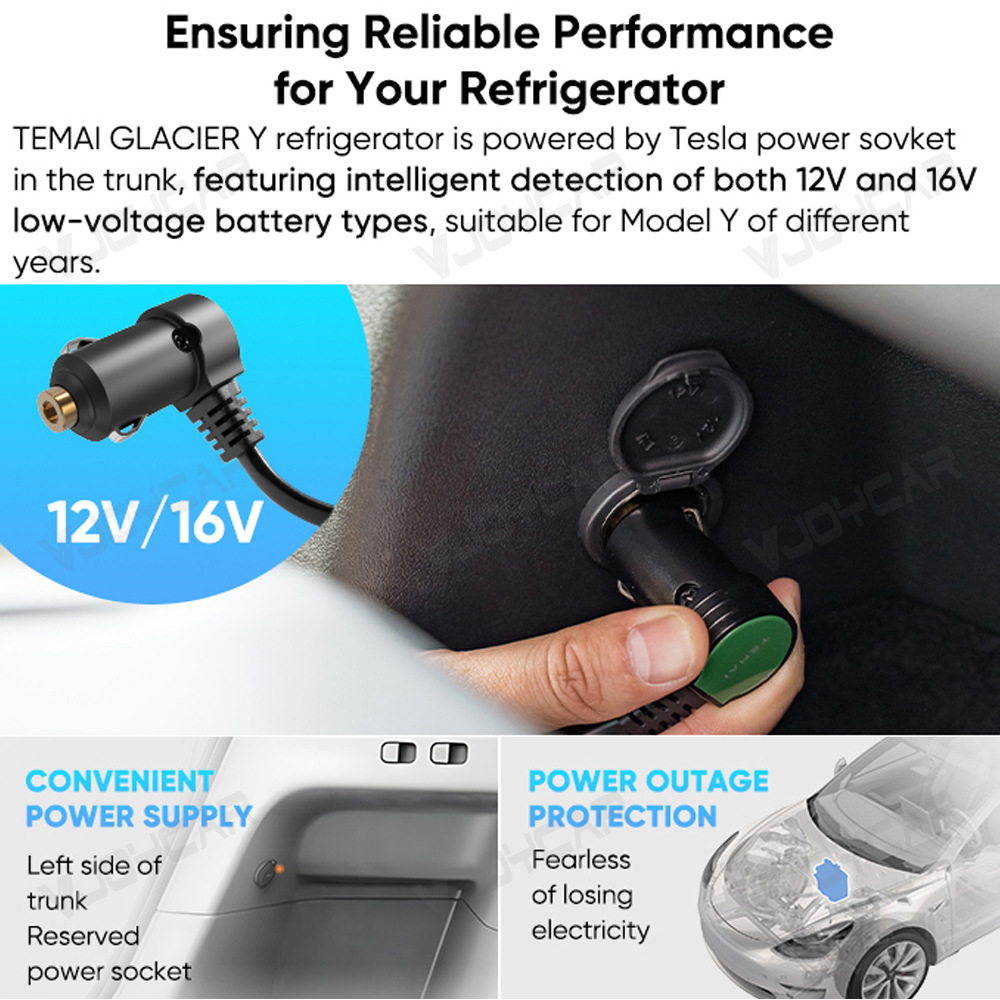 【高效电源适配】支持特斯拉后备箱 12V/16V 电源,适配 Model Y 车型,左侧后备箱预留电源接口,供电便捷无忧。