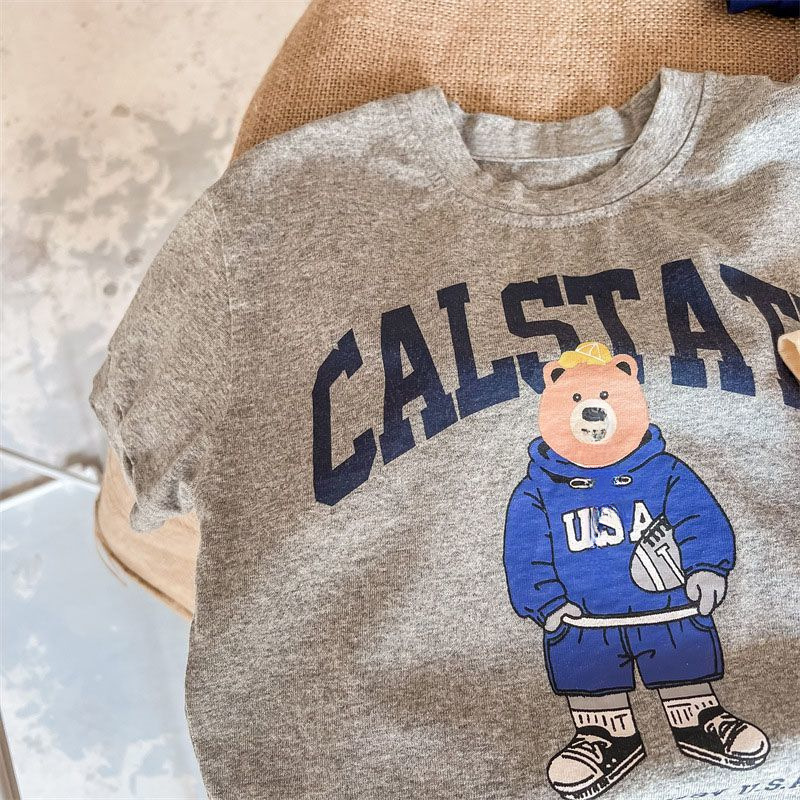 2025 새로운 어린이 캐주얼 세트 소년 소녀 한국식 곰 인쇄 반팔 반바지 느슨한 스포츠 투피스 세트스토어 가기