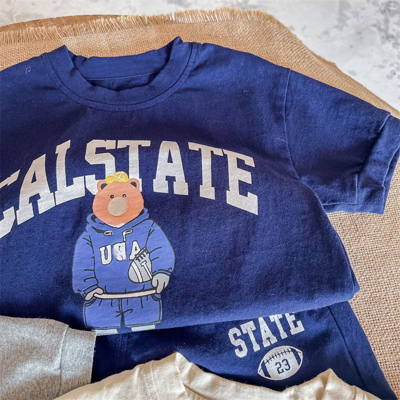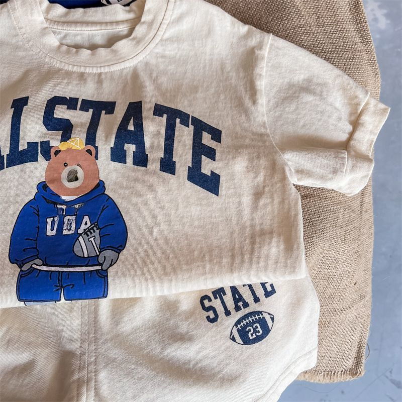 2025 새로운 어린이 캐주얼 세트 소년 소녀 한국식 곰 인쇄 반팔 반바지 느슨한 스포츠 투피스 세트