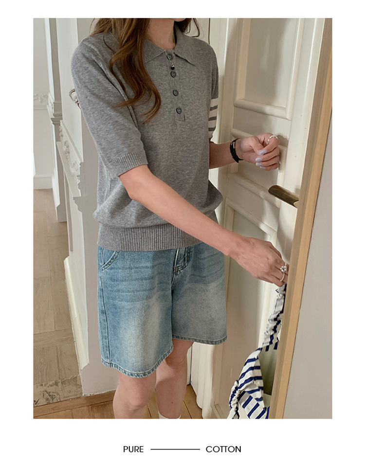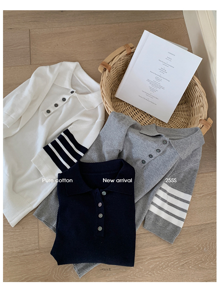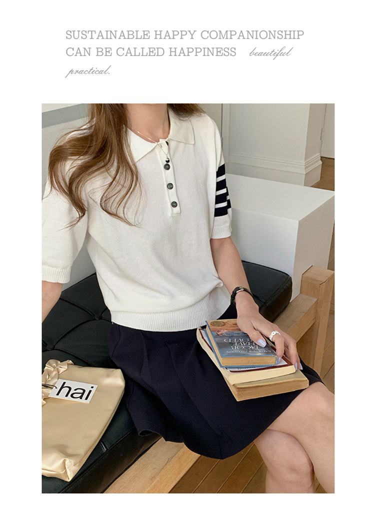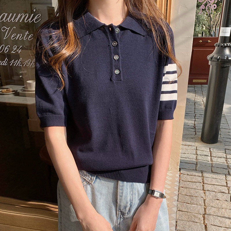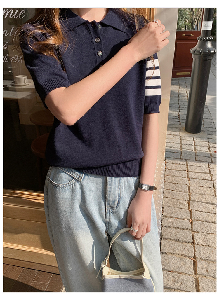 여름 새로운 여성 스웨터 폴로 칼라 코튼 니트 반팔 스트라이프 자켓 티셔츠 여성상의 도매스토어 가기