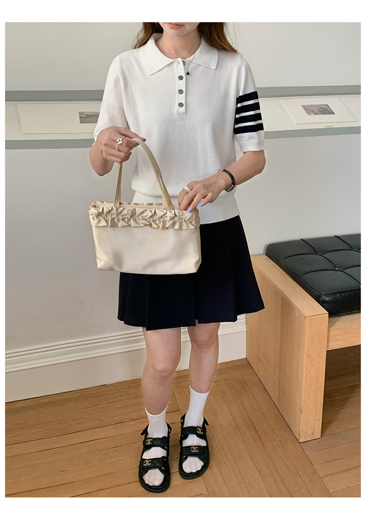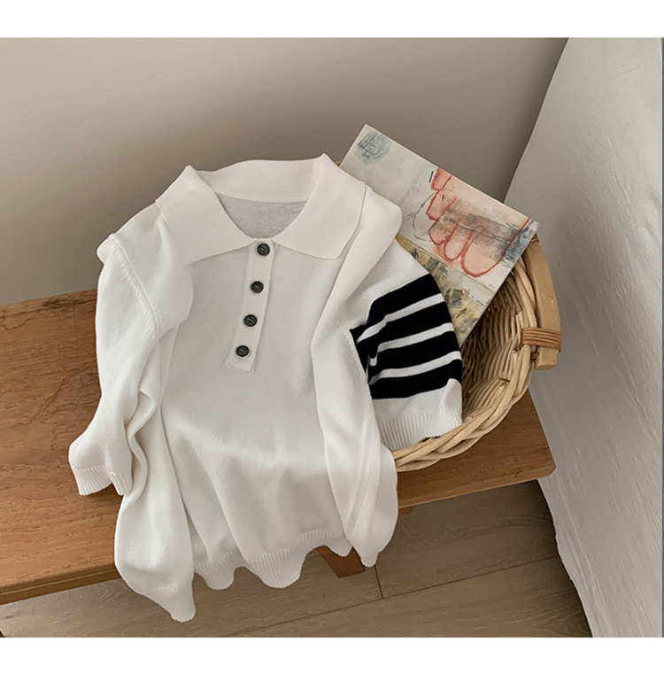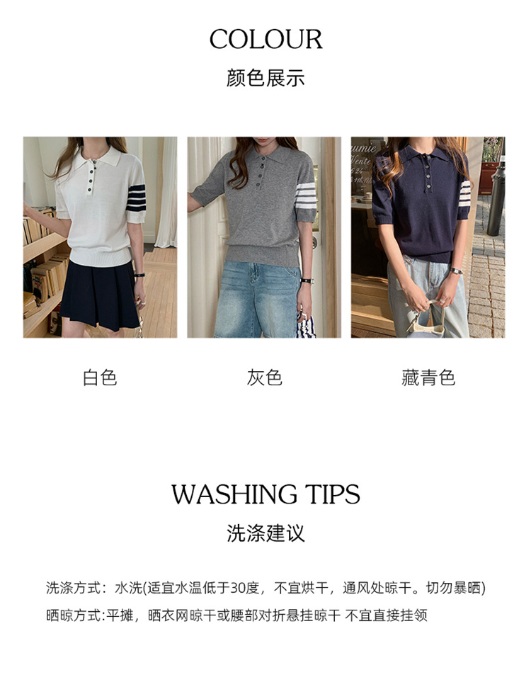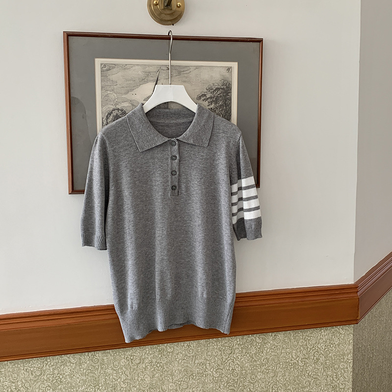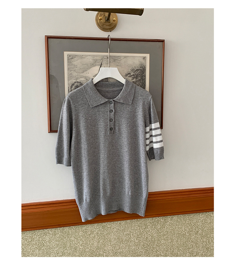 여름 새로운 여성 스웨터 폴로 칼라 코튼 니트 반팔 스트라이프 자켓 티셔츠 여성상의 도매스토어 가기