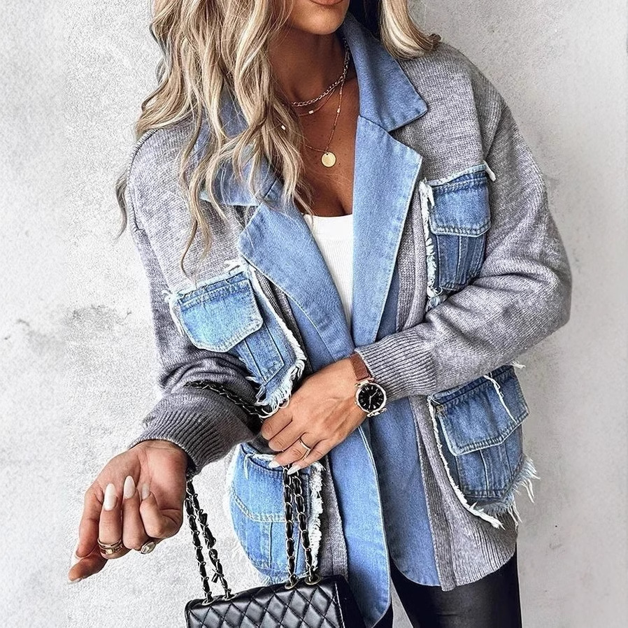 2025 가을, 겨울 유럽과 미국 대외 무역 러시아 국경 간 여성 의류 새로운 데님 스플 라이스 스웨터 니트 자켓 카디건 여성