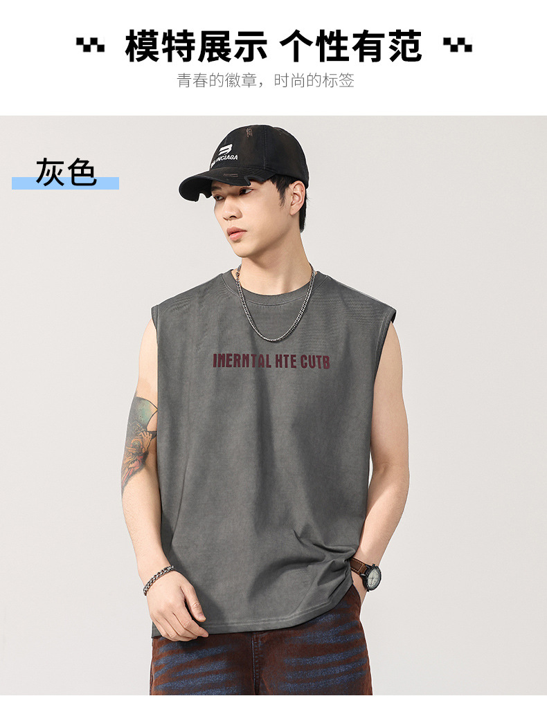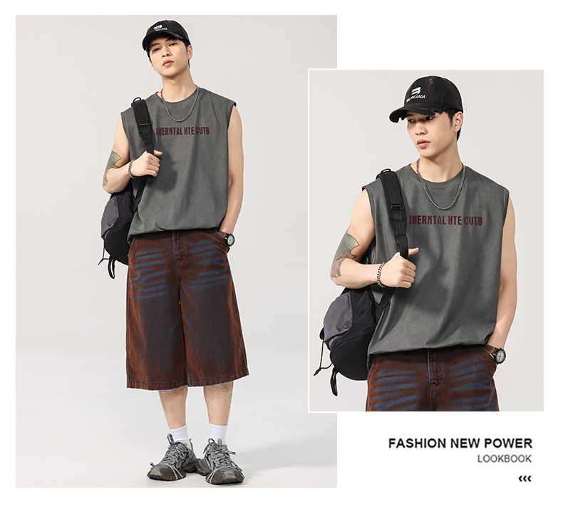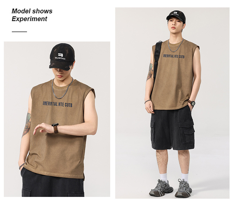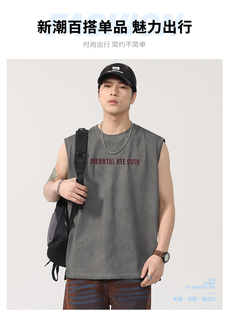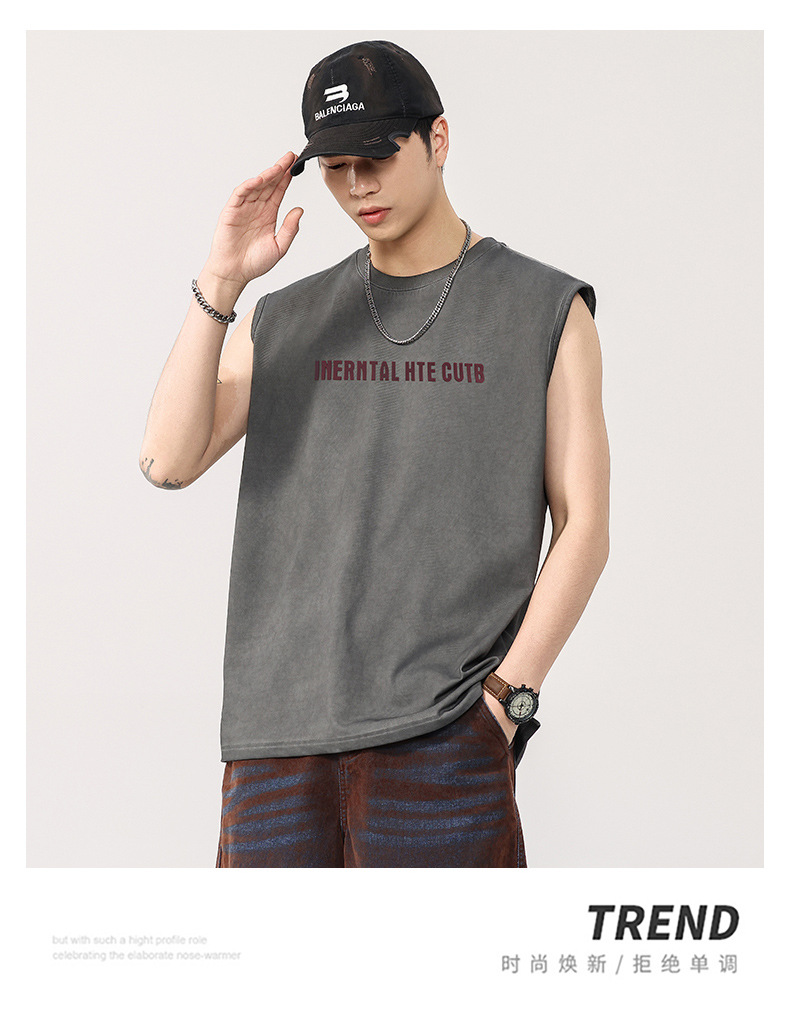 T3970 | 플러스 사이즈 남성 여름 새로운 미국 복고풍 민소매 조끼 느슨한 튀김 컬러 더러운 세척 인쇄 티셔츠 남성