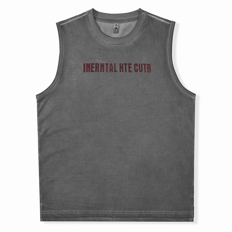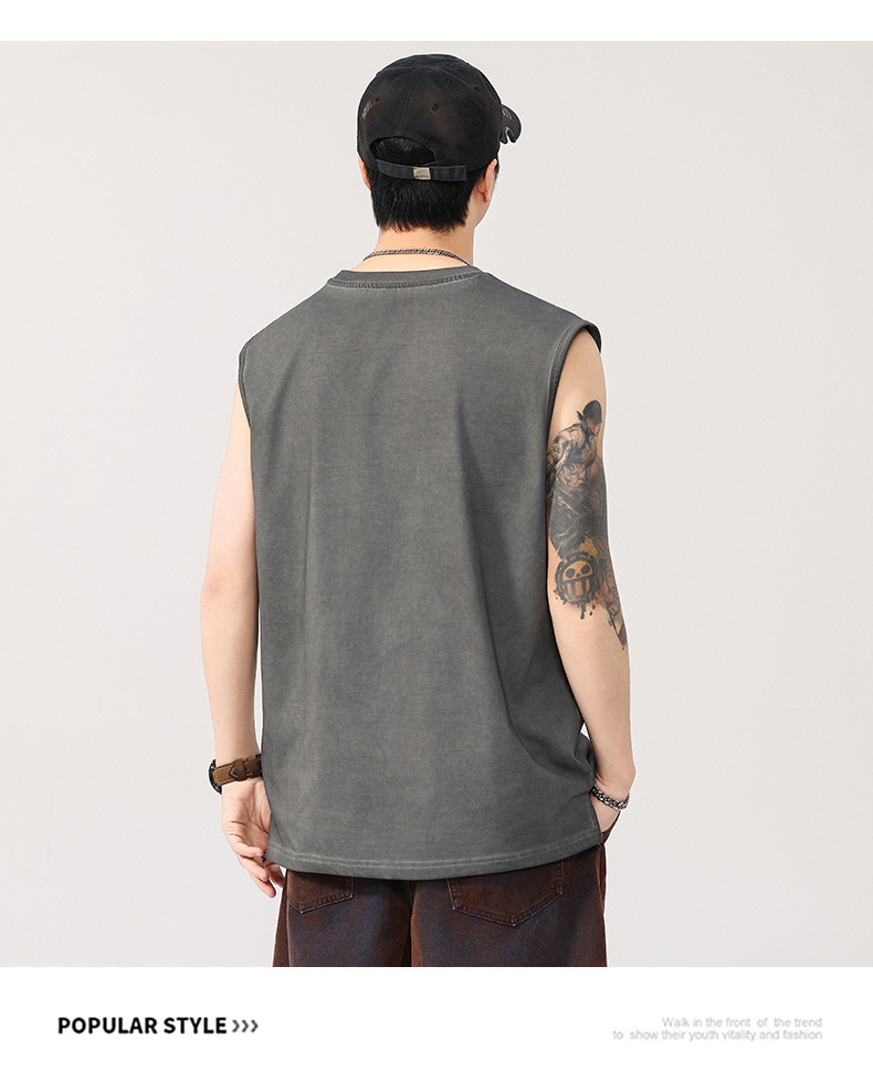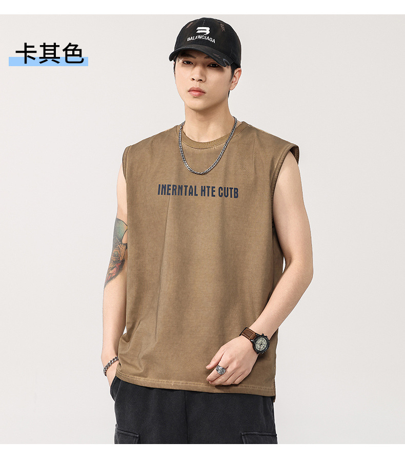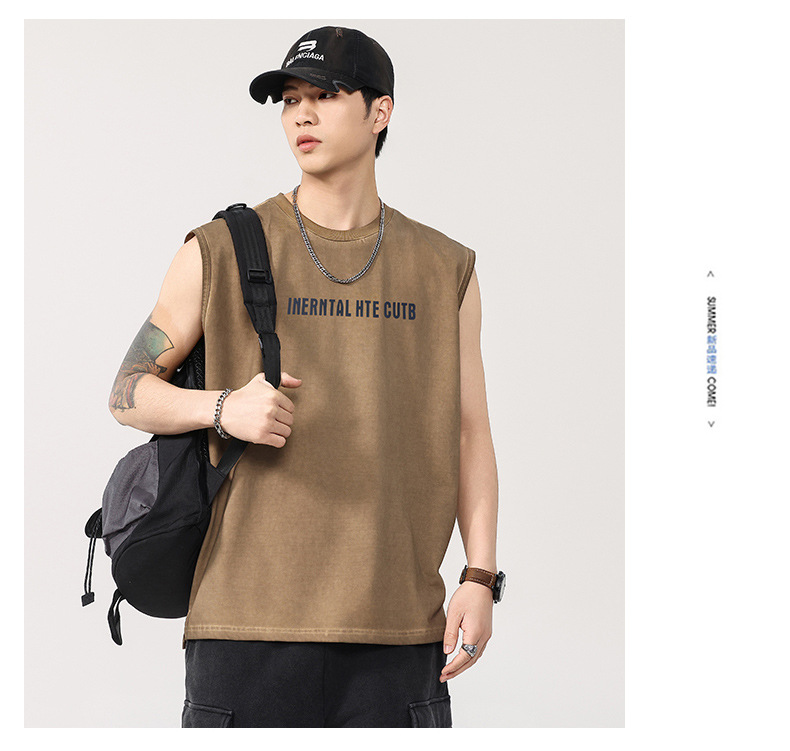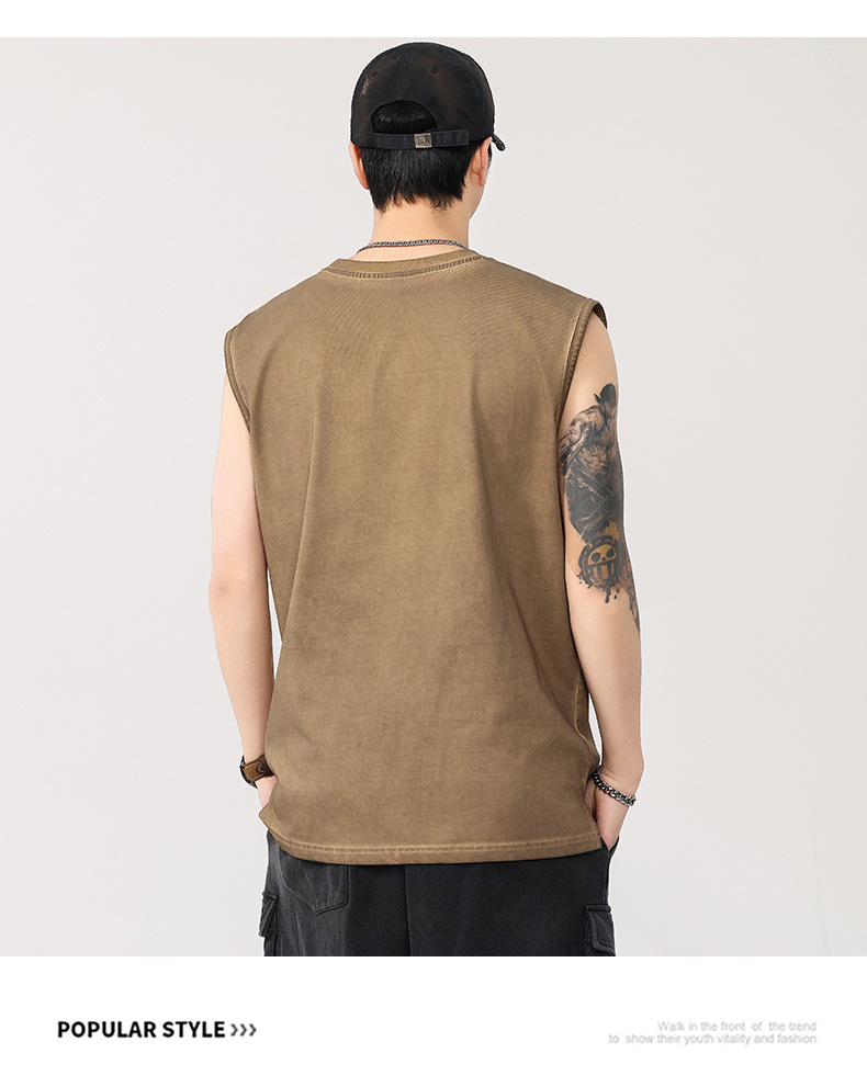 T3970 | 플러스 사이즈 남성 여름 새로운 미국 복고풍 민소매 조끼 느슨한 튀김 컬러 더러운 세척 인쇄 티셔츠 남성스토어 가기