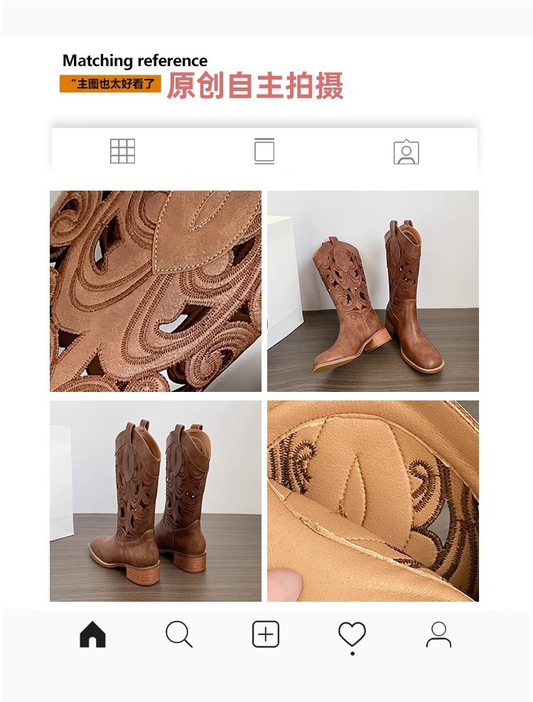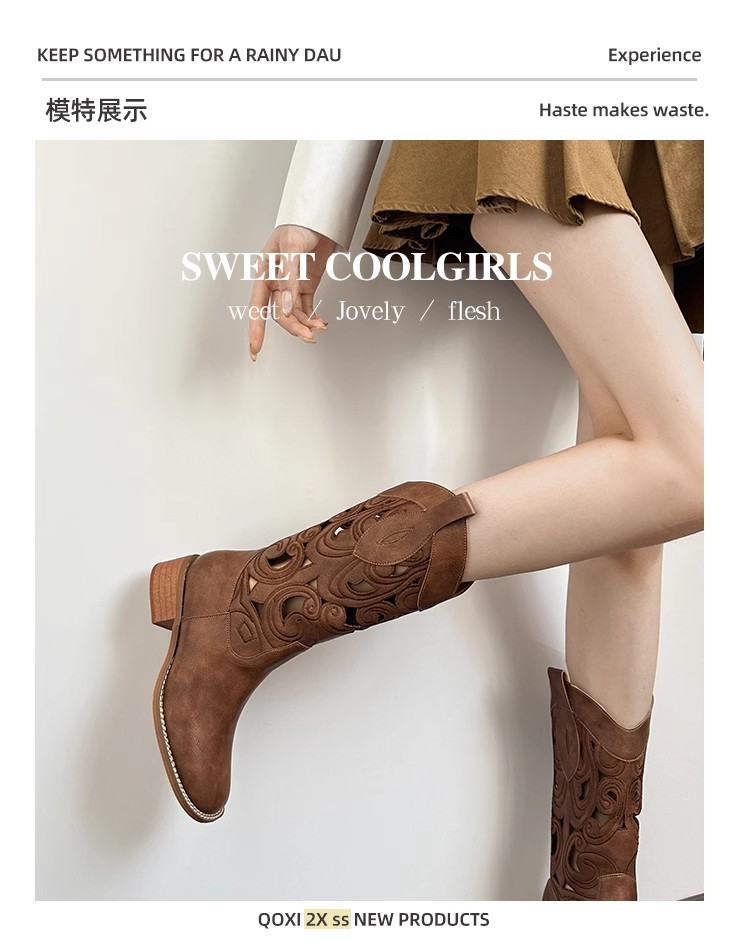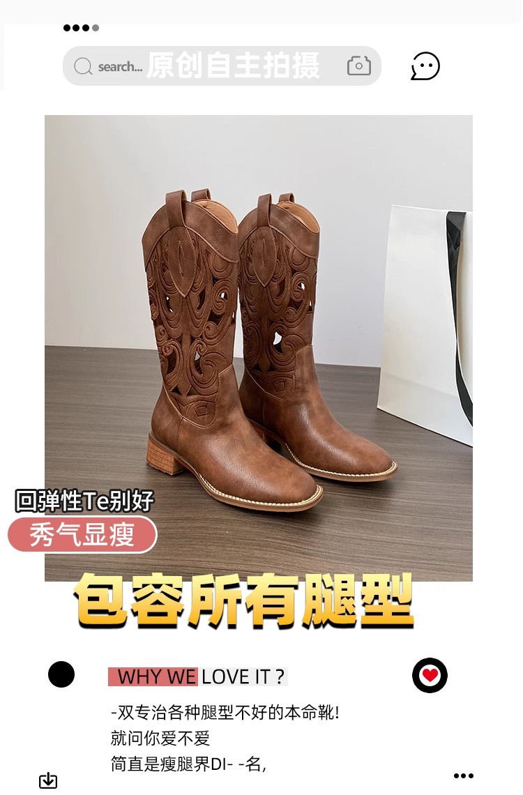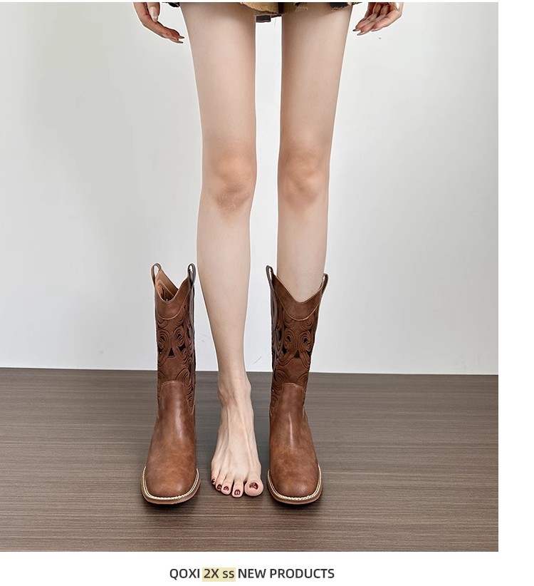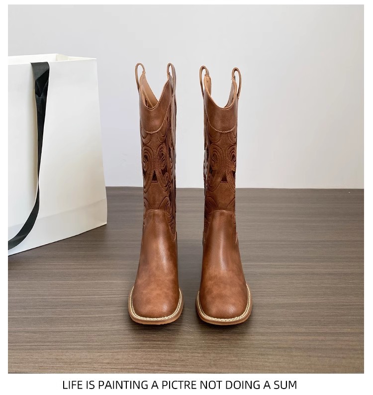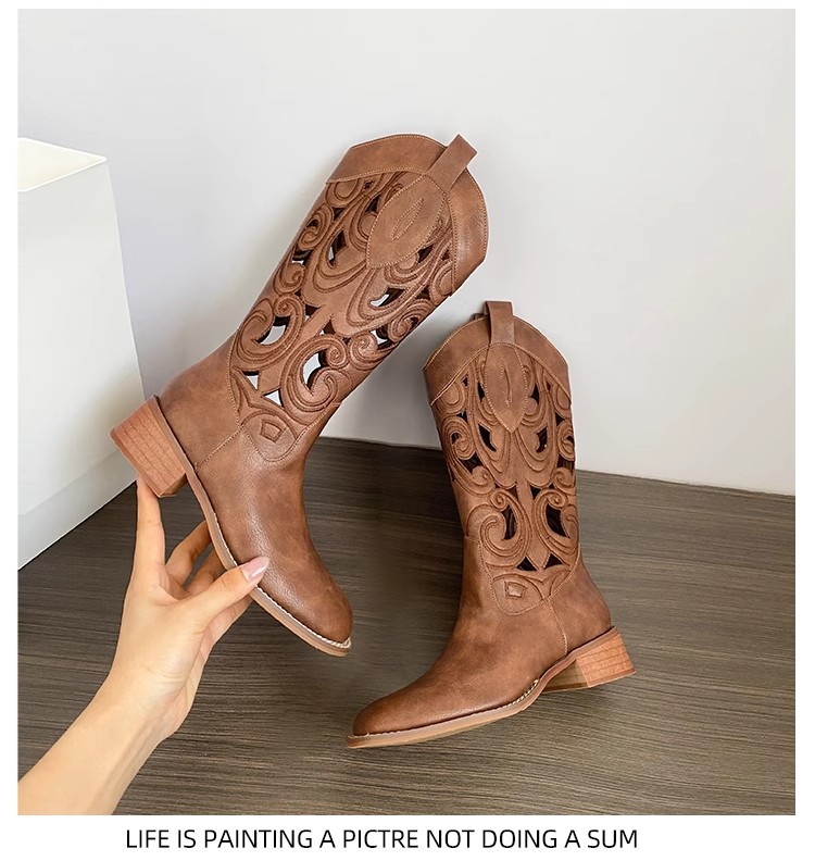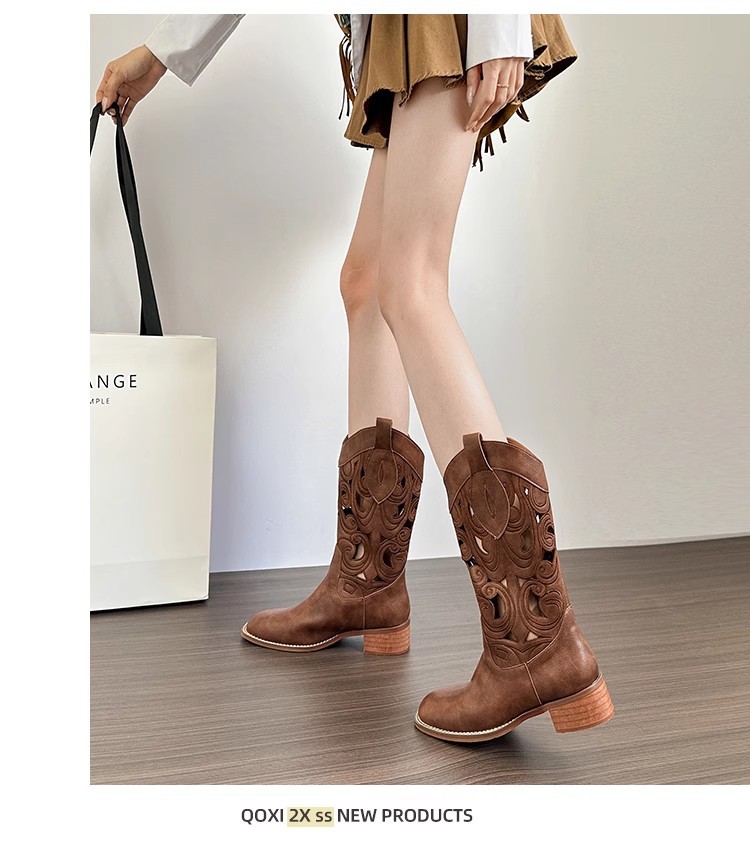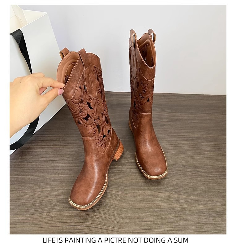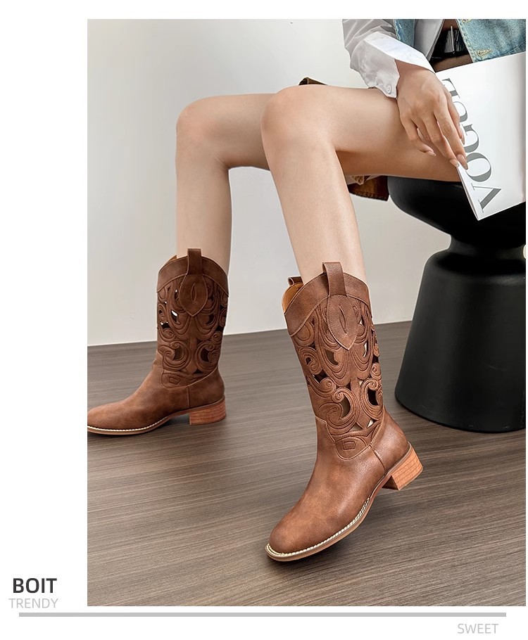 여성을위한 갈색 복고풍 서양 카우보이 부츠 2025 새로운 중공 튜브 부츠 수 놓은 기사 부츠 두꺼운 굽 마틴 부츠스토어 가기