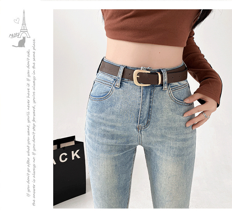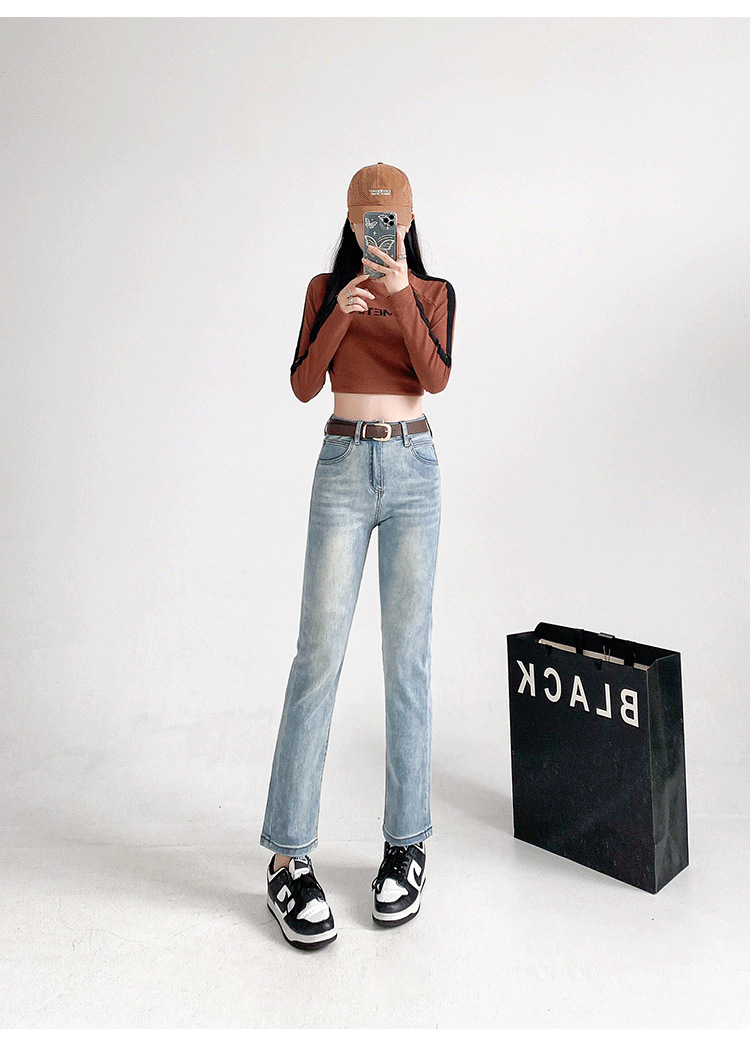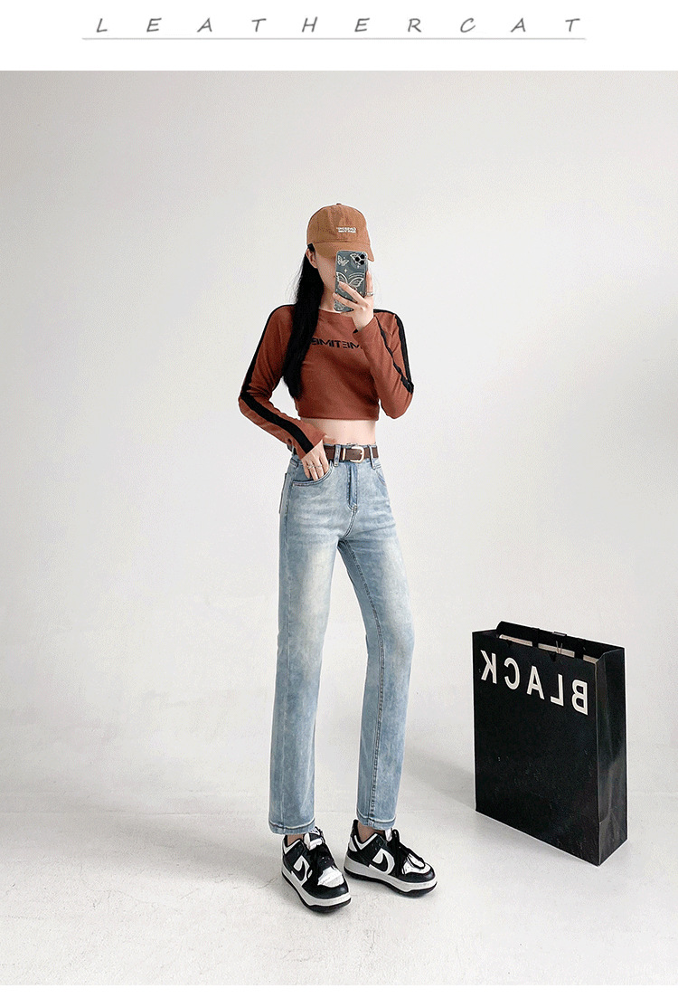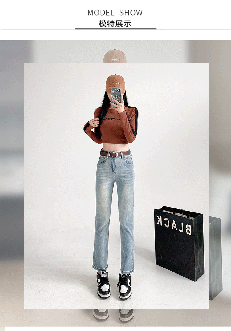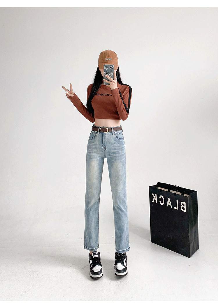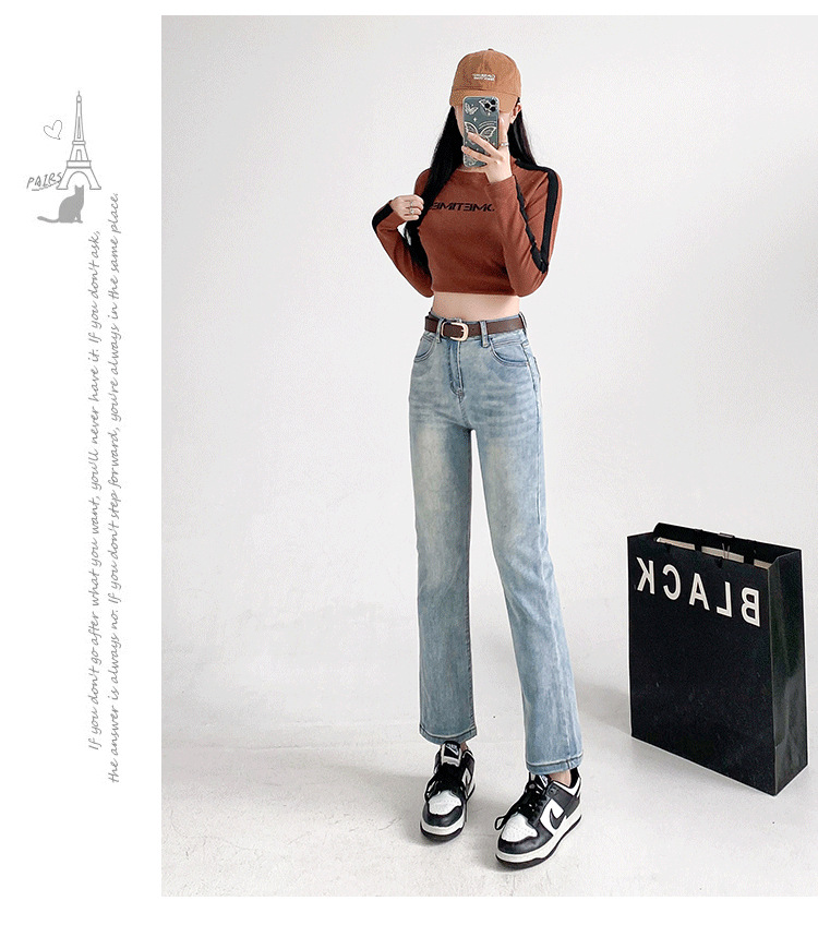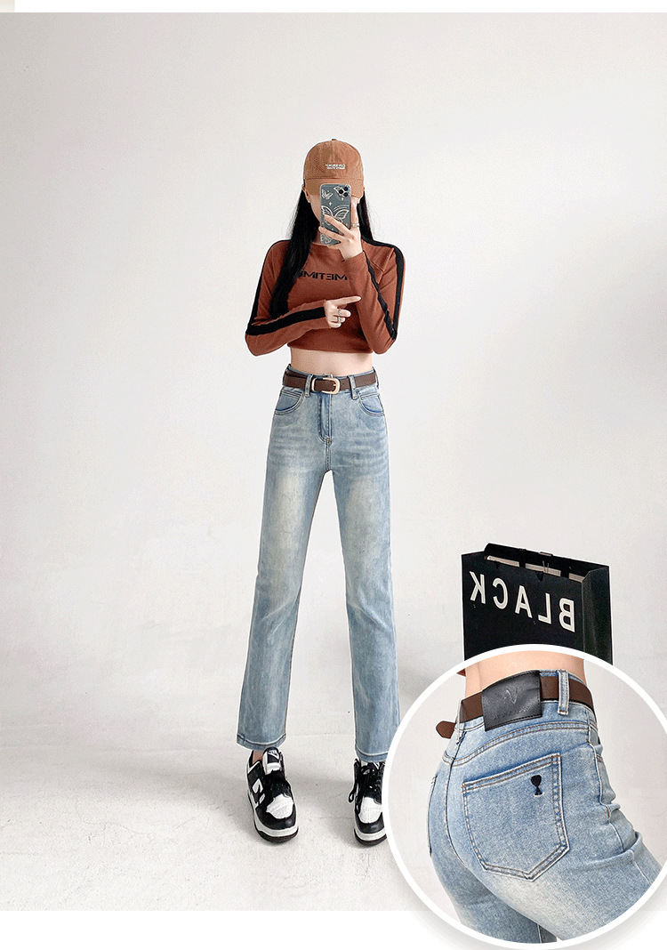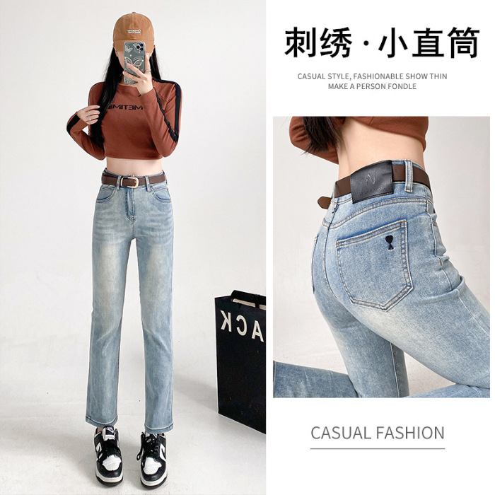 자수 레트로 하이웨이스트 스트레이트 데님 팬츠 여성 2025 봄 신상품 작은 키 여성을 위한 9부 슬림핏 스모크 파이프 팬츠스토어 가기