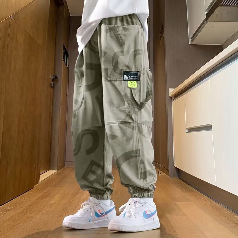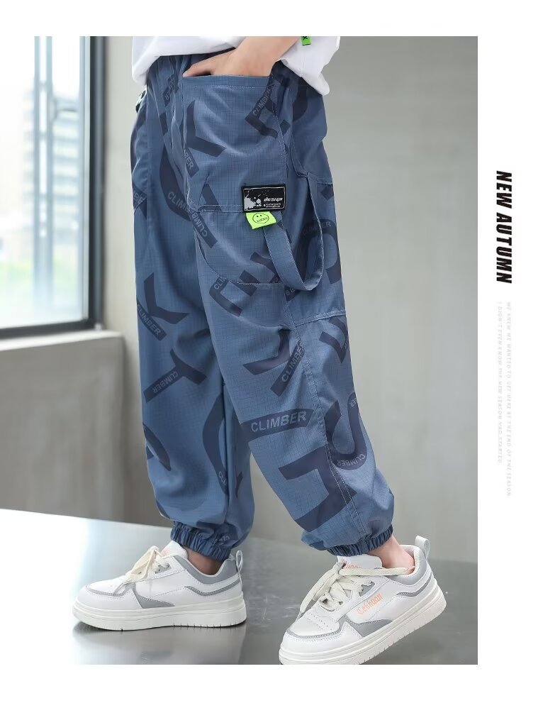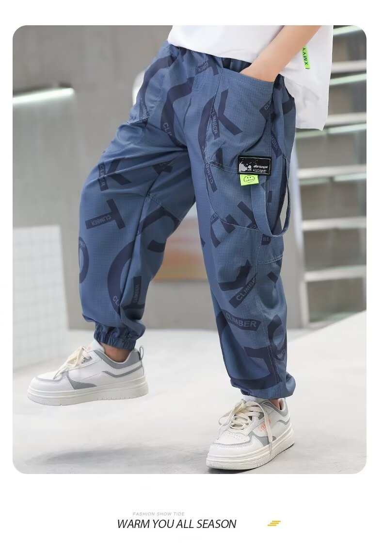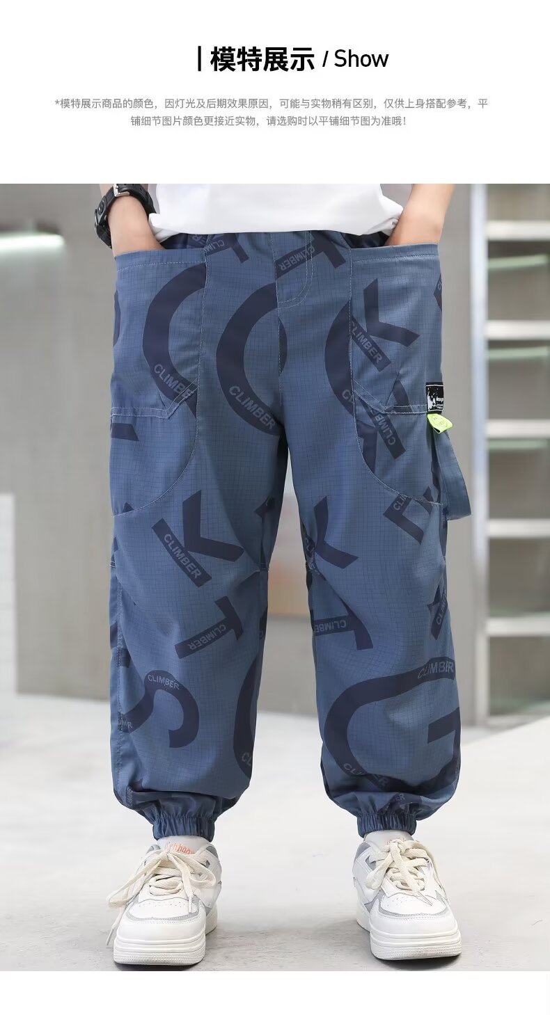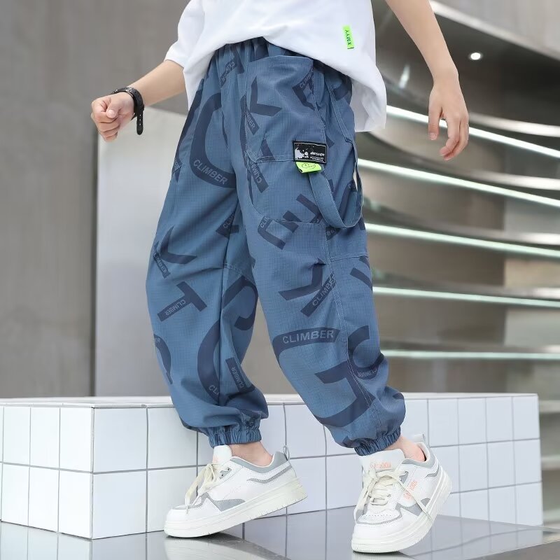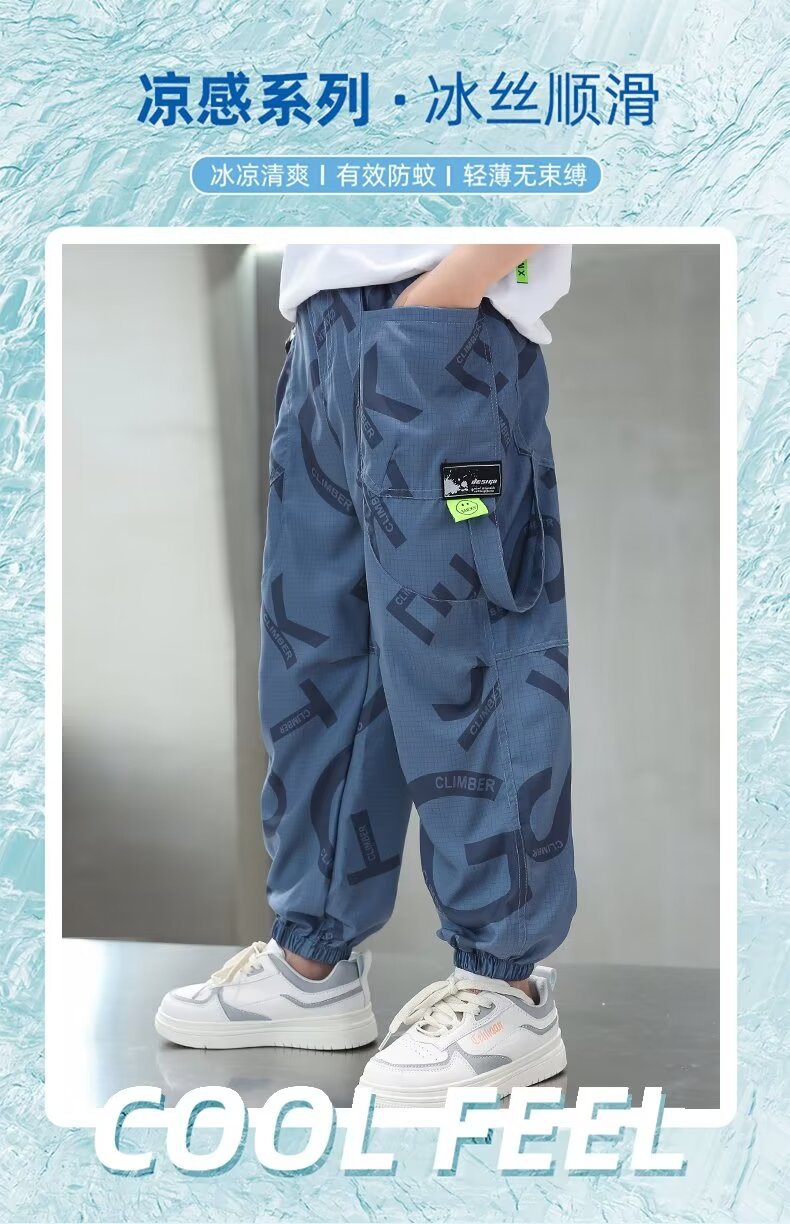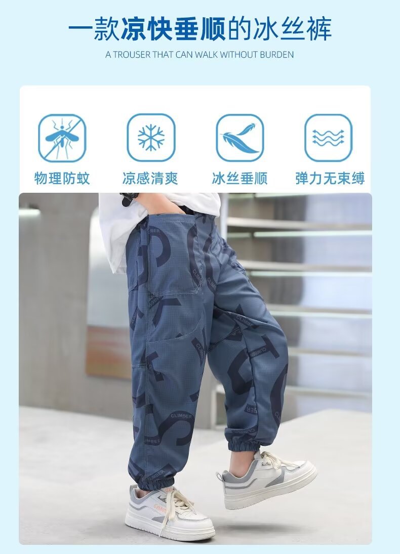 남학생 바지 여름 얇은 새 유행 어린이 여름 아이스 실크 빠른 건조 방지 모기 바지 남자 야외 작업복 스포츠 바지