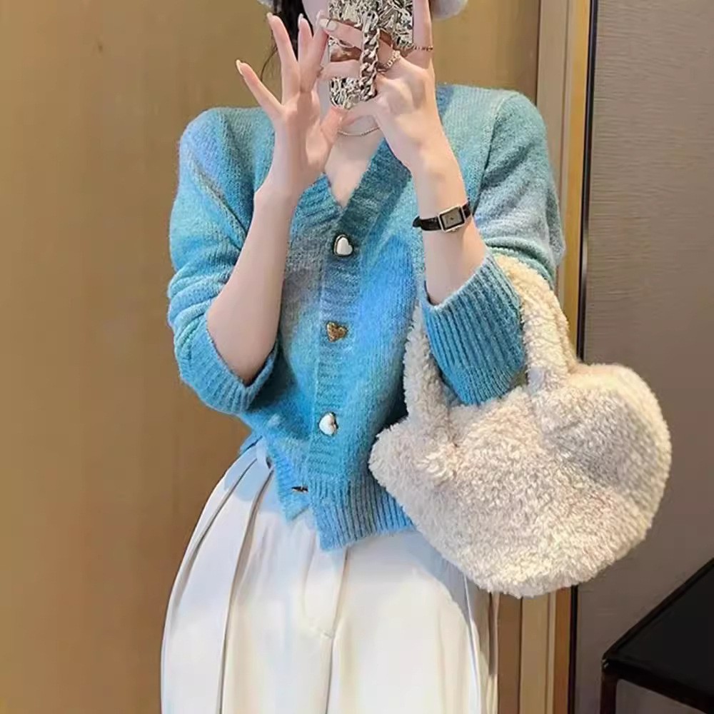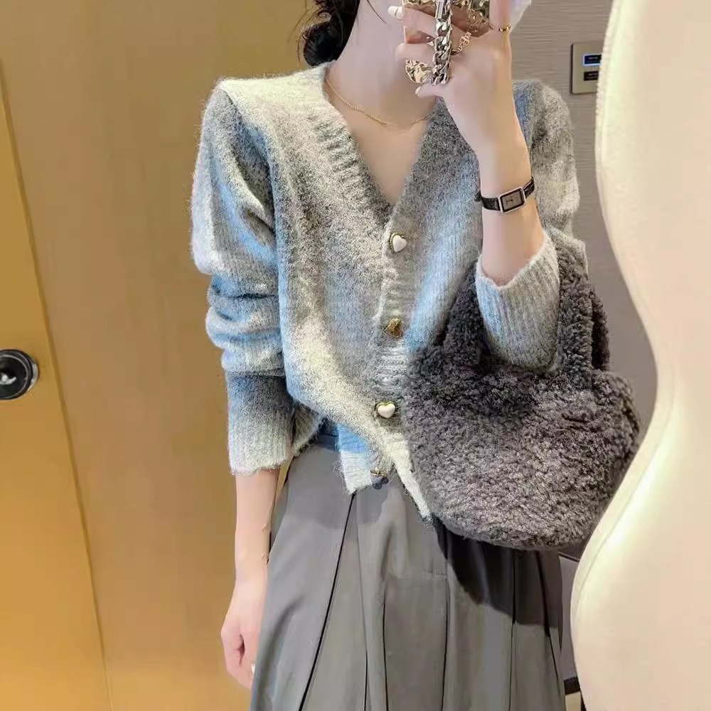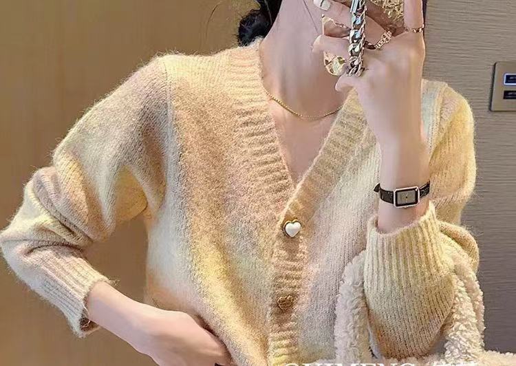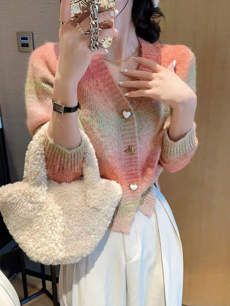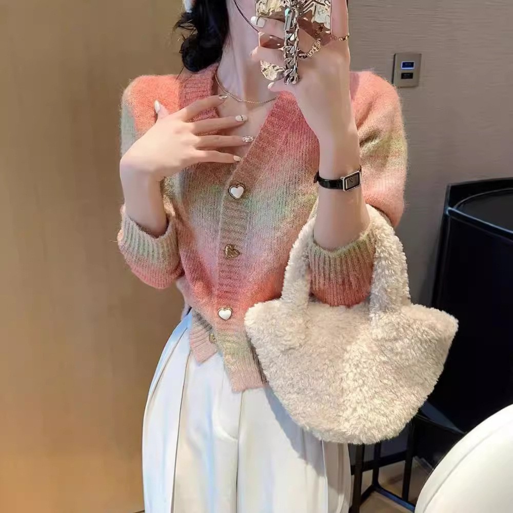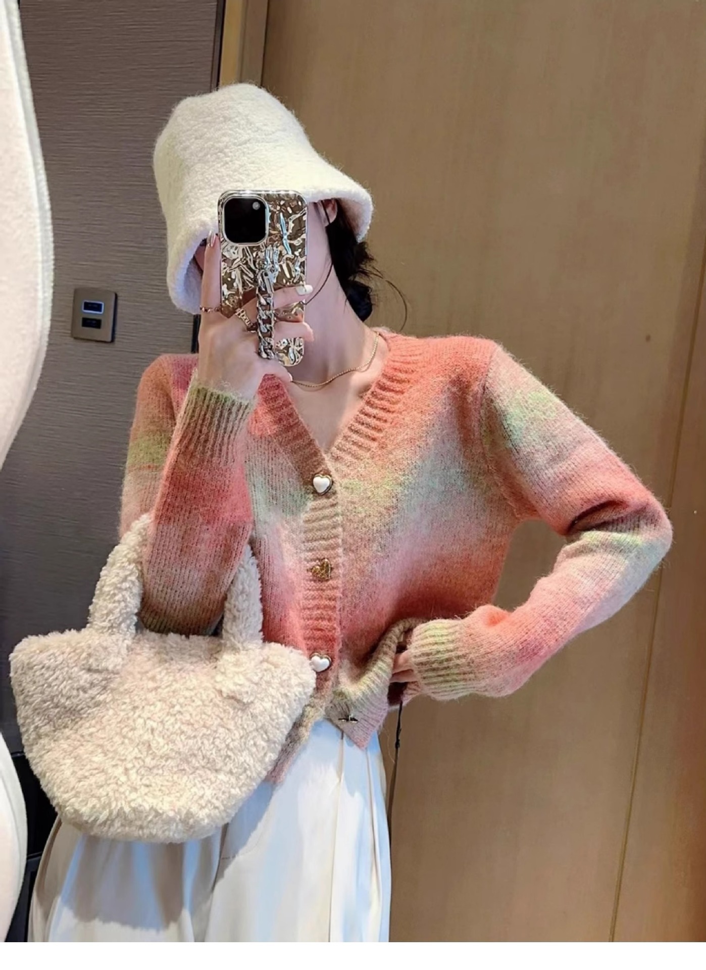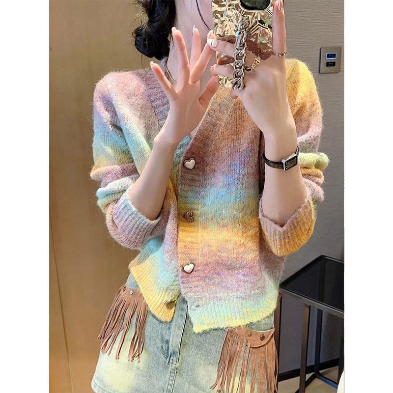 여성을위한 그라디언트 캔디 컬러 니트 카디건 2025 봄 우유 스타일 게으른 스타일 레인보우 부드러운 밀랍 스웨터 여성을위한 느슨한 코트스토어 가기