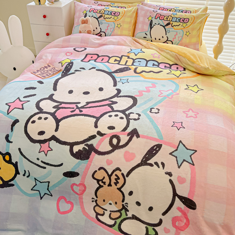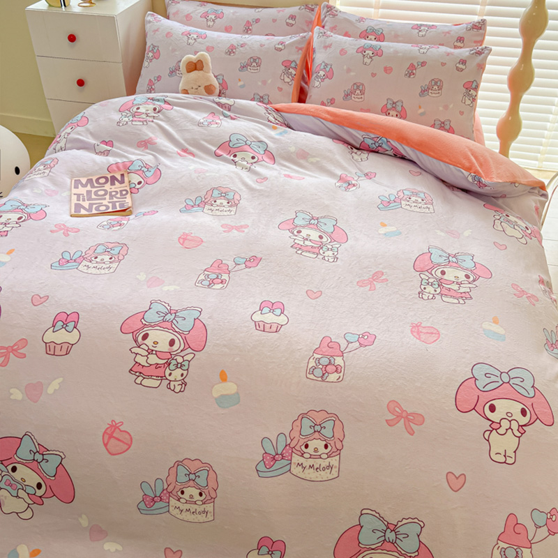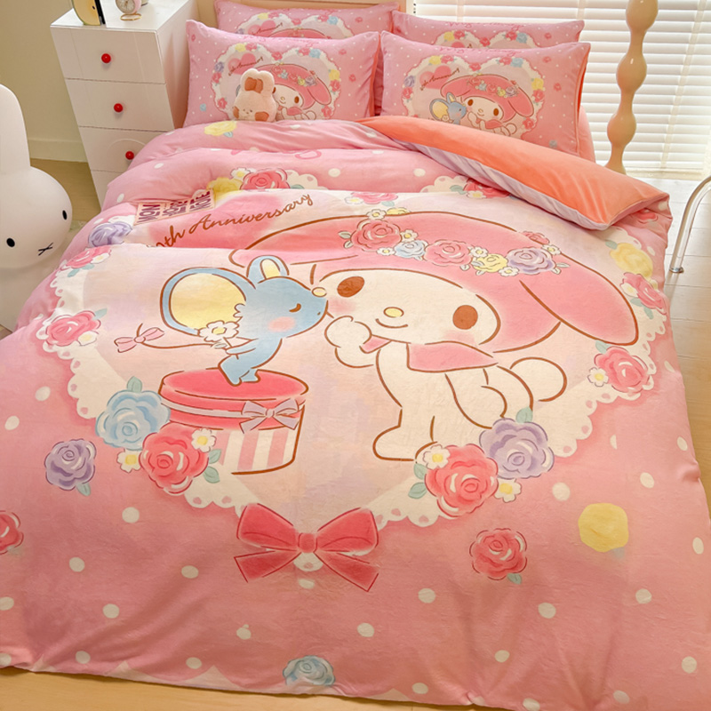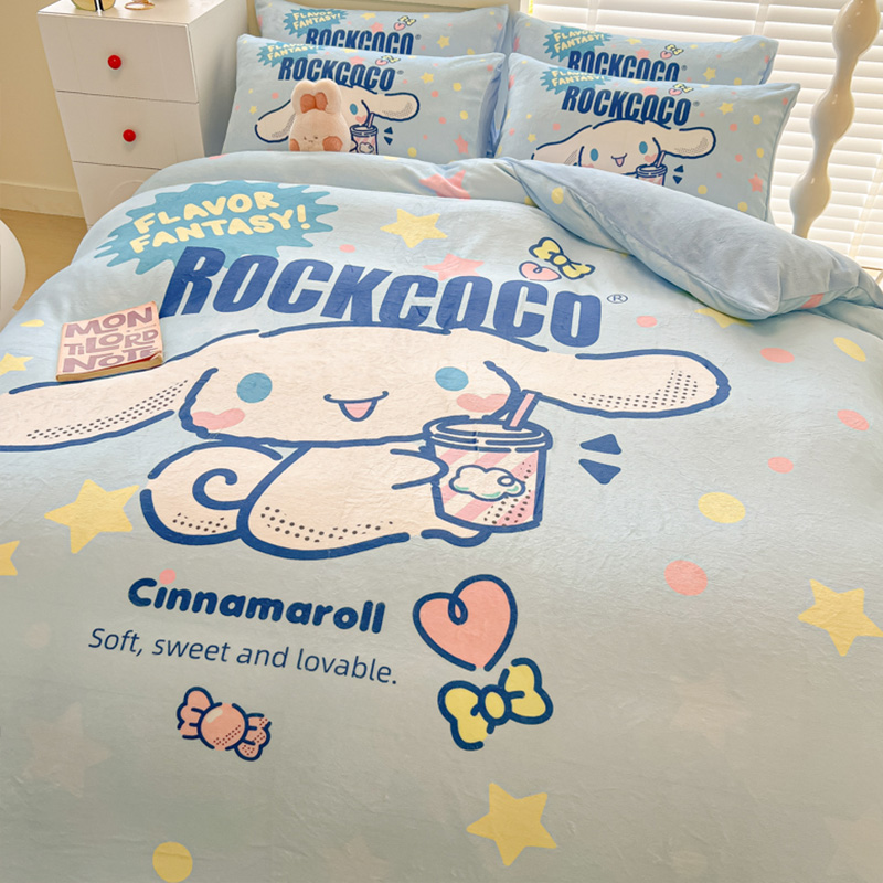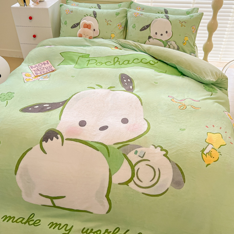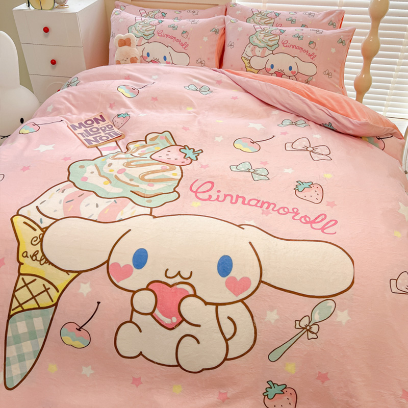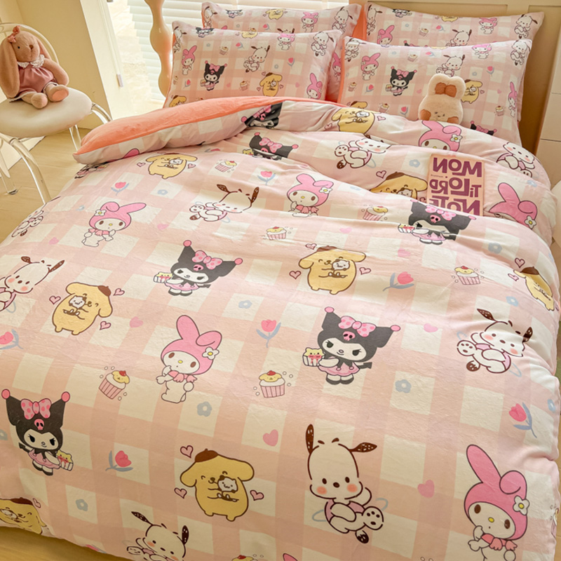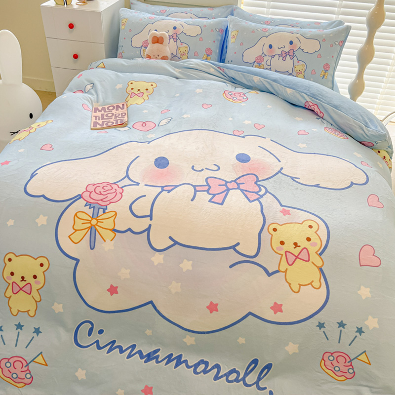 Sanrio 양면 두꺼운 우유 벨벳 침대 4피스 겨울 만화 어린이 이불 커버 침대 싱글 플러스 벨벳 침구스토어 가기