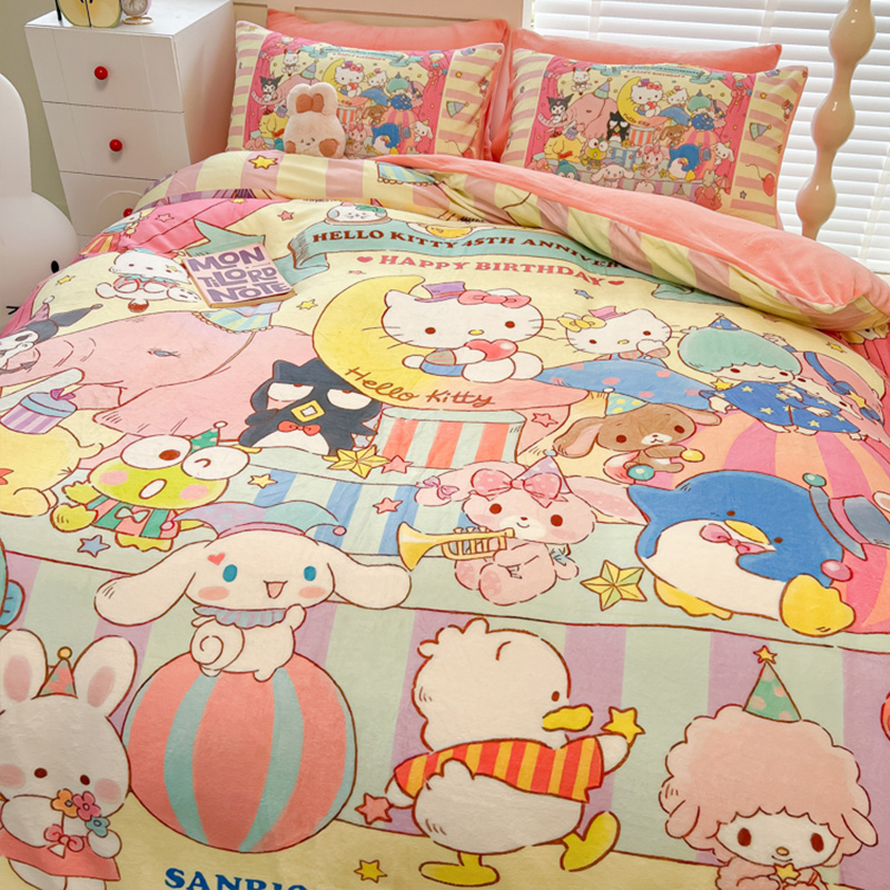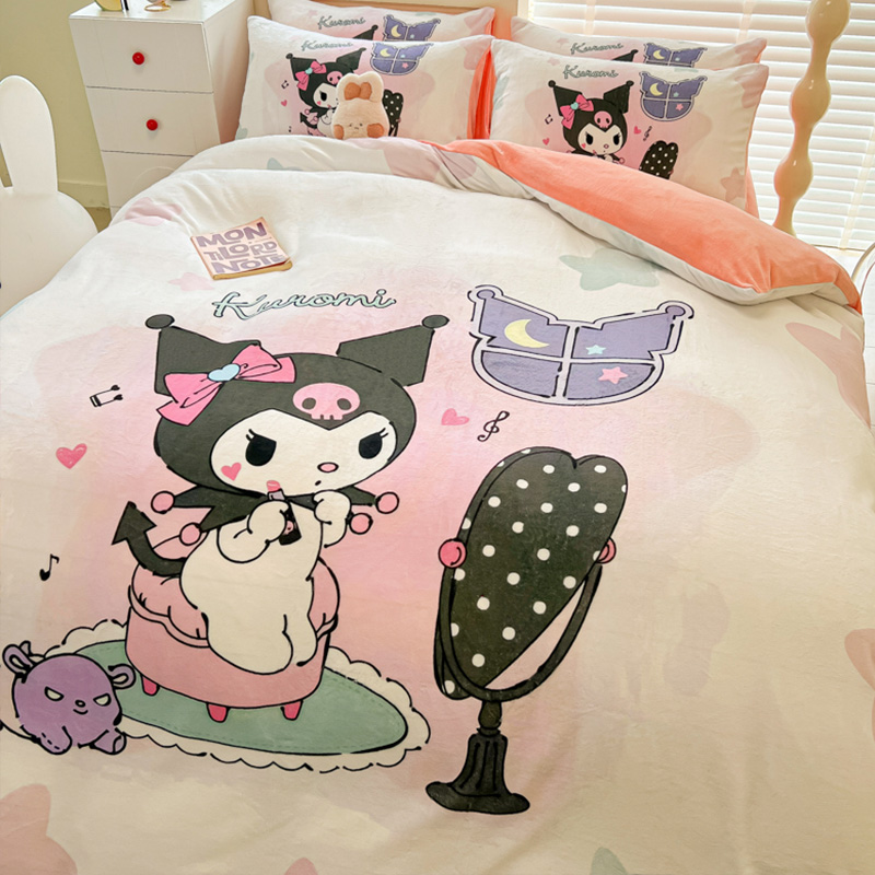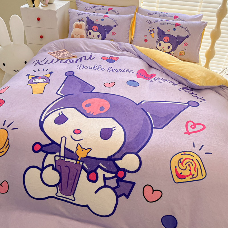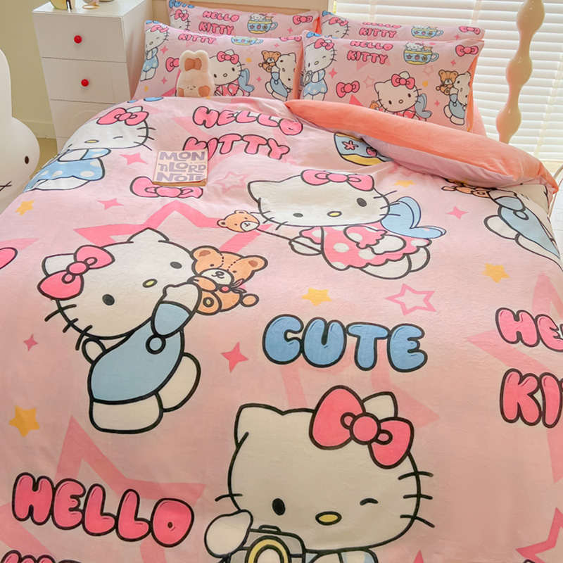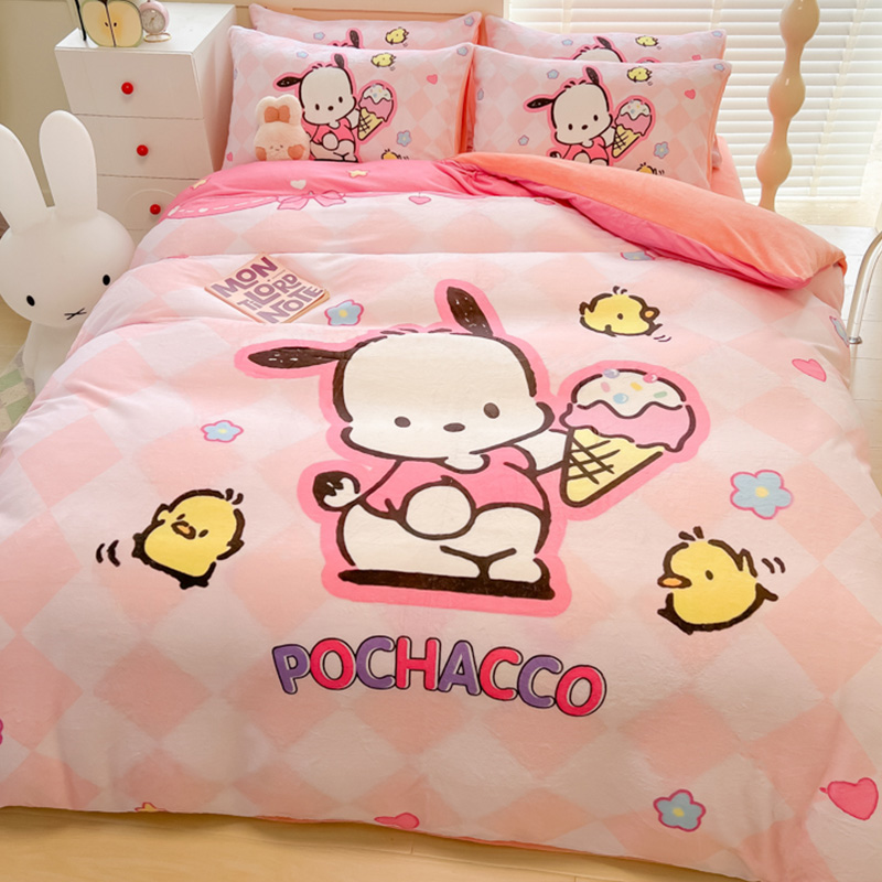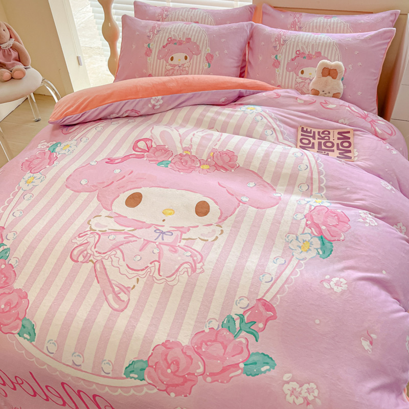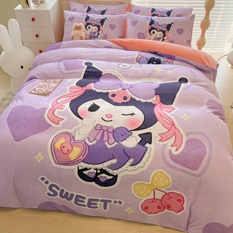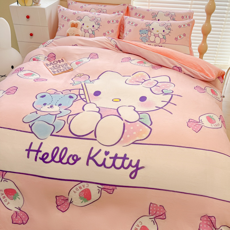 Sanrio 양면 두꺼운 우유 벨벳 침대 4피스 겨울 만화 어린이 이불 커버 침대 싱글 플러스 벨벳 침구스토어 가기