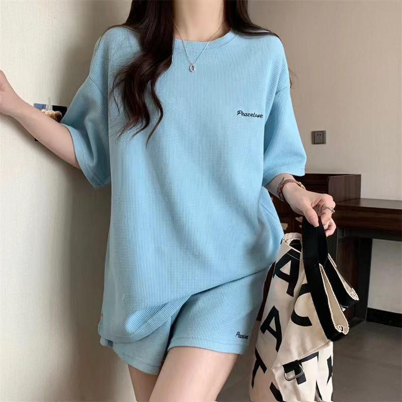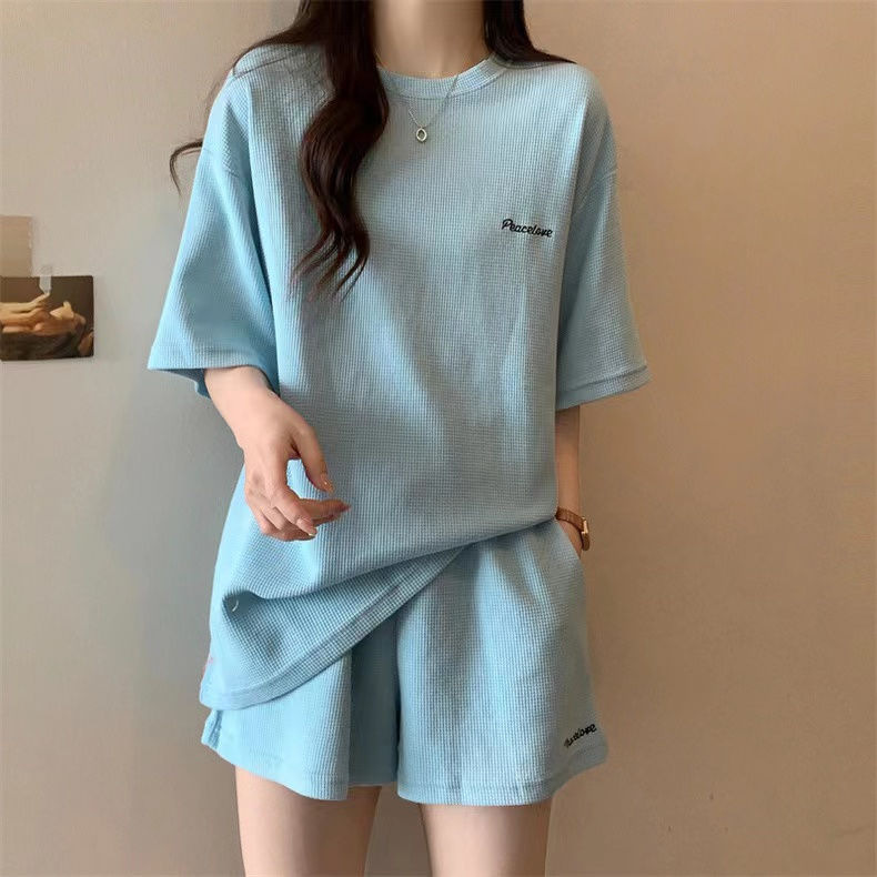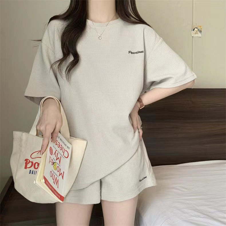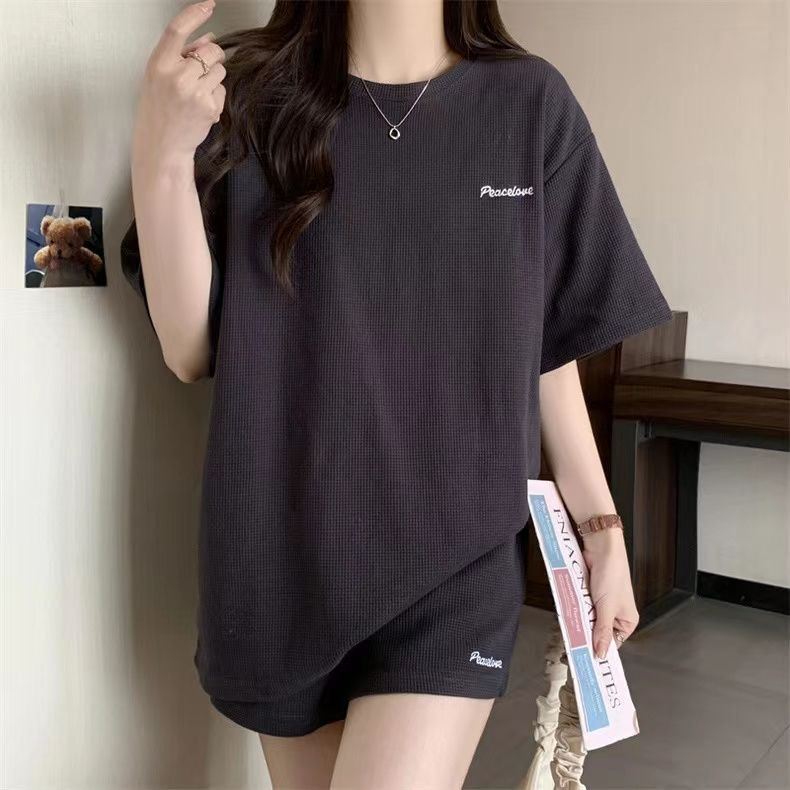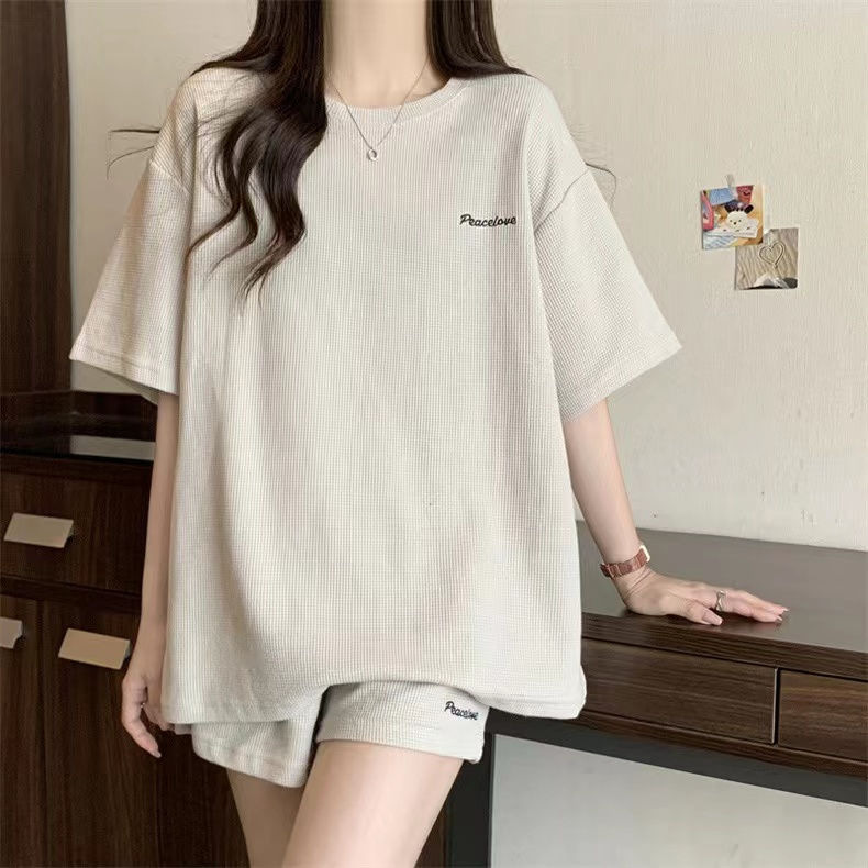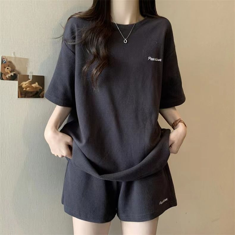 와플 운동복 세트 여자 2025 여름 한국식 느슨한 패셔너블 반팔 학생 달리기 캐주얼 투피스 세트스토어 가기