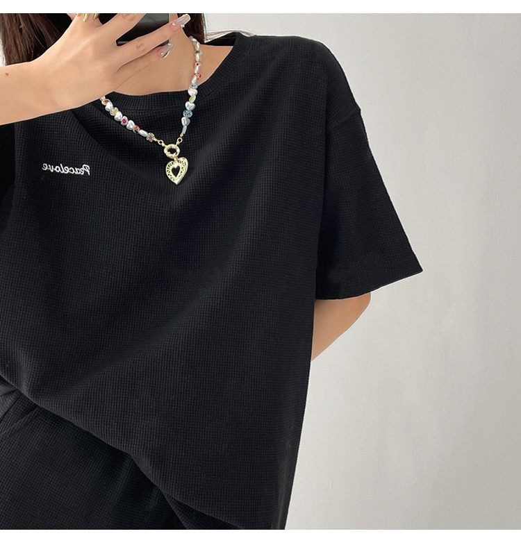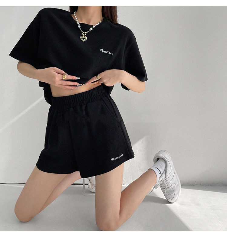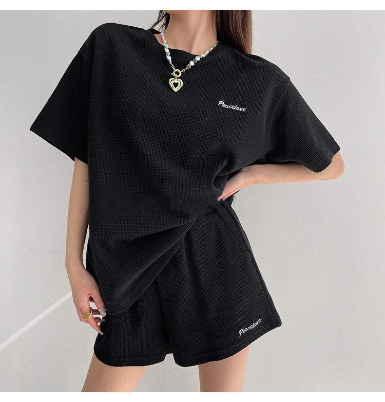 와플 운동복 세트 여자 2025 여름 한국식 느슨한 패셔너블 반팔 학생 달리기 캐주얼 투피스 세트