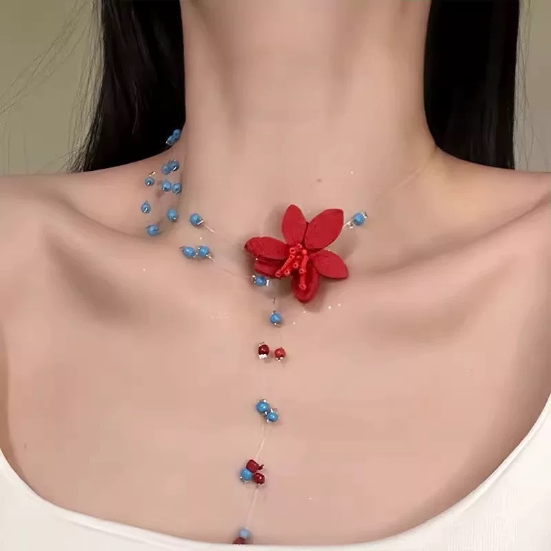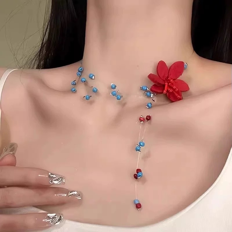 새로운 도파민 블루 구슬 꽃 목걸이 대비 높은 감각 쇄골 체인 달콤한 패션 성격 목걸이 여성