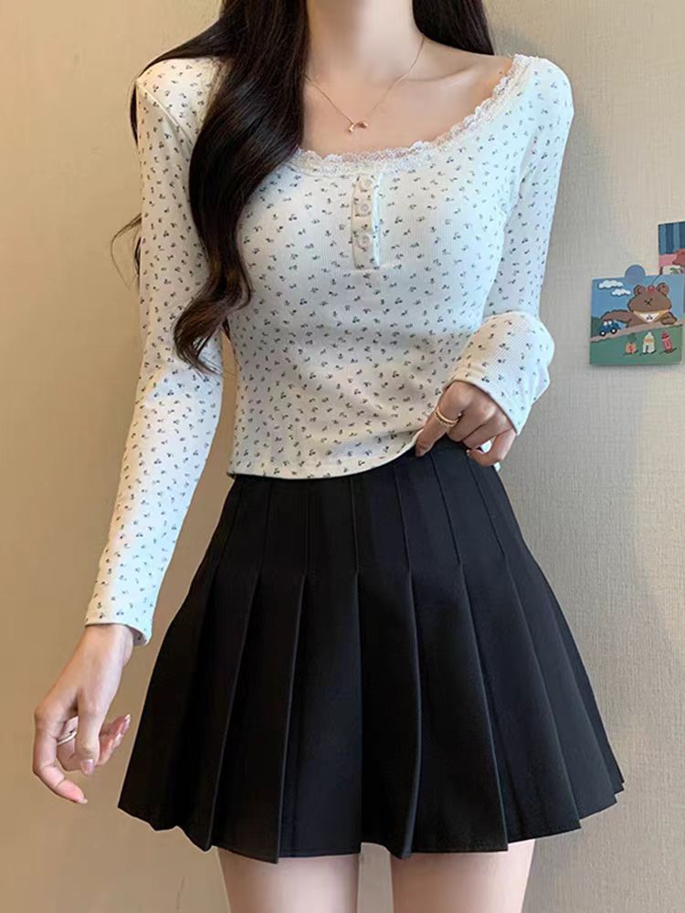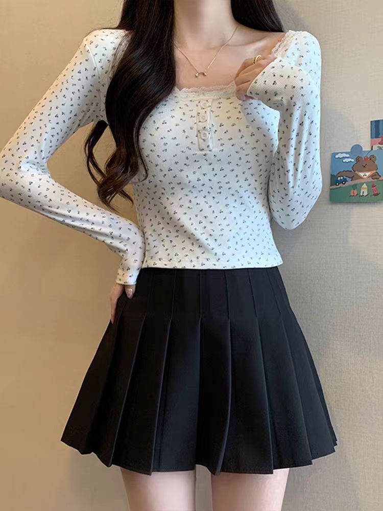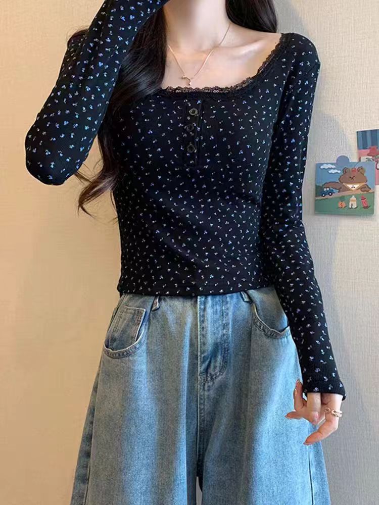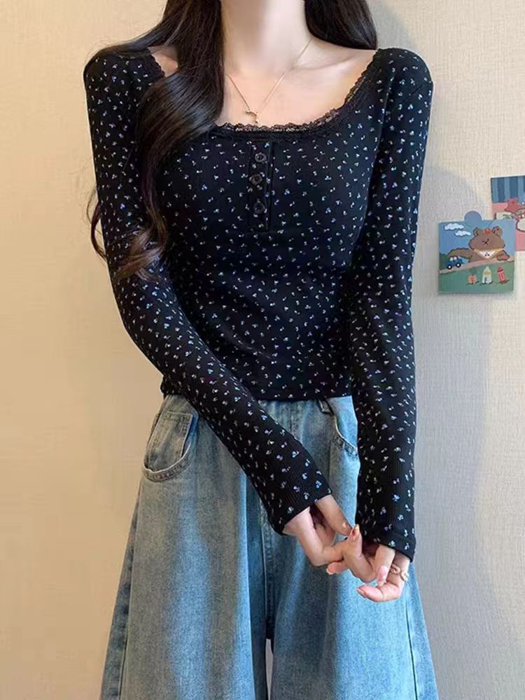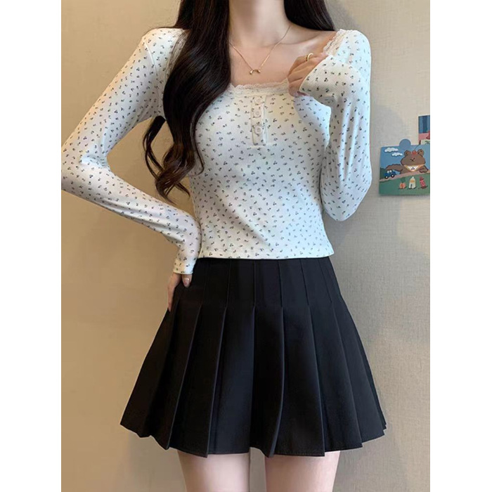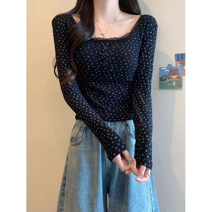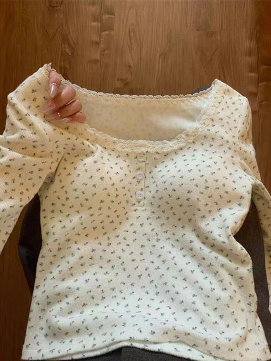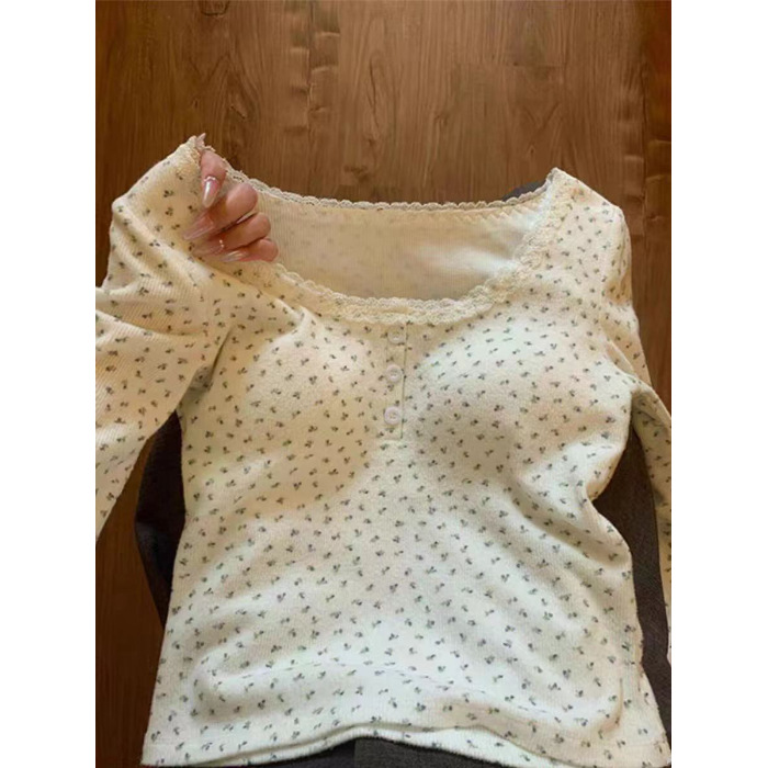 U-넥 레이스 벨트 가슴 패드 티셔츠 여성용 긴팔 가을과 겨울베이스 셔츠 따뜻한 내부 퓨어 레이스 핫 걸 쇼트 탑