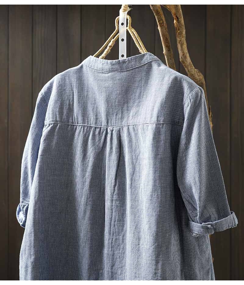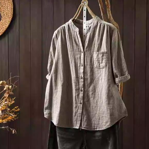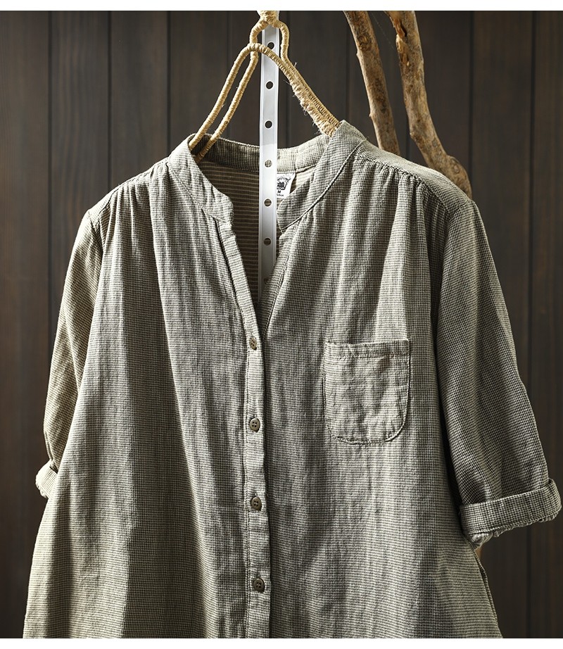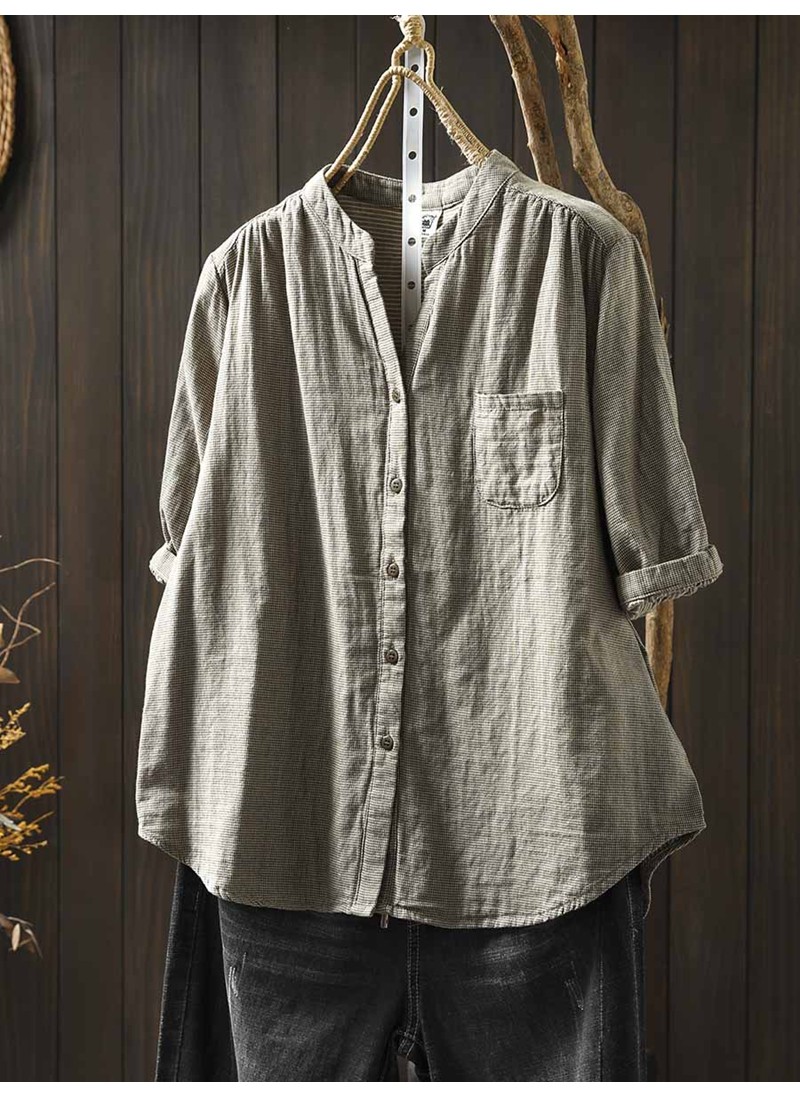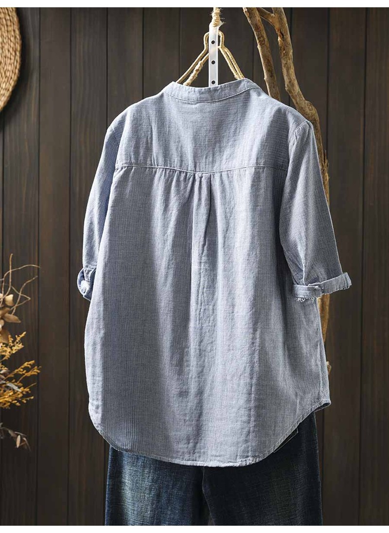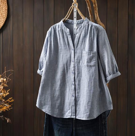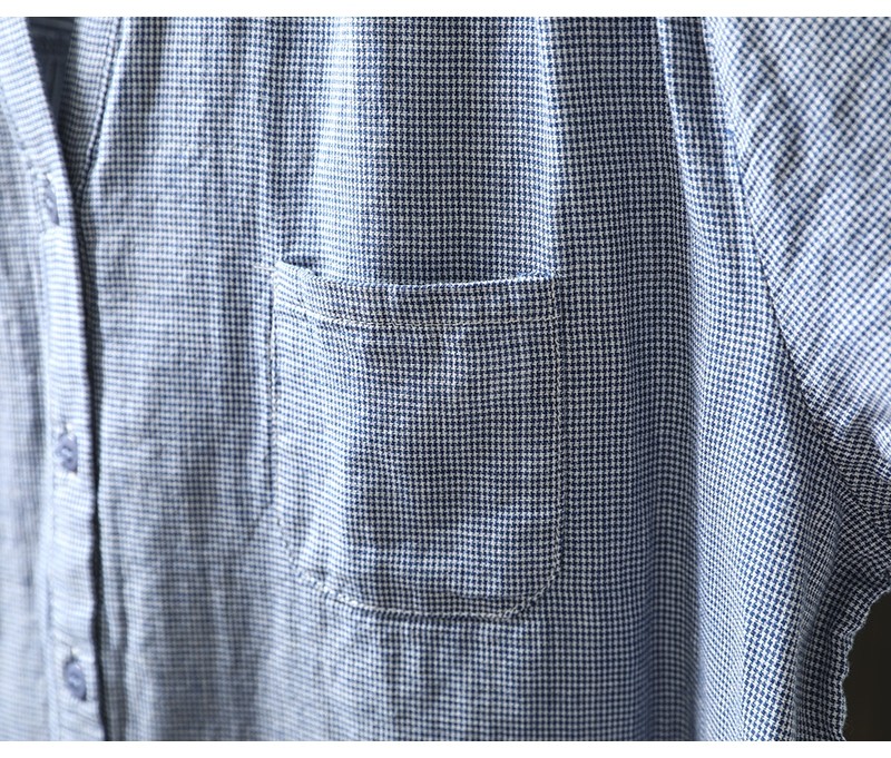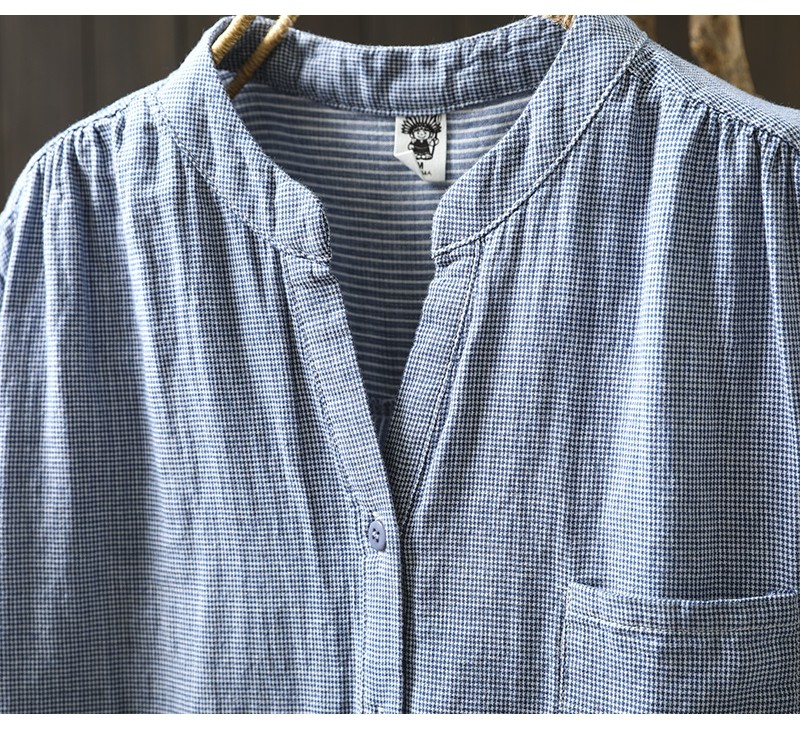 작은 V-칼라 Houndstooth 블루 셔츠 여성용 반 소매 2025 새로운 여름 느슨한 캐주얼 작은 우아한 탑스토어 가기