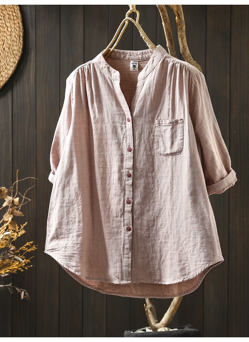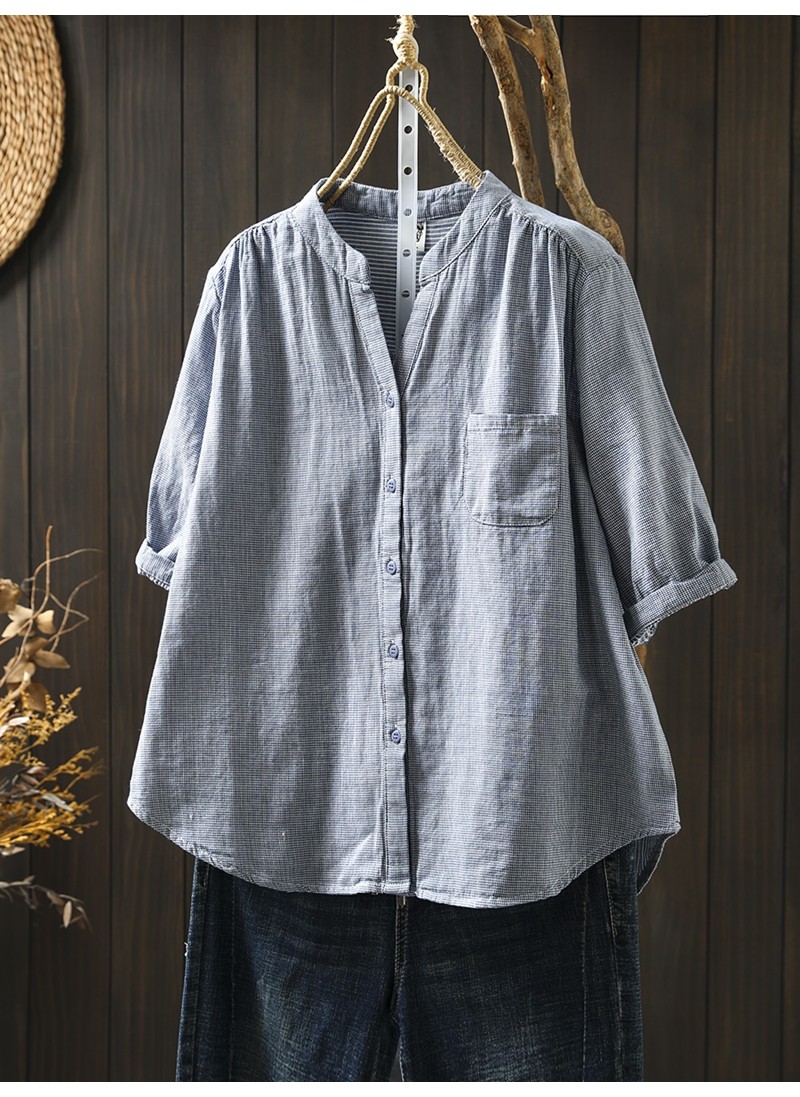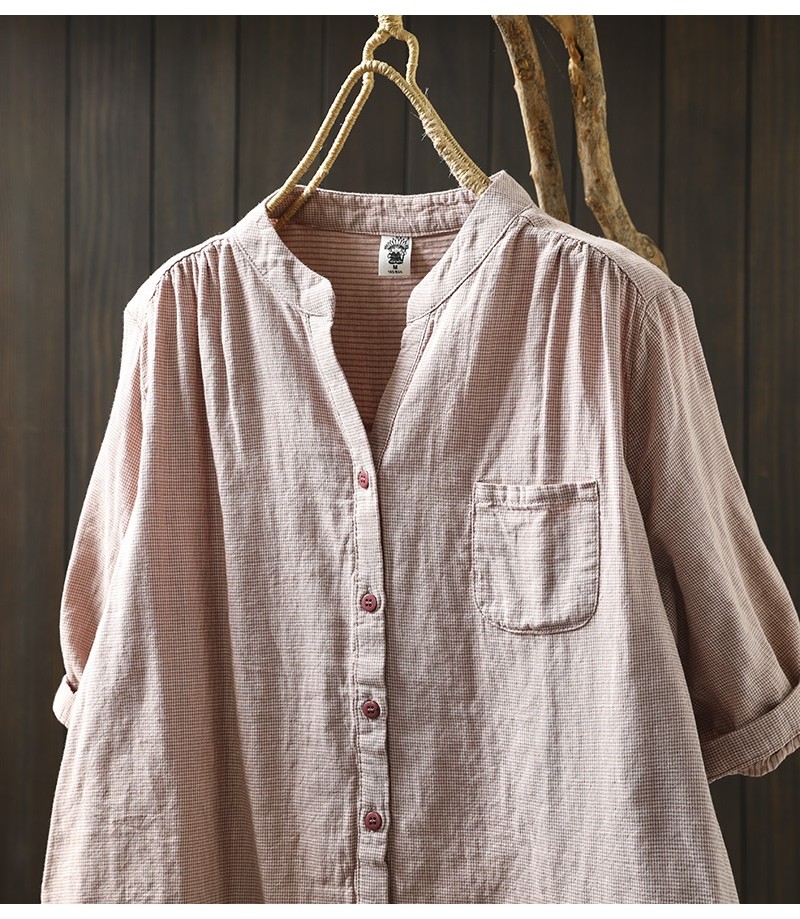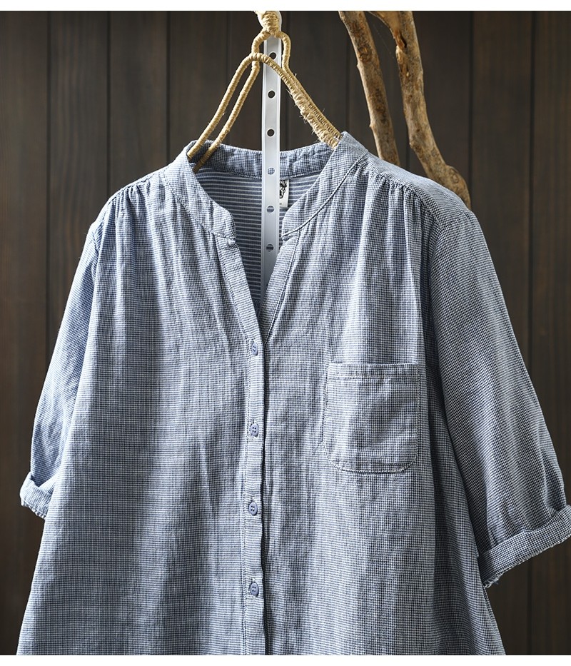 작은 V-칼라 Houndstooth 블루 셔츠 여성용 반 소매 2025 새로운 여름 느슨한 캐주얼 작은 우아한 탑