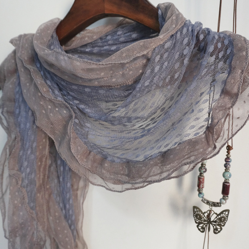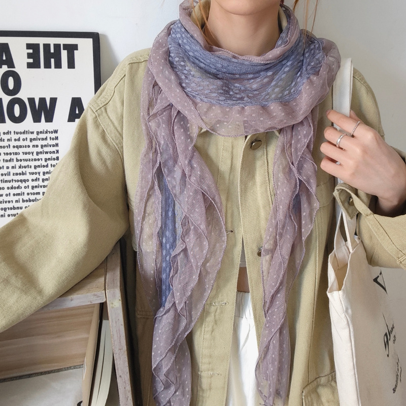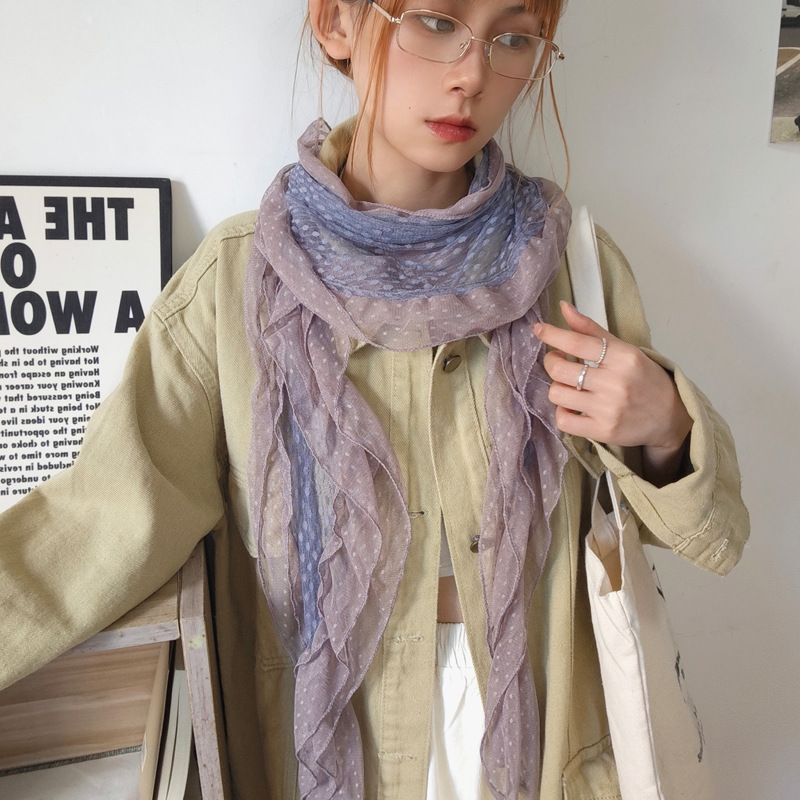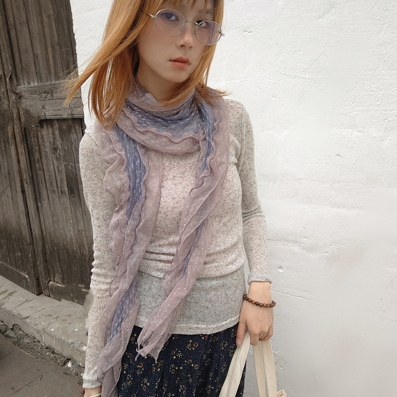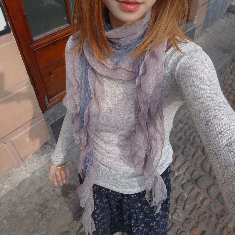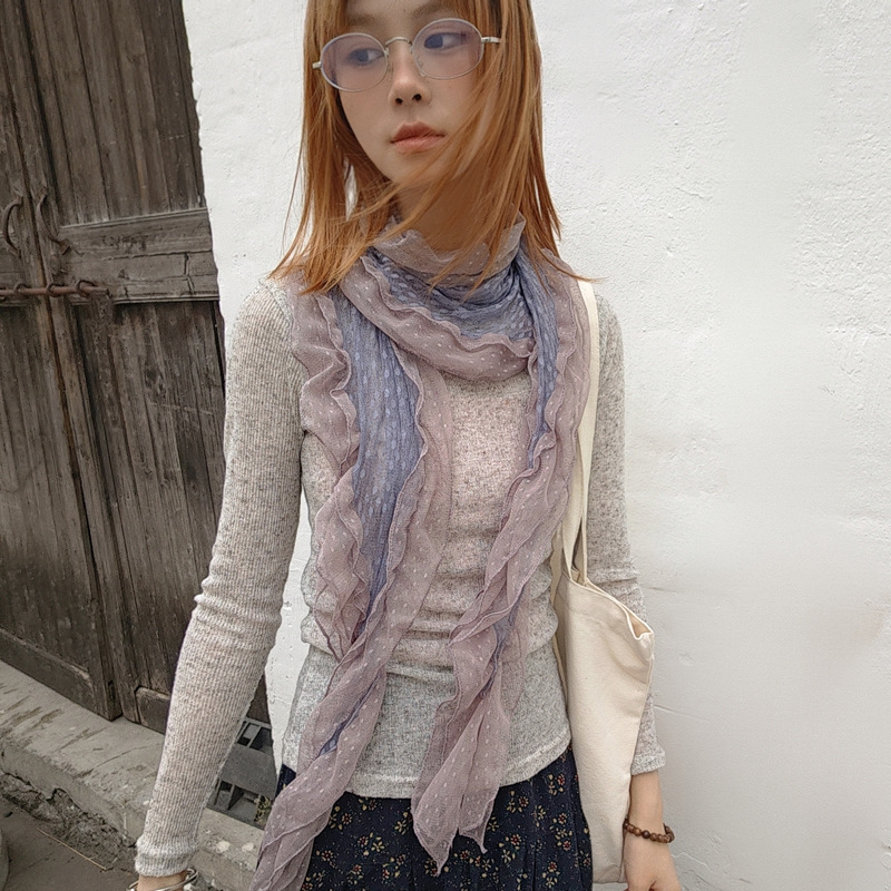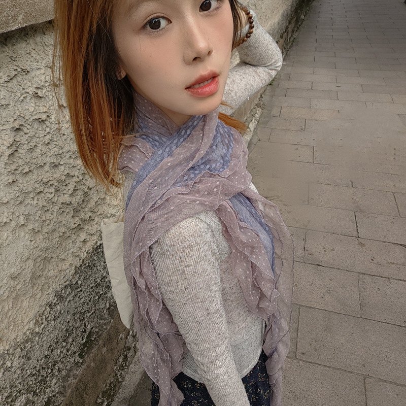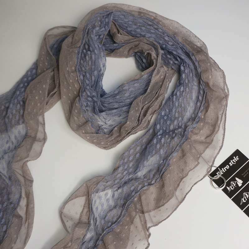 후지이 트리와 같은 스타일의 옛날 회색과 파란색 물방울 무늬 레이스 러플 스카프, 우아하고 분위기 있는 한국식 여성용 다용도 스카프스토어 가기