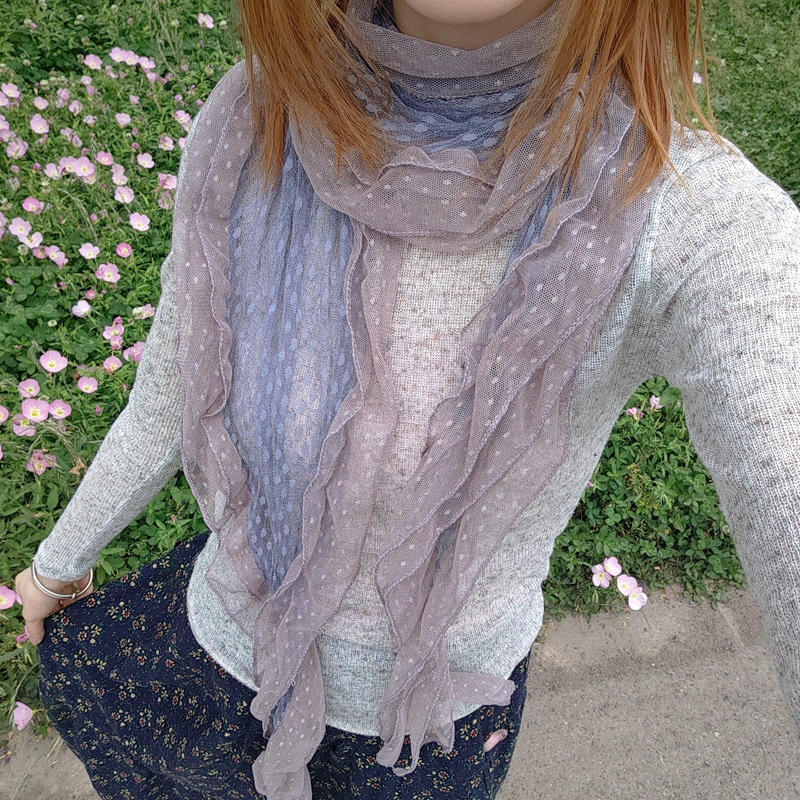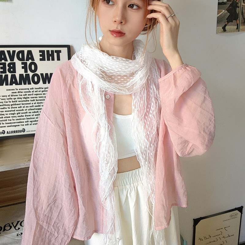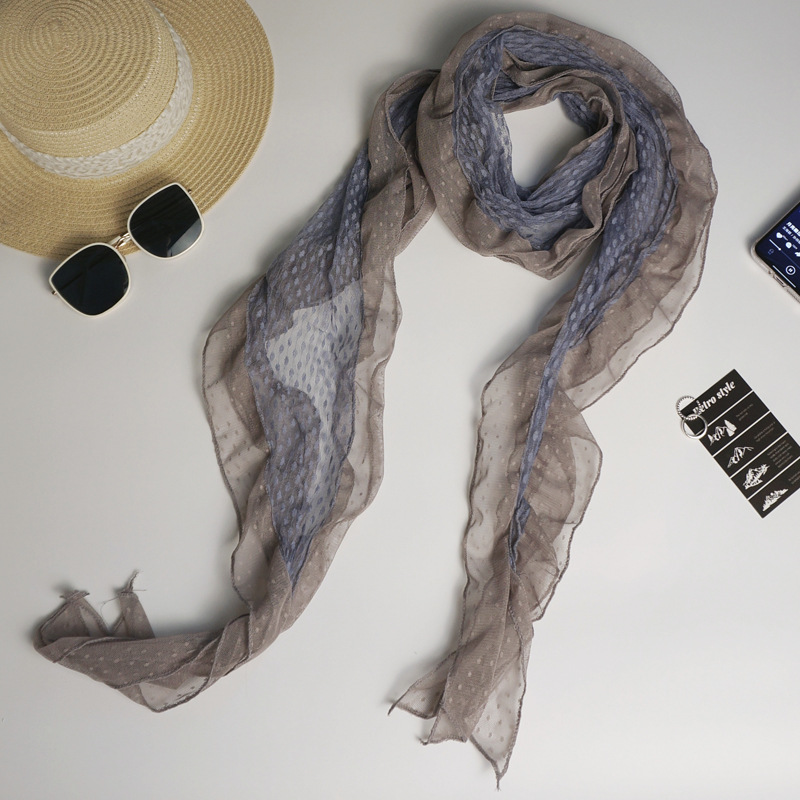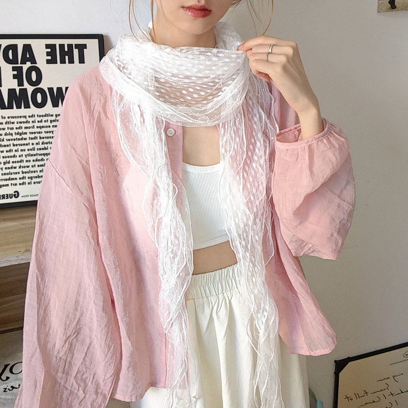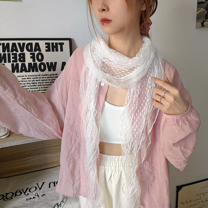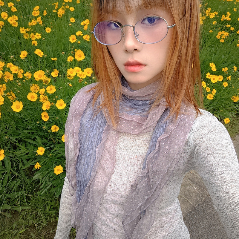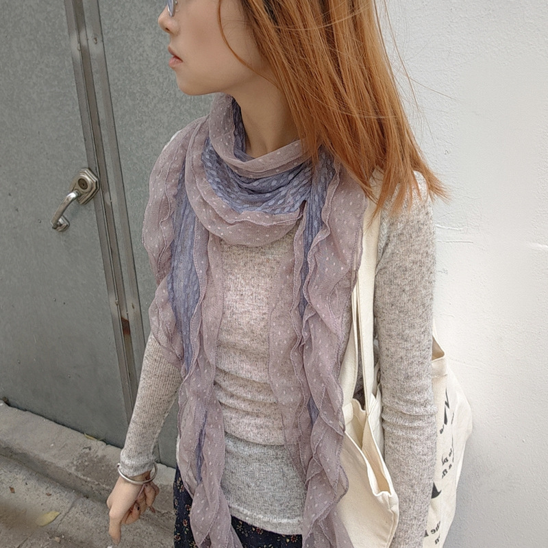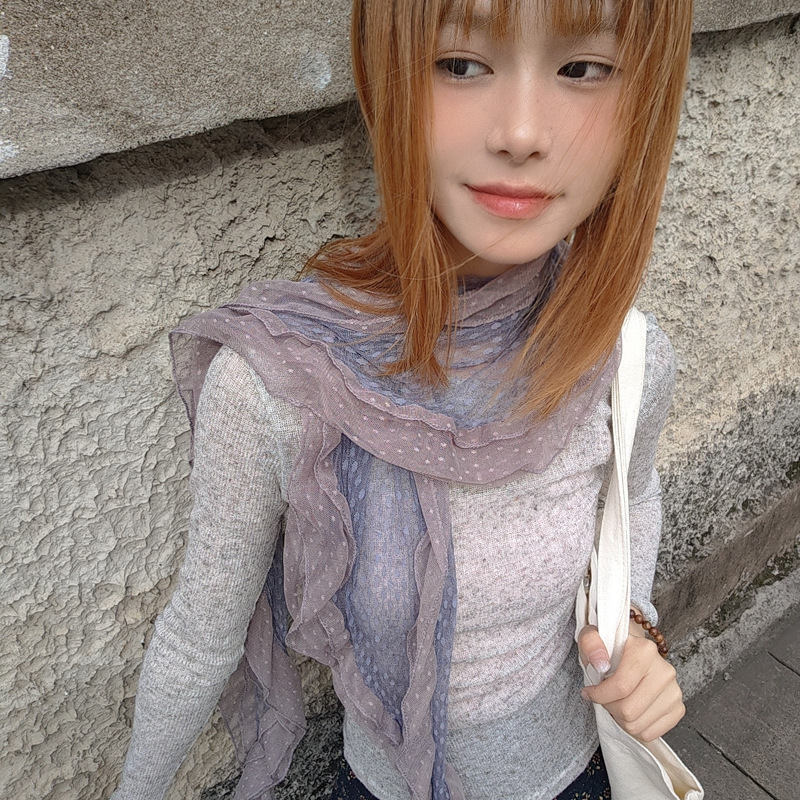 후지이 트리와 같은 스타일의 옛날 회색과 파란색 물방울 무늬 레이스 러플 스카프, 우아하고 분위기 있는 한국식 여성용 다용도 스카프스토어 가기