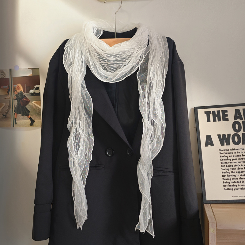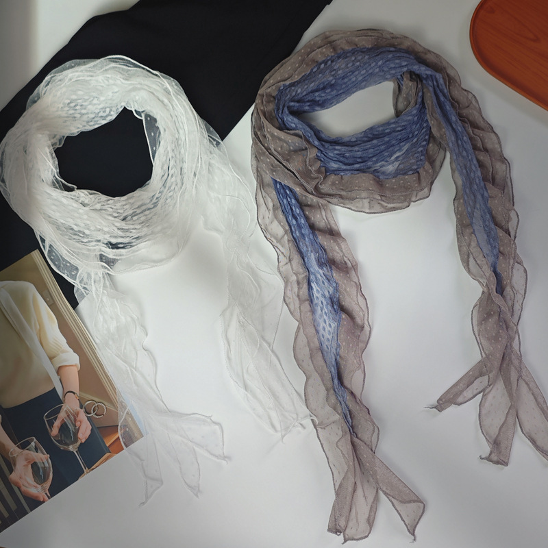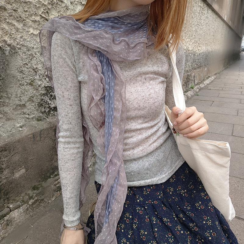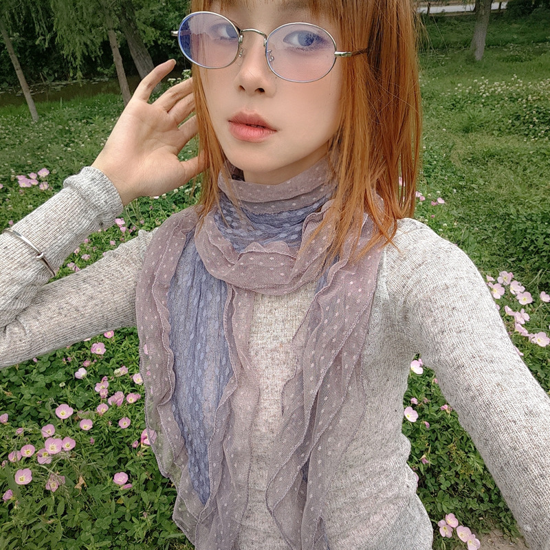 후지이 트리와 같은 스타일의 옛날 회색과 파란색 물방울 무늬 레이스 러플 스카프, 우아하고 분위기 있는 한국식 여성용 다용도 스카프