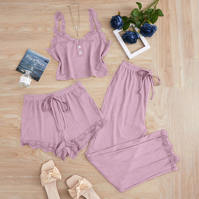 유럽 및 미국 해외 직수입 여름 여성용 신상 레이스 트리밍 골지 민소매 긴바지 잠옷 겸 외출복 슬림핏 3종 세트