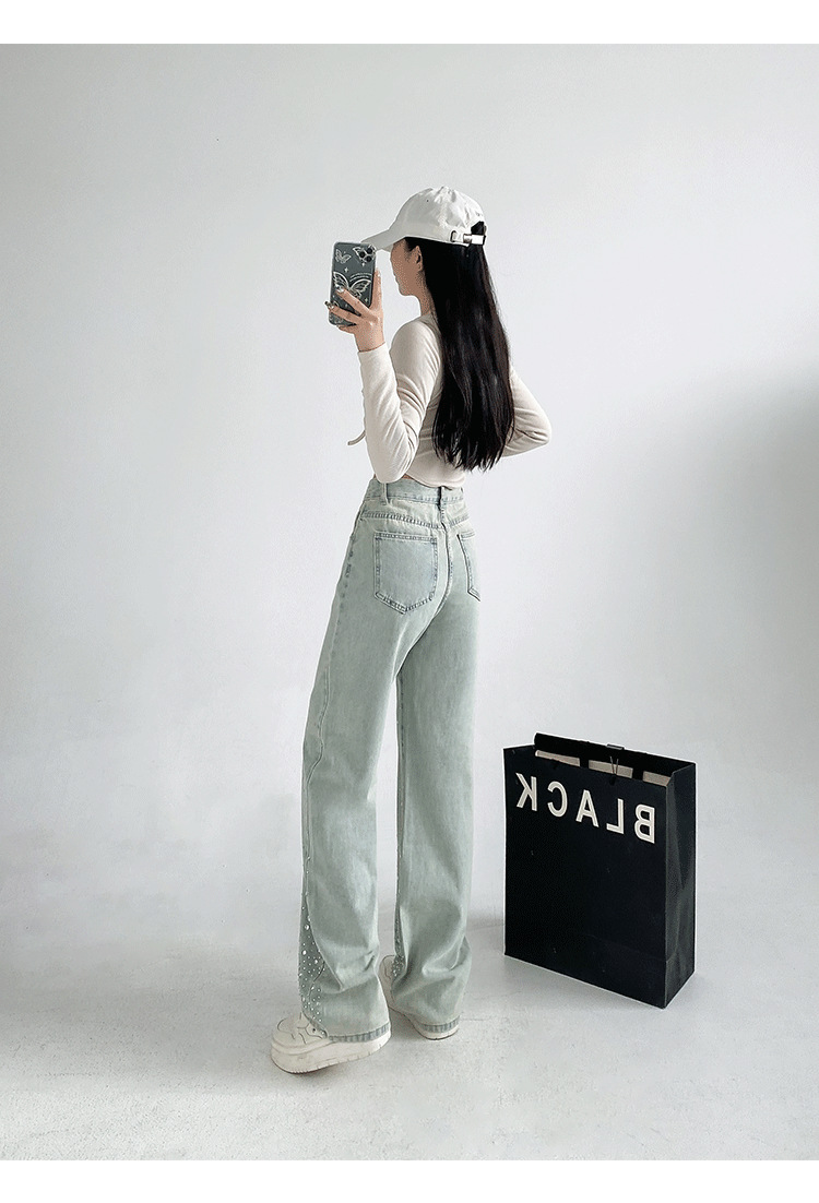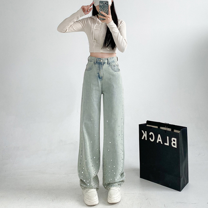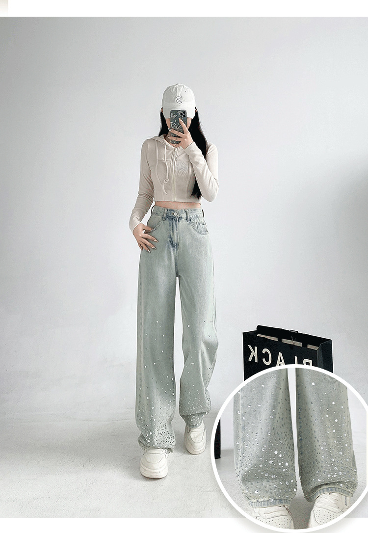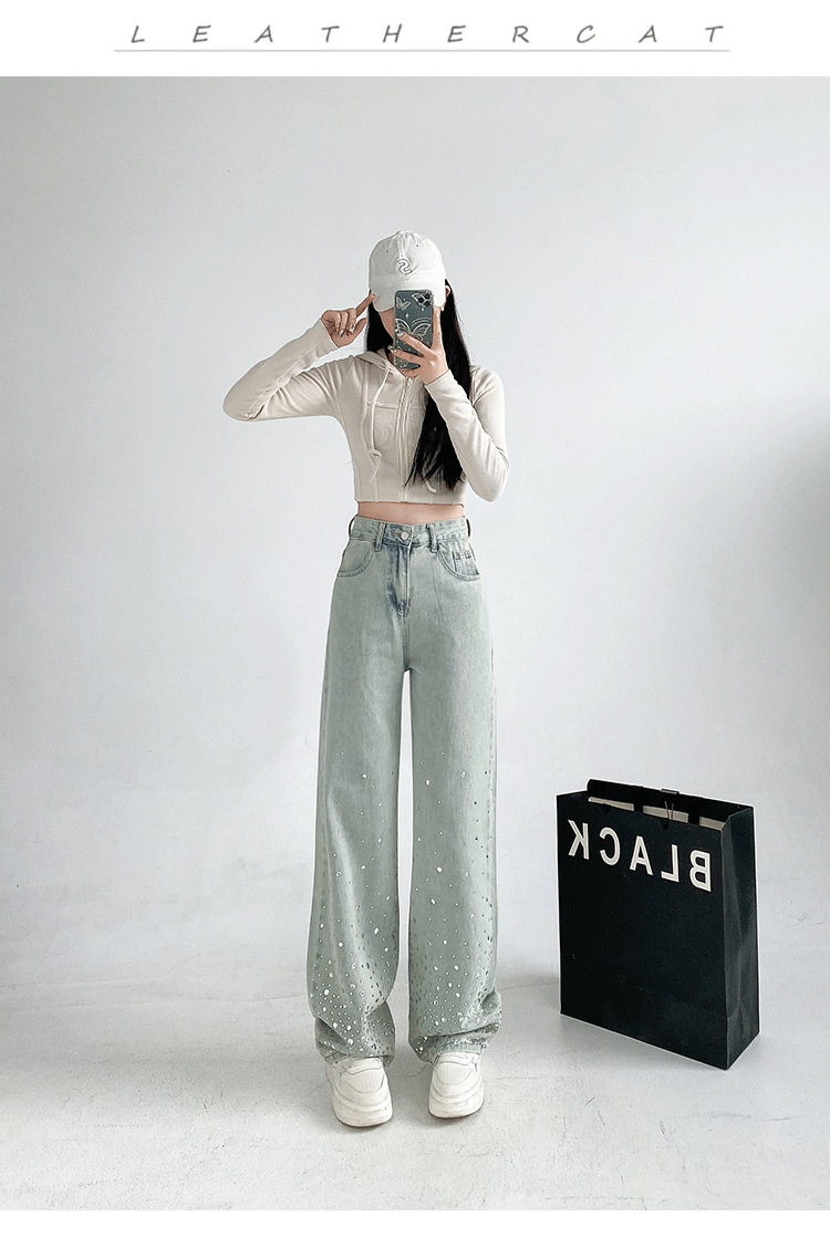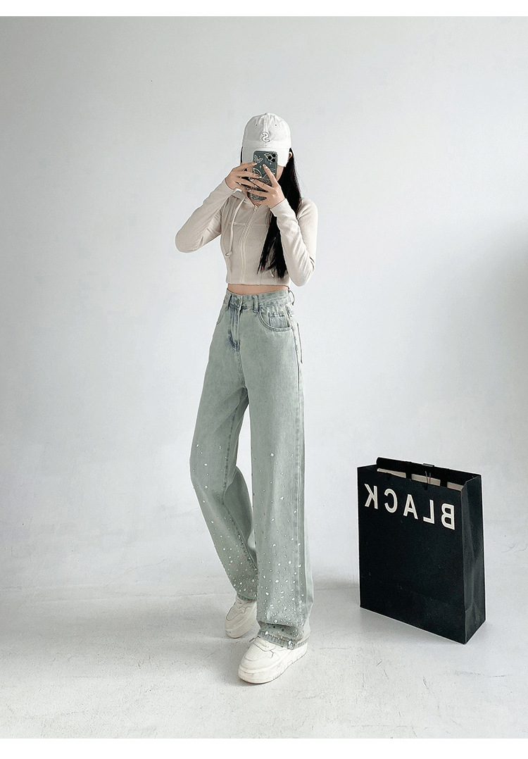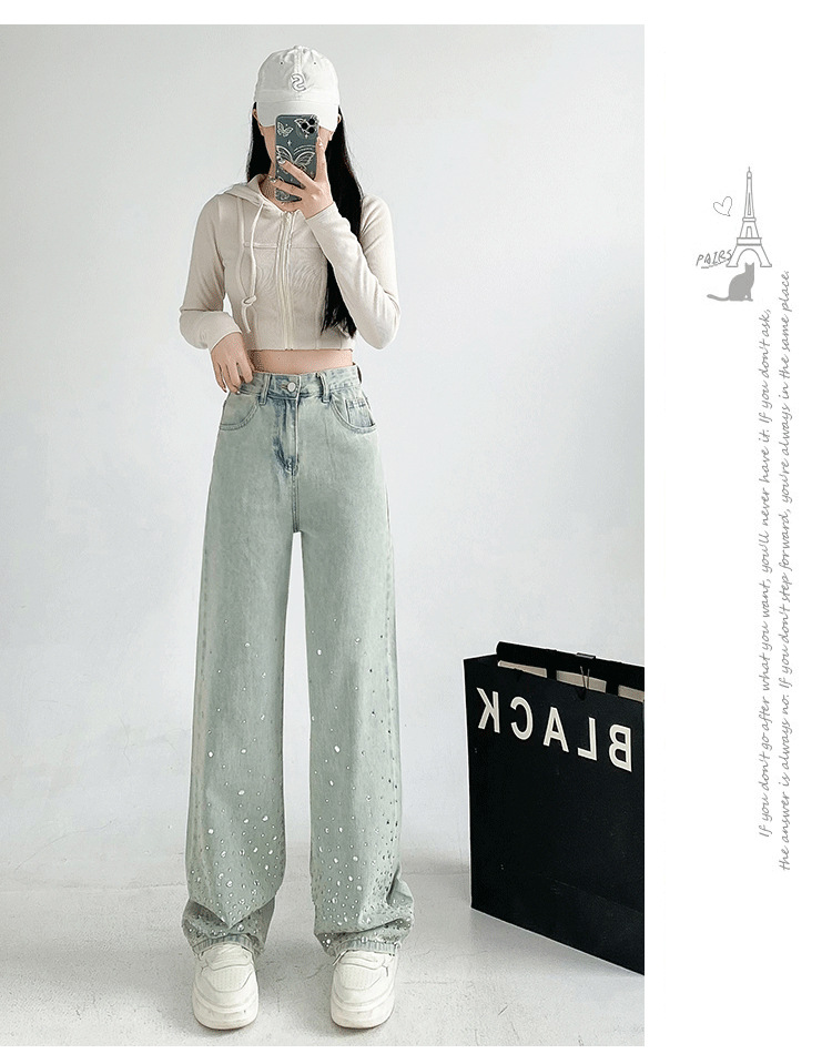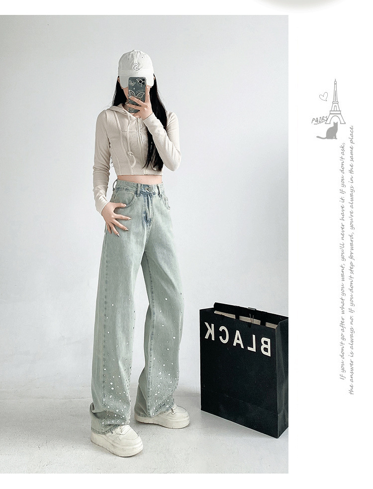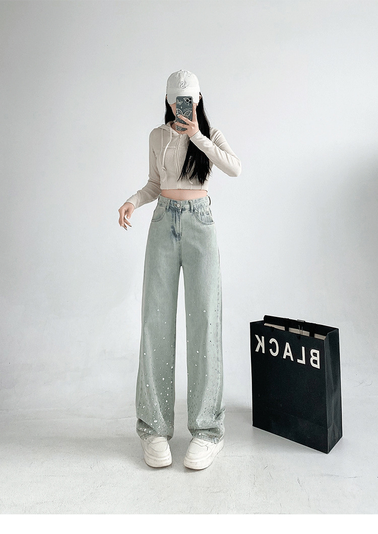 폭발성 중공업, 빛나는 넓은 다리 청바지 여성의 2024 가을 새로운 느슨한 슬리밍 서양식 스트레이트 다리 바지