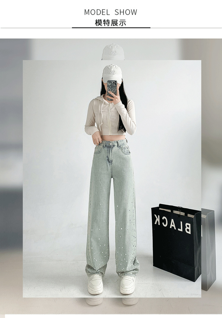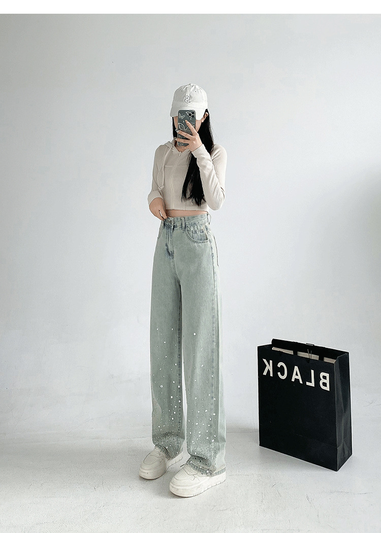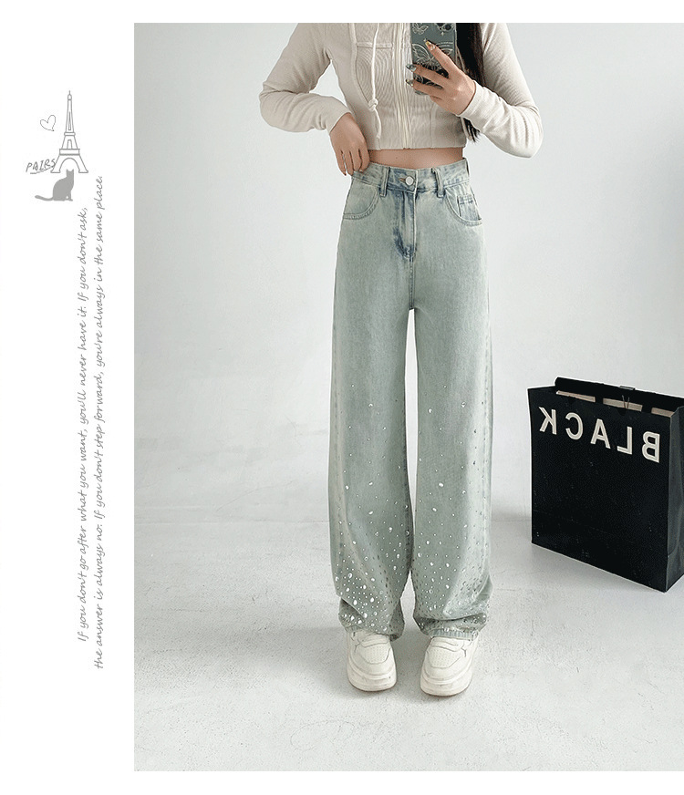 폭발성 중공업, 빛나는 넓은 다리 청바지 여성의 2024 가을 새로운 느슨한 슬리밍 서양식 스트레이트 다리 바지스토어 가기