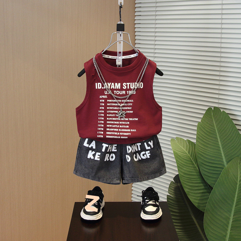 어린이 여름 민소매 조끼 세트 2025 뉴 보이즈 여름 반팔 투피스 베이비 스타일 웨이스트 코트 트렌디