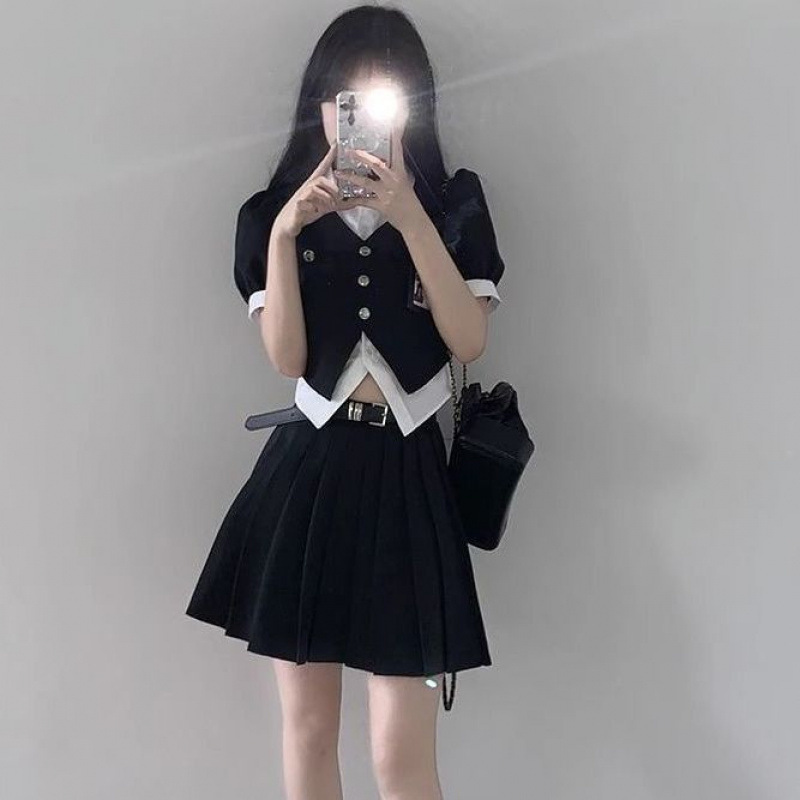 플러스 사이즈 통비 칼리지 스타일 칼라 가짜 투피스 반팔 셔츠 여자 여름 쇼트 탑 플리츠 스커트 투피스 세트
