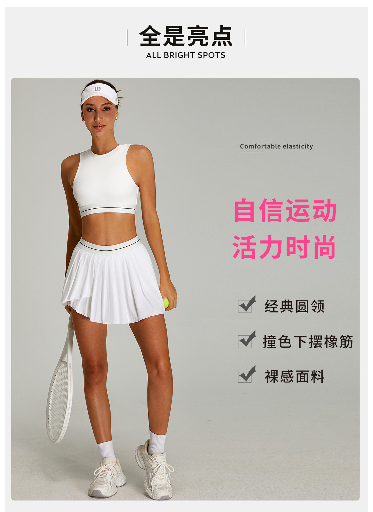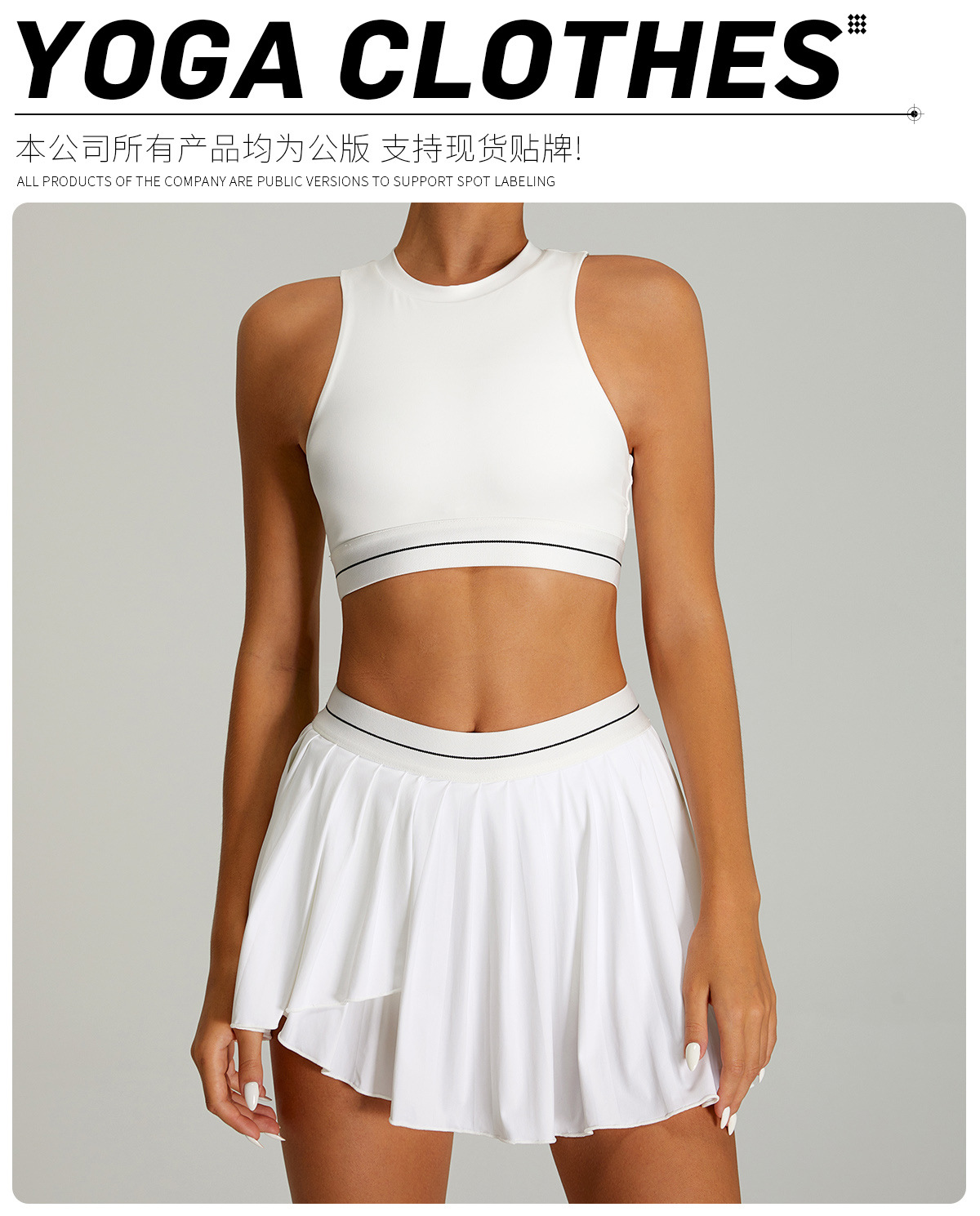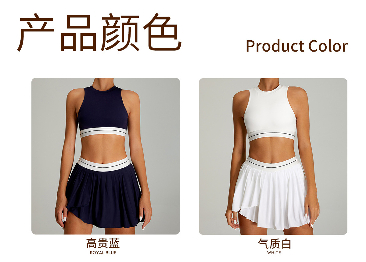 유럽과 미국의 새로운 콘트라스트 컬러 요가 의류 세트 여성 야외 스포츠 테니스 의류 세트 여성용 꽉 끼는 빠른 건조 주름 치마