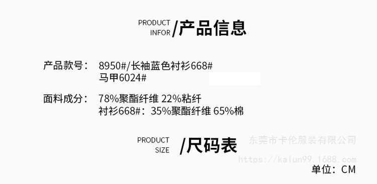 • 진한 파란색 6023 조끼 + 8950 스커트 + 파란색 668 긴팔 셔츠