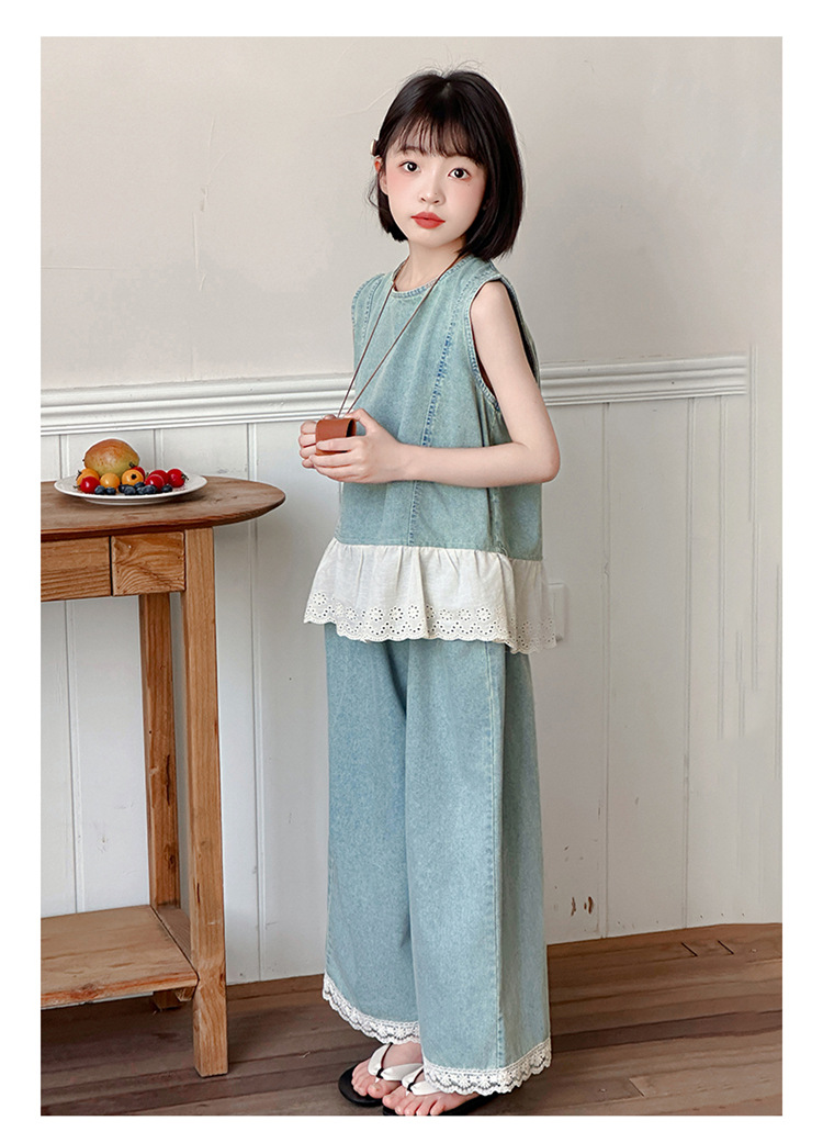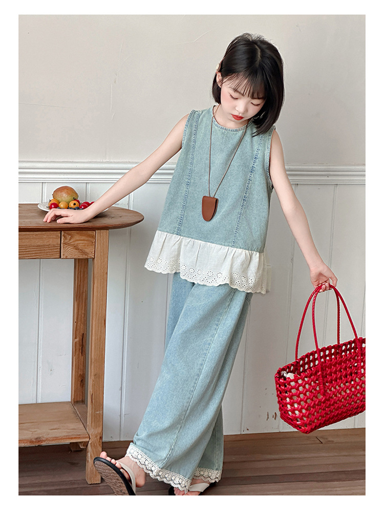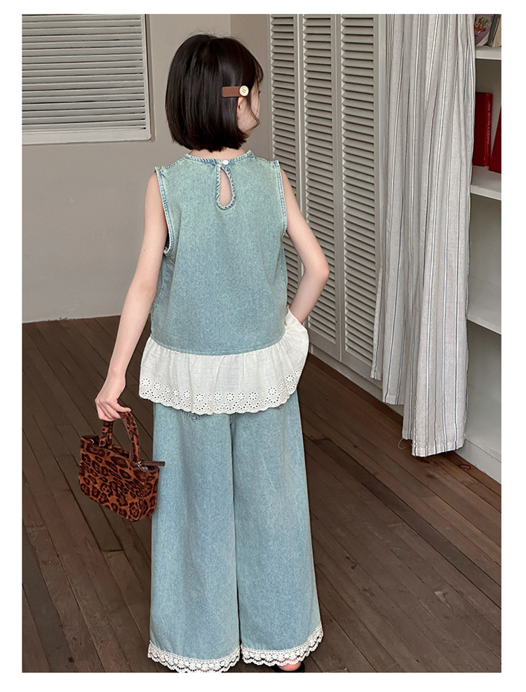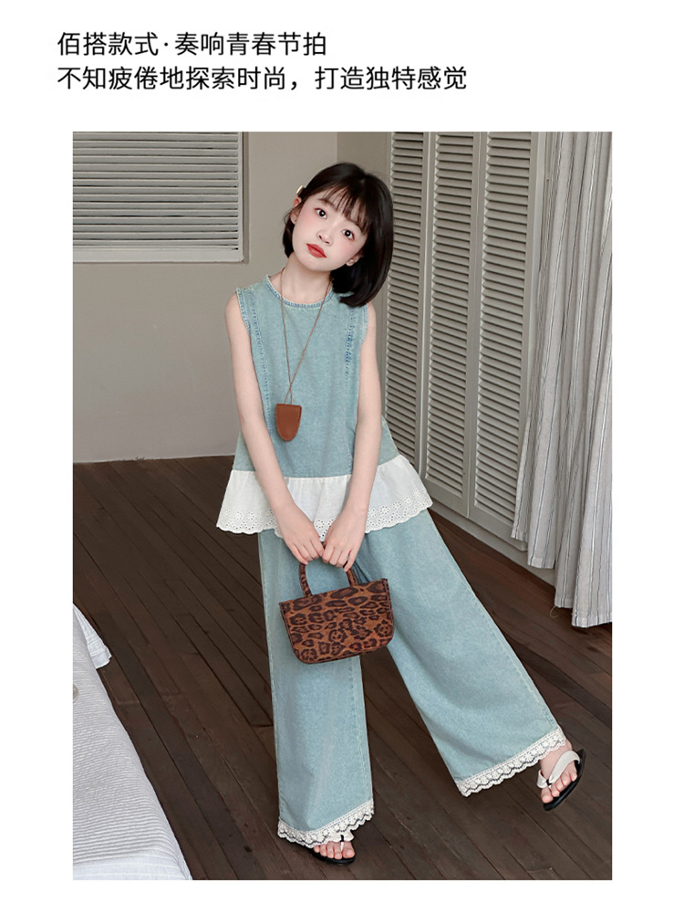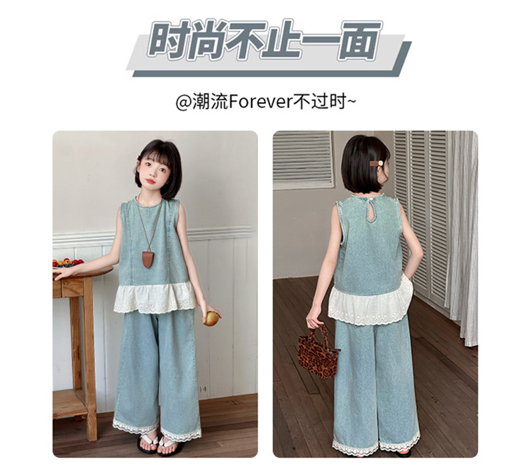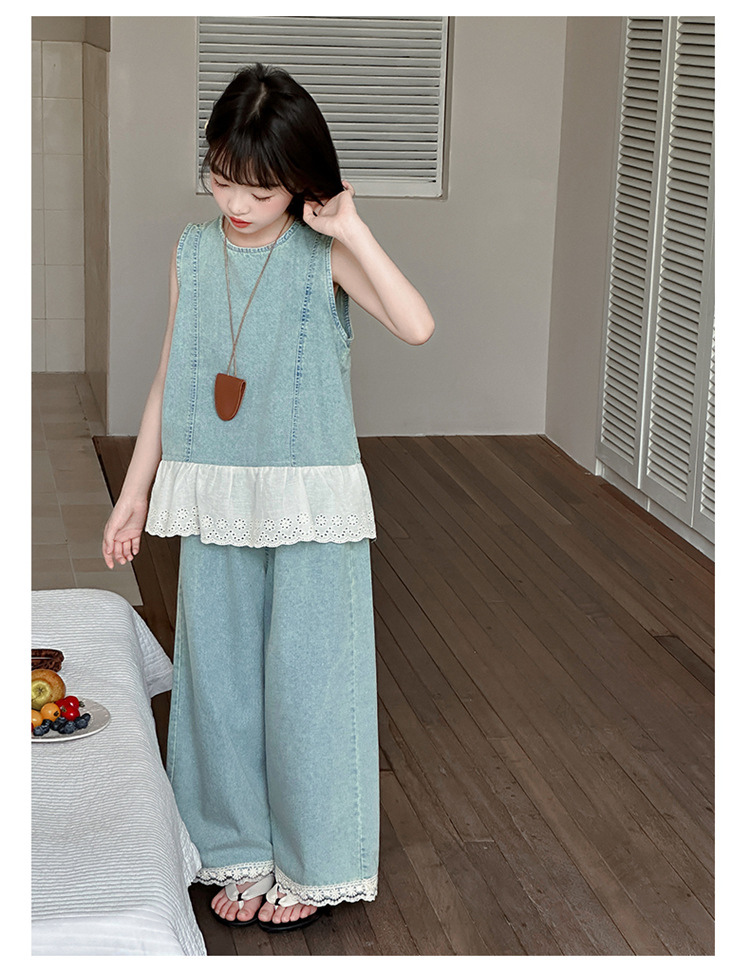 소녀 세트 2025 년 여름 새 소녀의 데님 레이스 바느질 민소매 조끼 와이드 레그 바지 투피스 유행스토어 가기