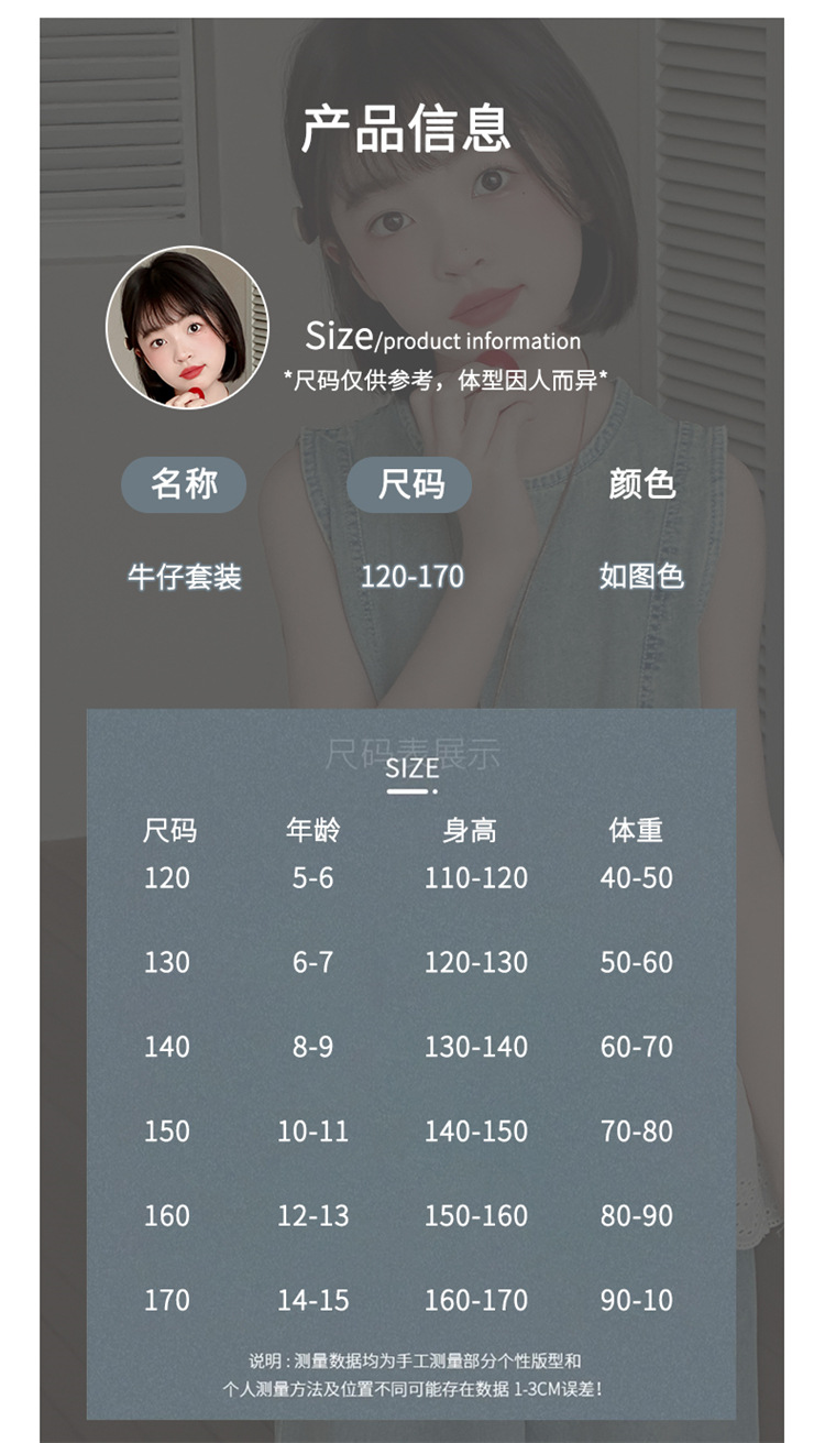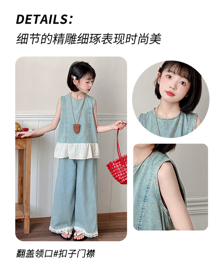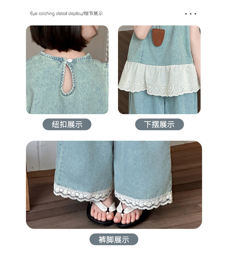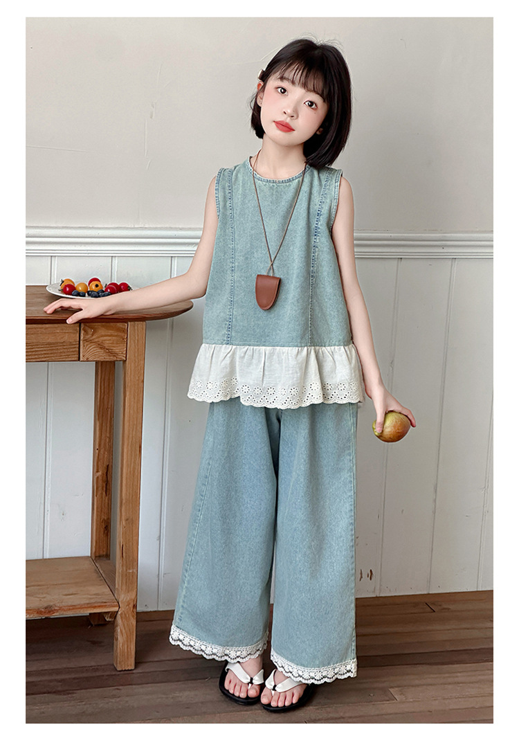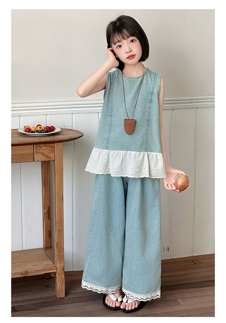 소녀 세트 2025 년 여름 새 소녀의 데님 레이스 바느질 민소매 조끼 와이드 레그 바지 투피스 유행스토어 가기
