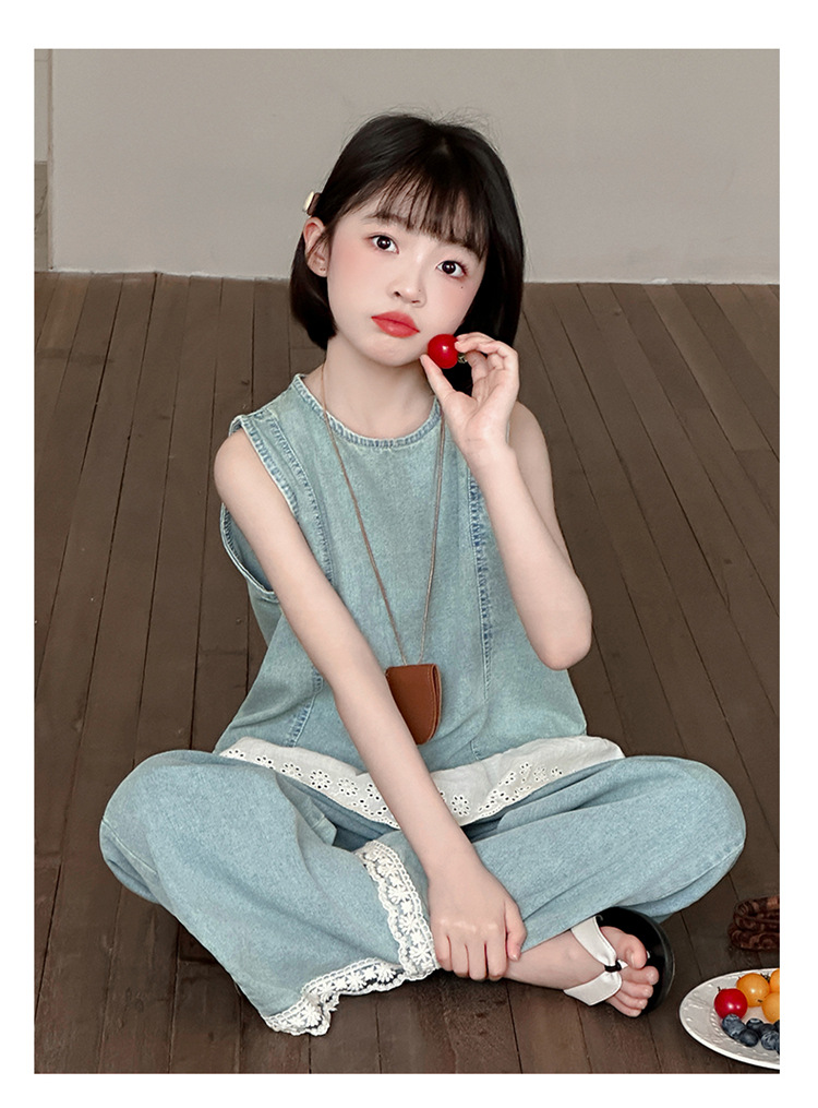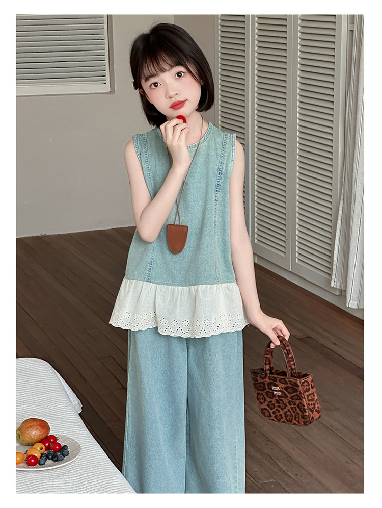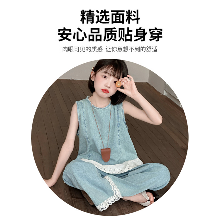 소녀 세트 2025 년 여름 새 소녀의 데님 레이스 바느질 민소매 조끼 와이드 레그 바지 투피스 유행