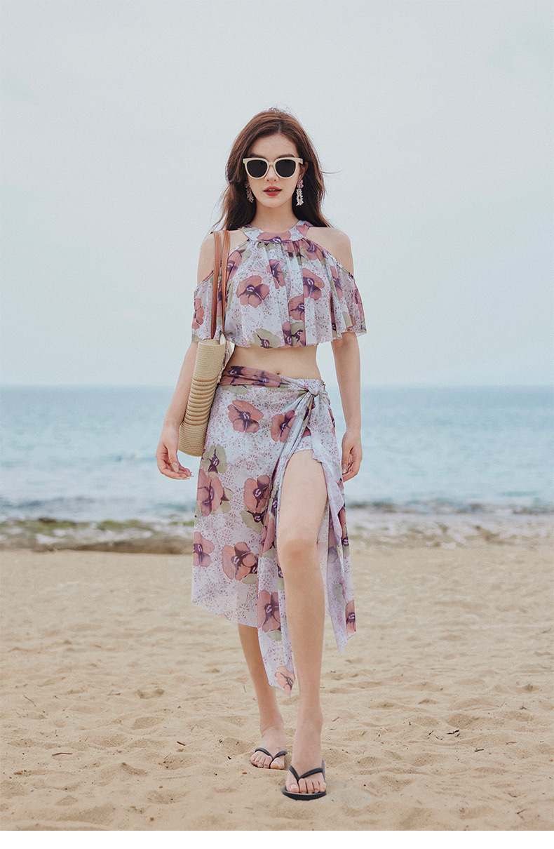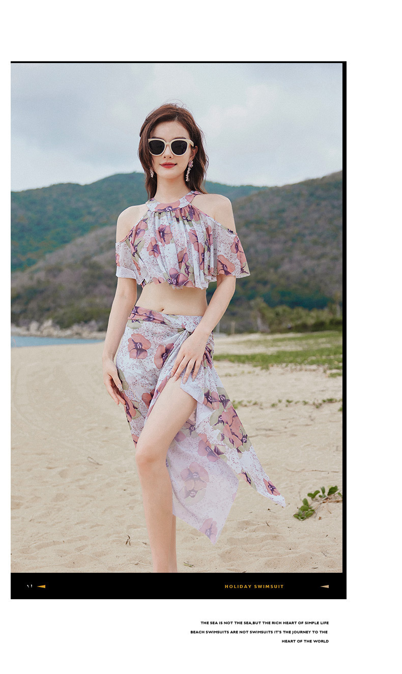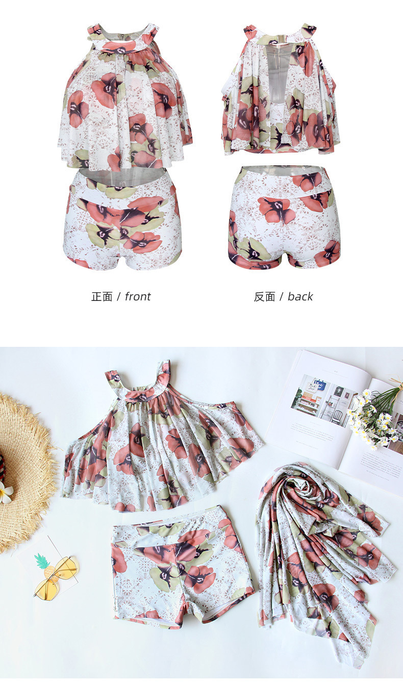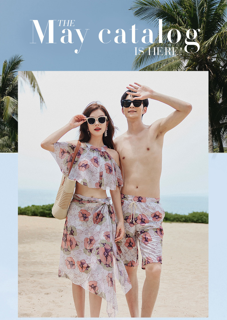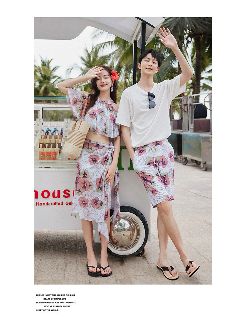 厂家直销情侣新款平角分体比基尼三件套温泉女游泳衣男平角沙滩裤