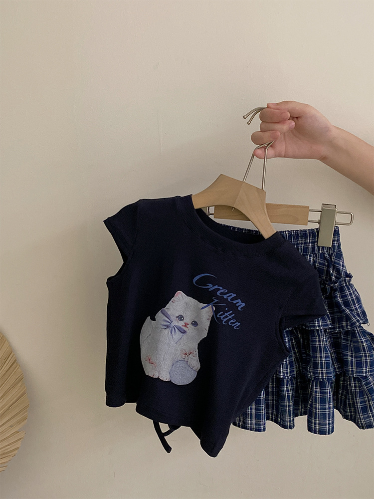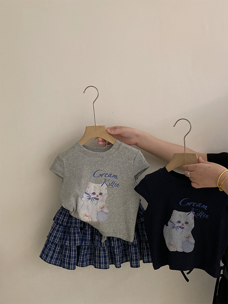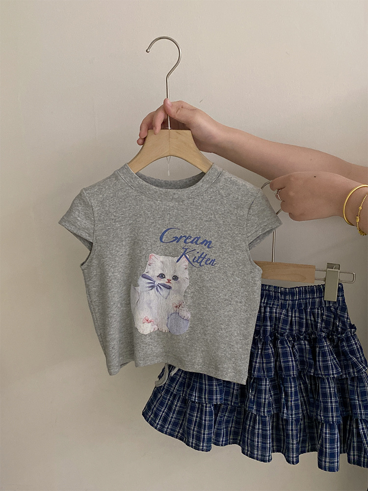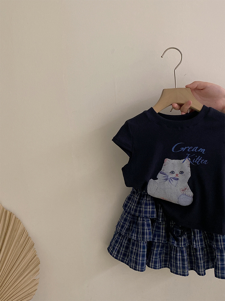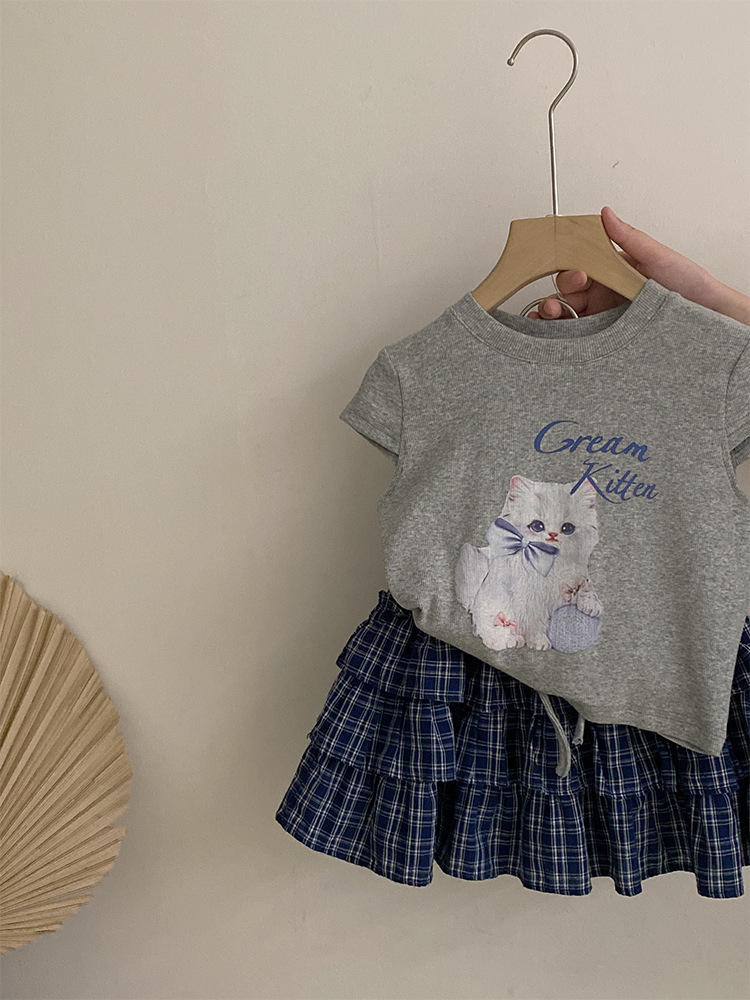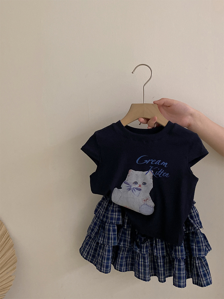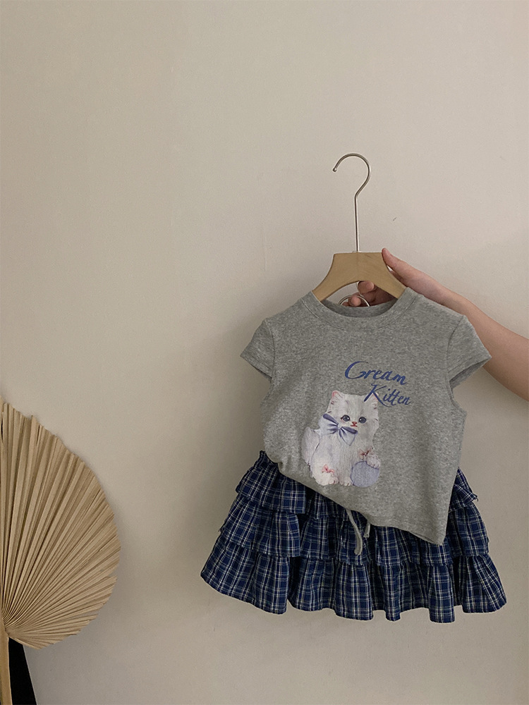 여자 투피스 세트 미국식 고양이 어깨 반팔 티셔츠 여자 여름 2025 새로운 어린이 올매치 플레이드 스커트스토어 가기