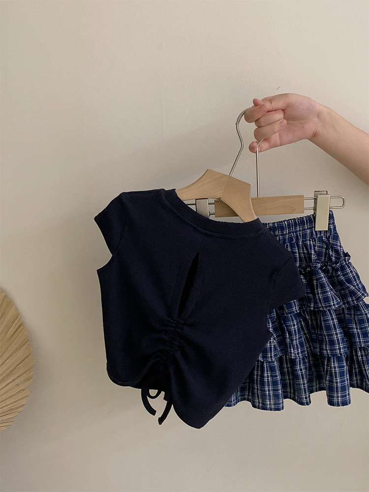 여자 투피스 세트 미국식 고양이 어깨 반팔 티셔츠 여자 여름 2025 새로운 어린이 올매치 플레이드 스커트