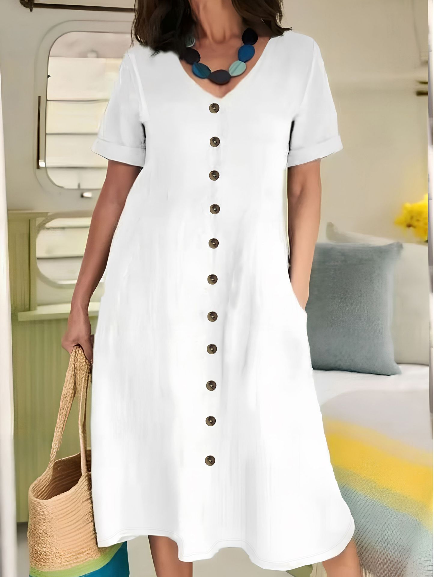 유럽과 미국의 국경 간 아마존 새로운 여름 패션 버튼 v 넥 솔리드 컬러 루즈 하이 웨이스트 코튼 린넨 드레스스토어 가기