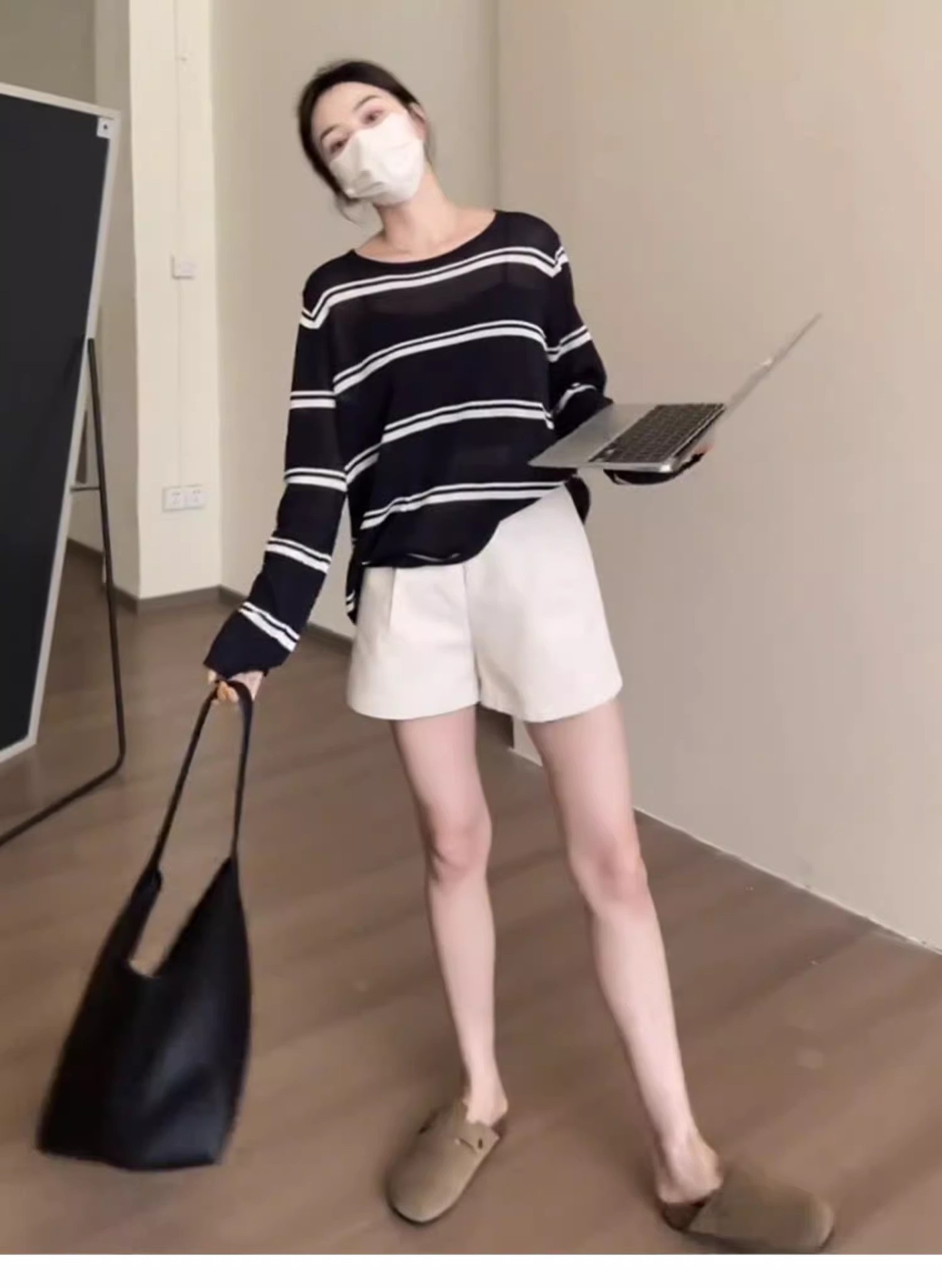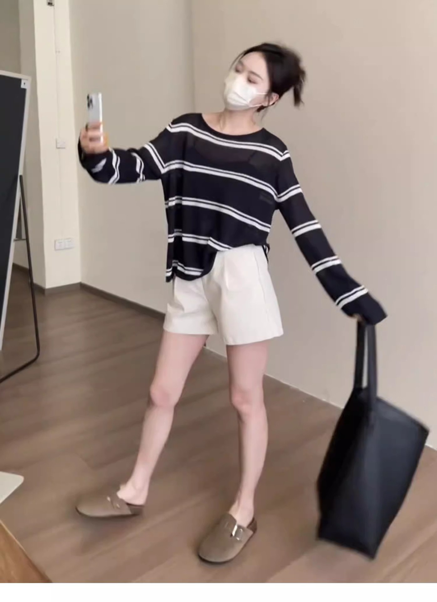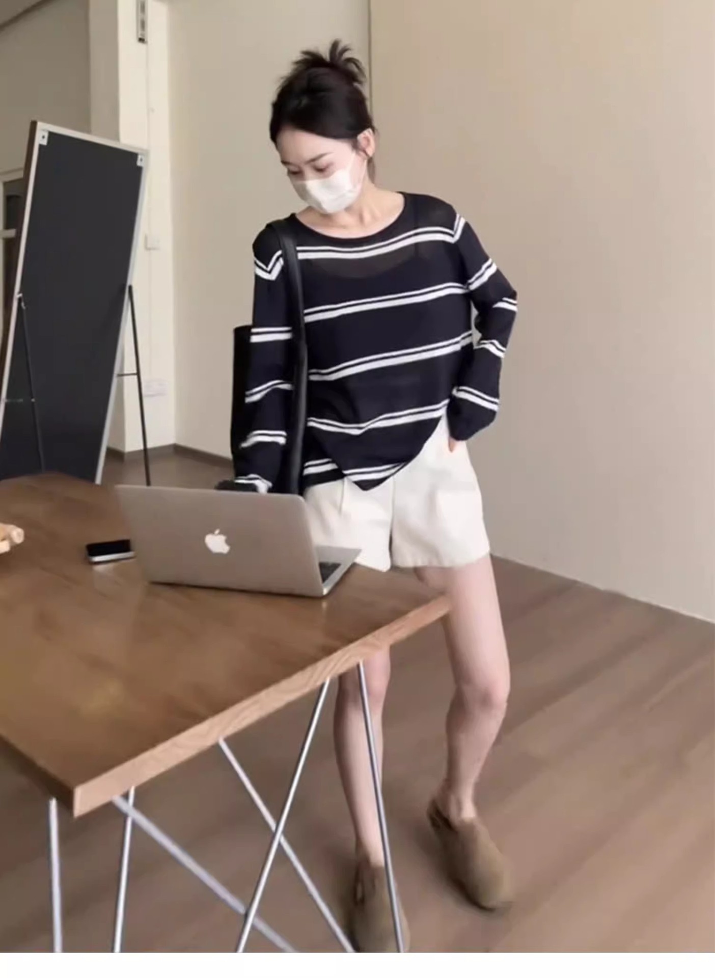 韩系条纹防晒冰丝针织空调长袖t恤宽松后背开叉上衣罩衫薄女夏季