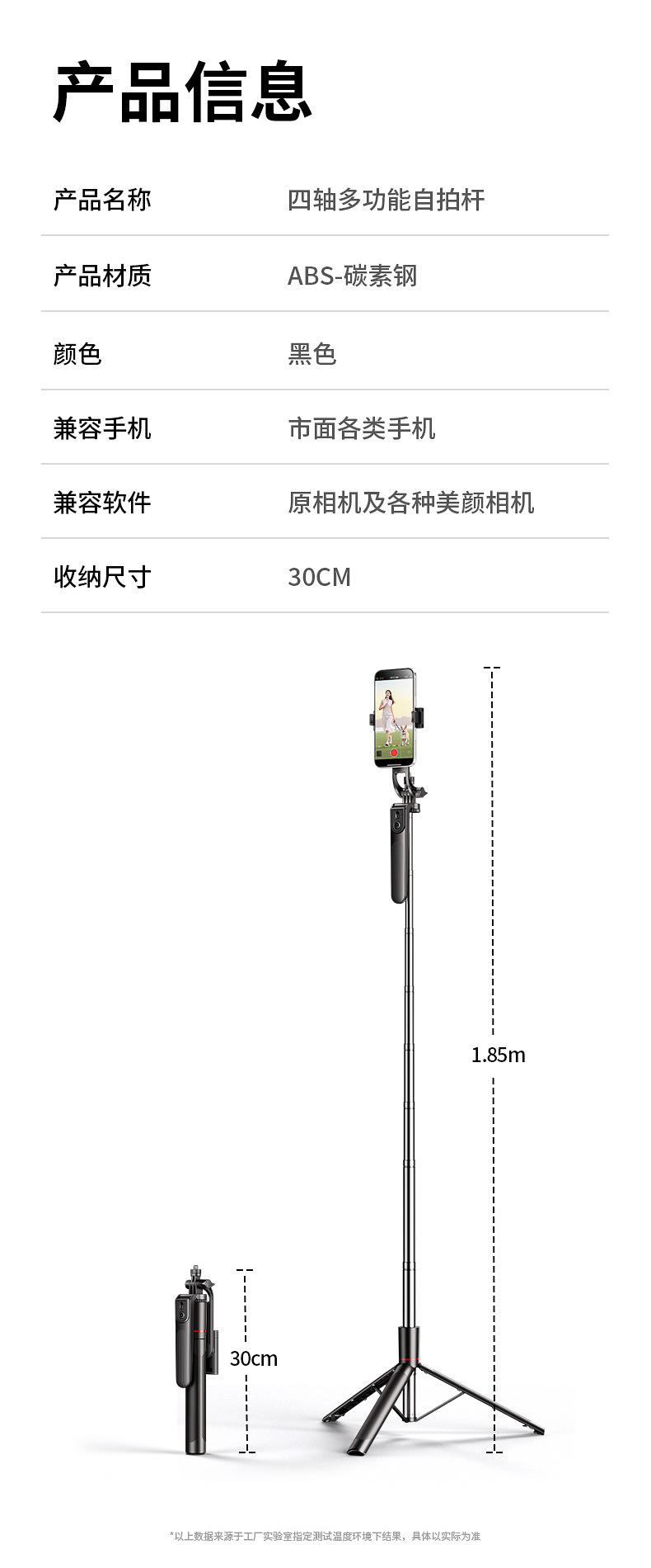 • 1.85m 검정색 - 손잡이 포함 1/4 나사 구멍 - 단일 보조광 [이중 안정 삼각대 + 블루투스 리모콘]
