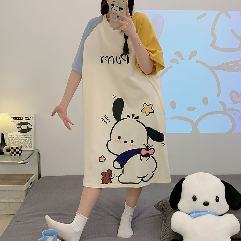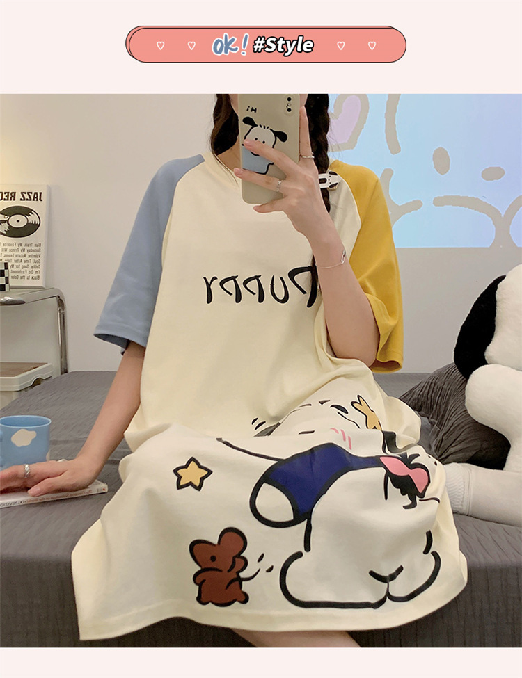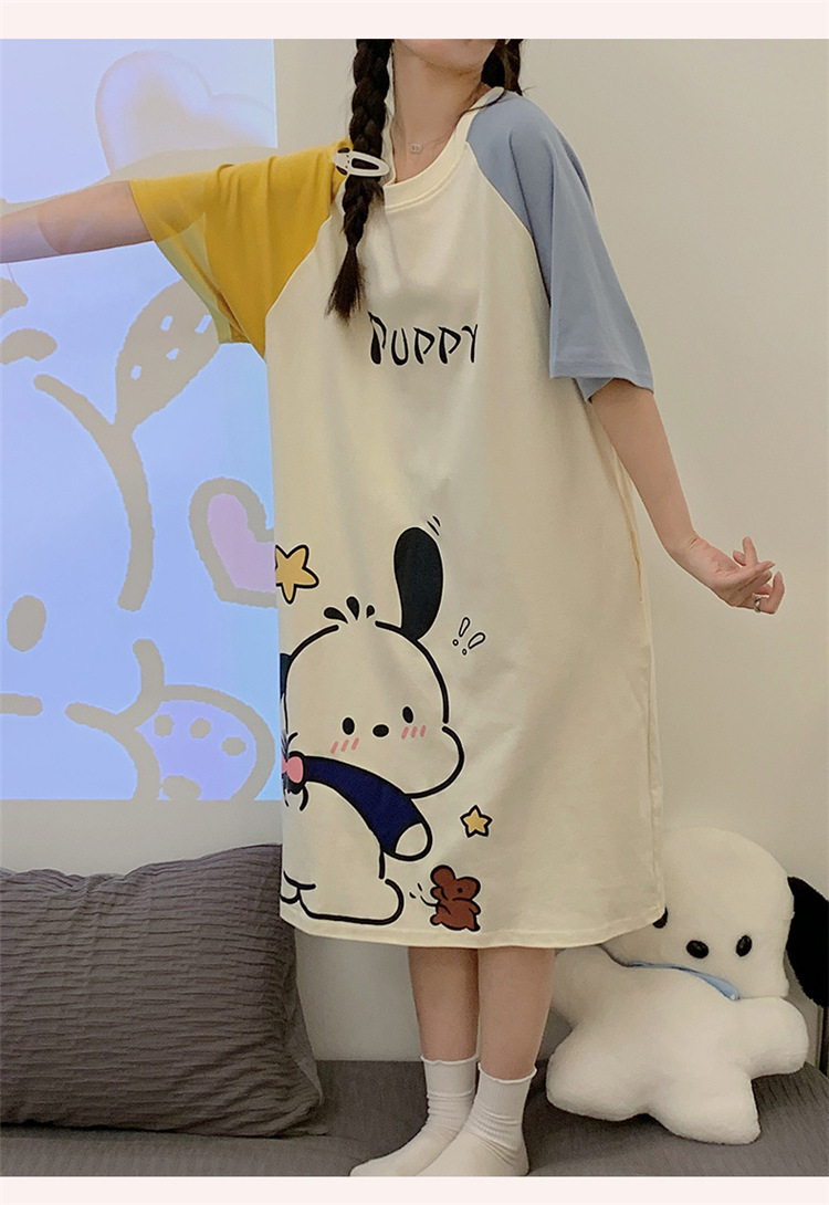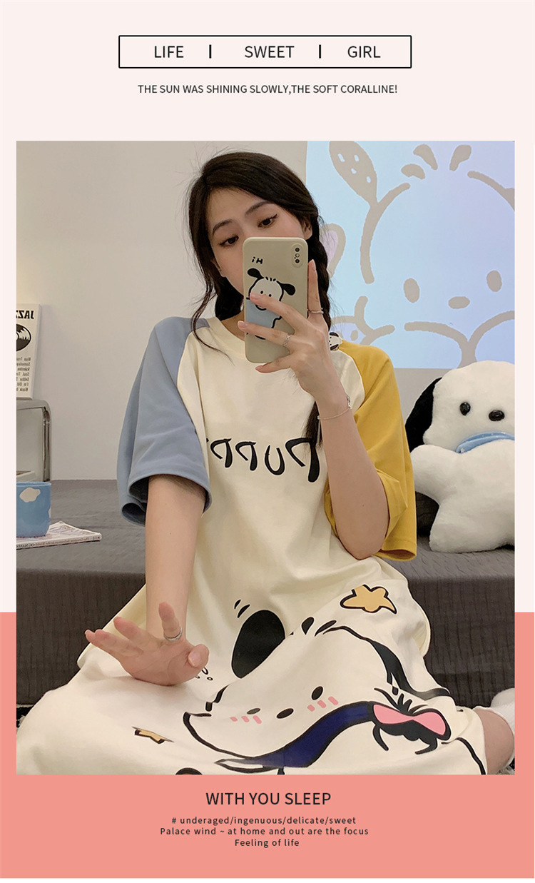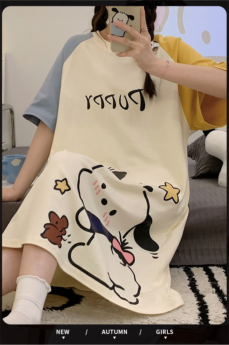나이트 드레스 여성의 여름 얇은 귀여운 달콤한 짧은 소매 Ins 느슨한 만화 학생 플러스 사이즈 파샬 개 잠옷 봄과 가을스토어 가기