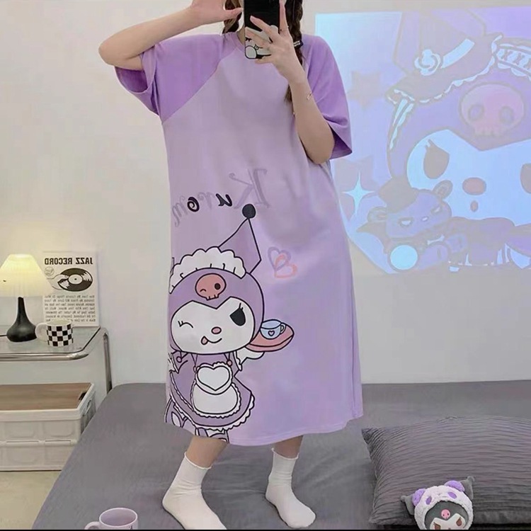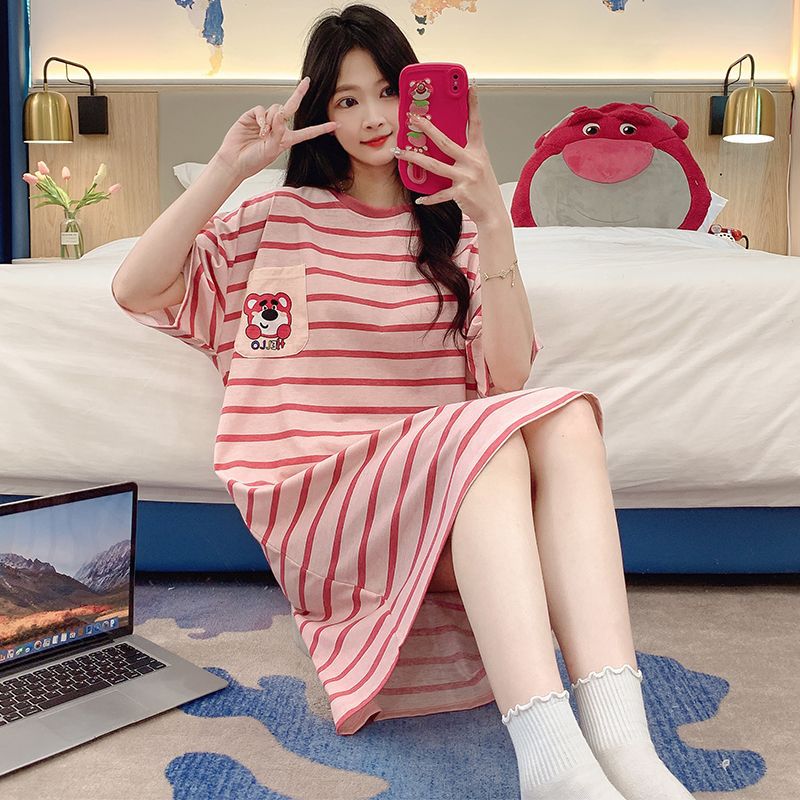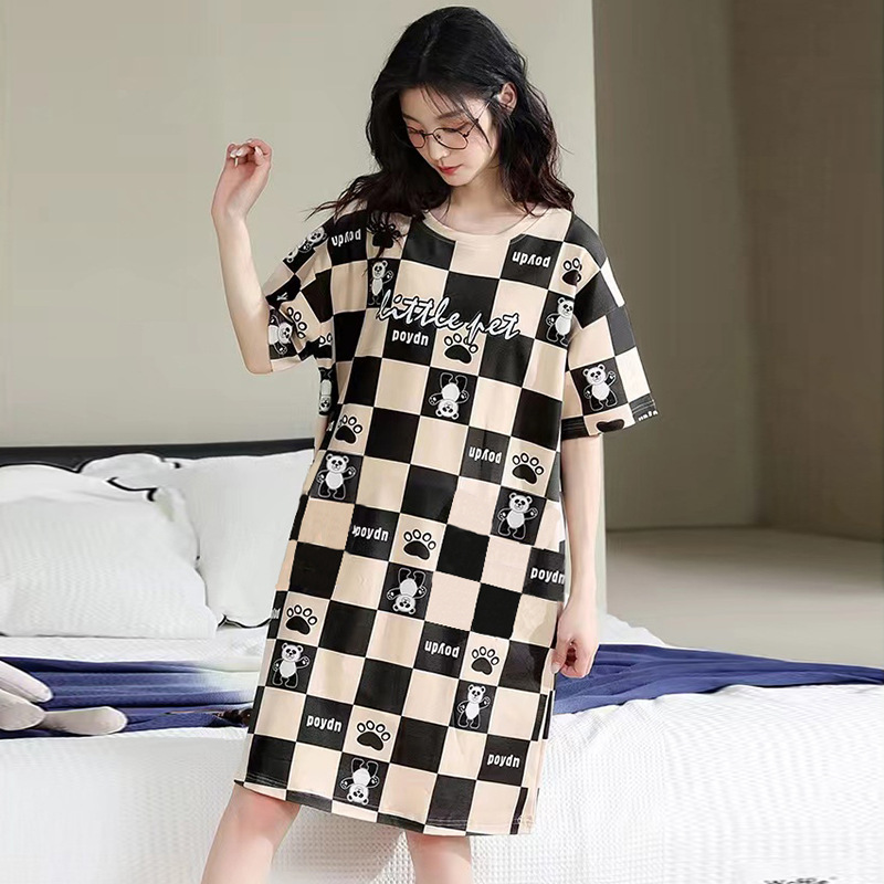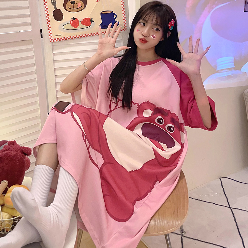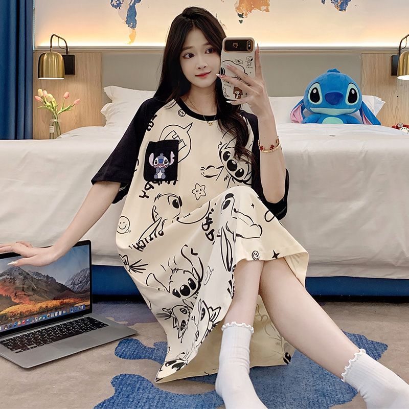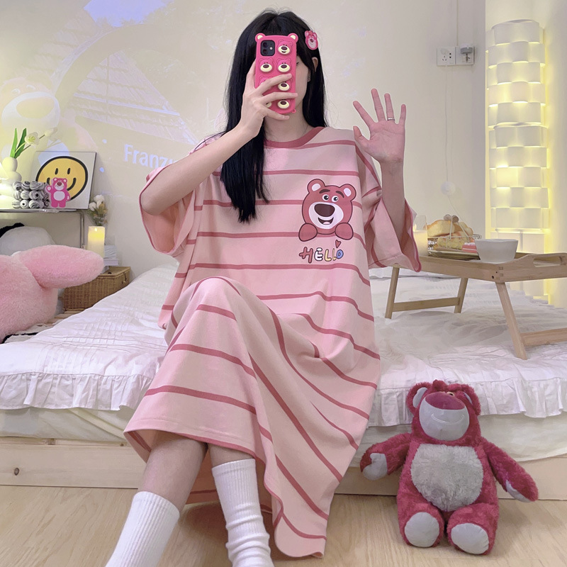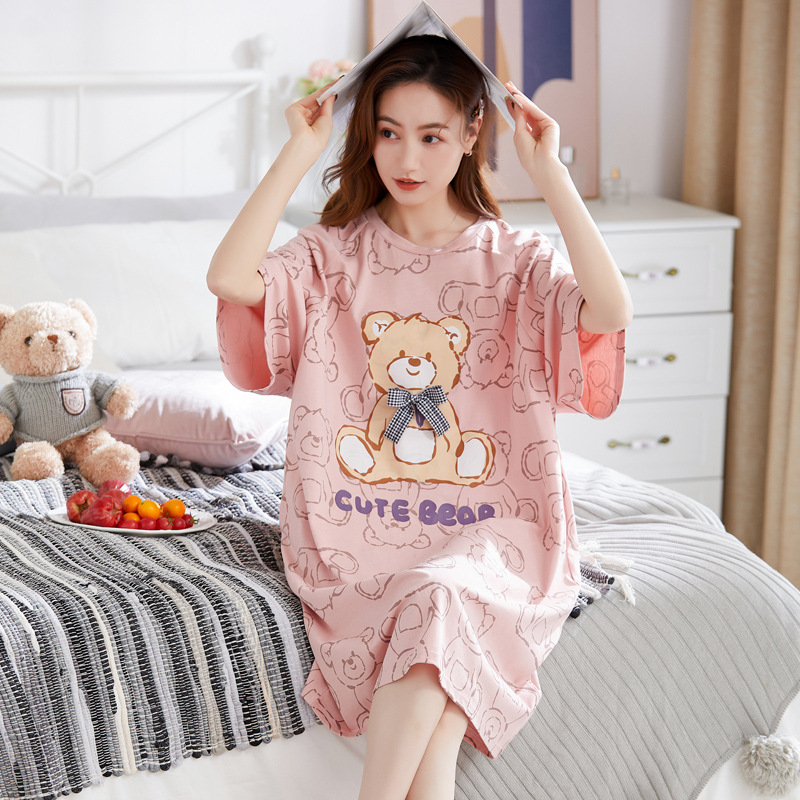 나이트 드레스 여성의 여름 얇은 귀여운 달콤한 짧은 소매 Ins 느슨한 만화 학생 플러스 사이즈 파샬 개 잠옷 봄과 가을스토어 가기
