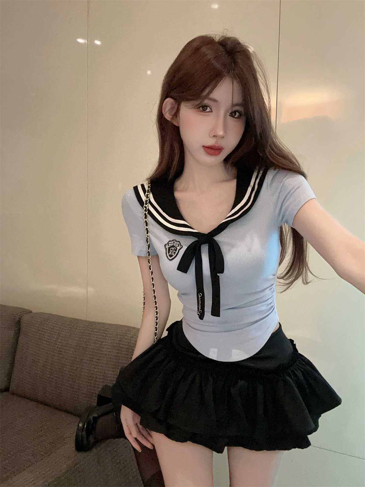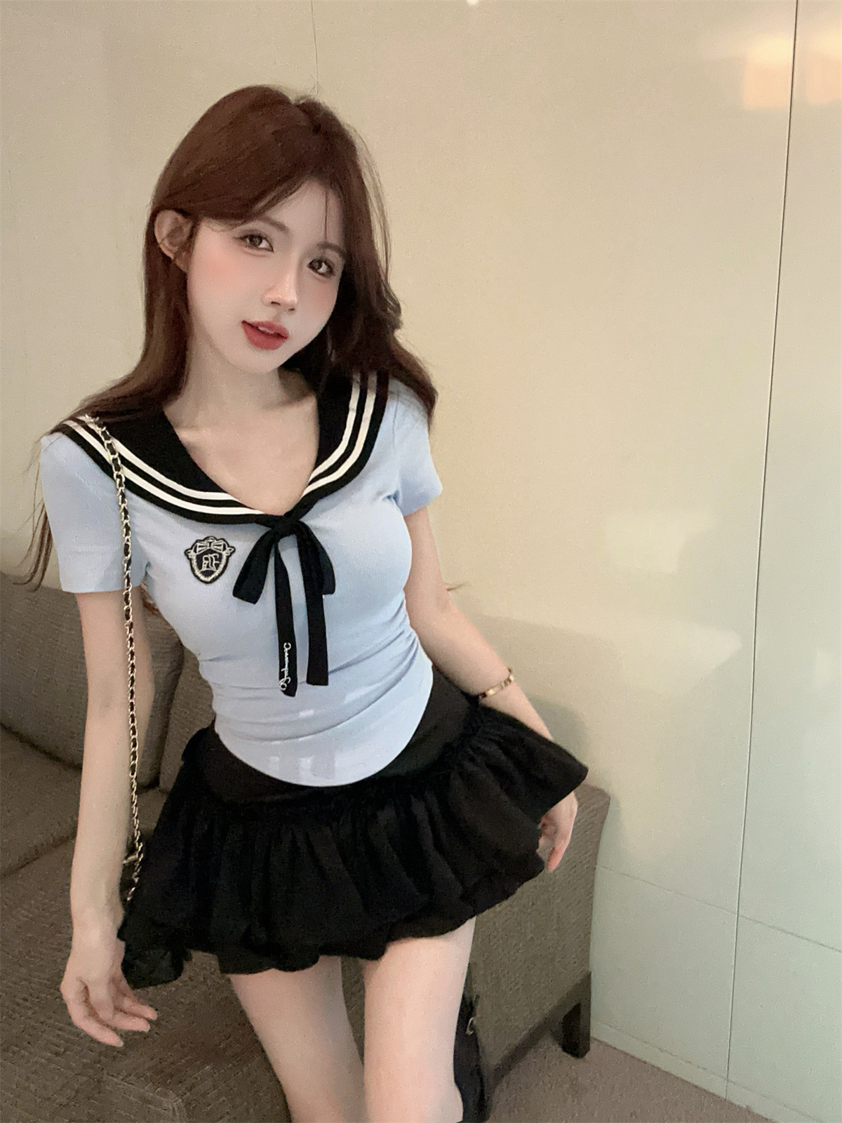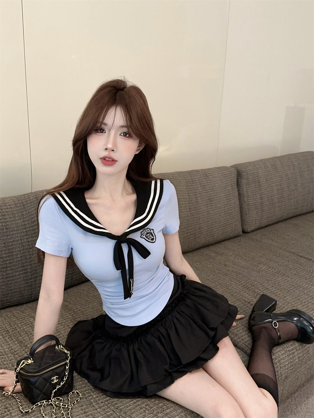 여성을위한 대학 스타일의 예쁜 반팔 탑 여름 순수 달콤한 스파이스 소녀 여성을위한 짧은 최고급 세련된 아름다운 티셔츠스토어 가기