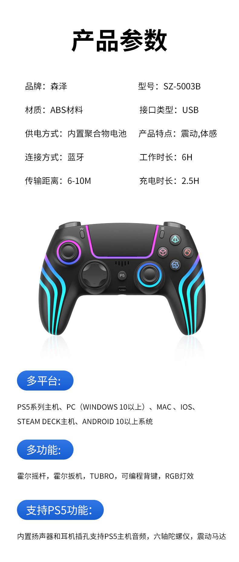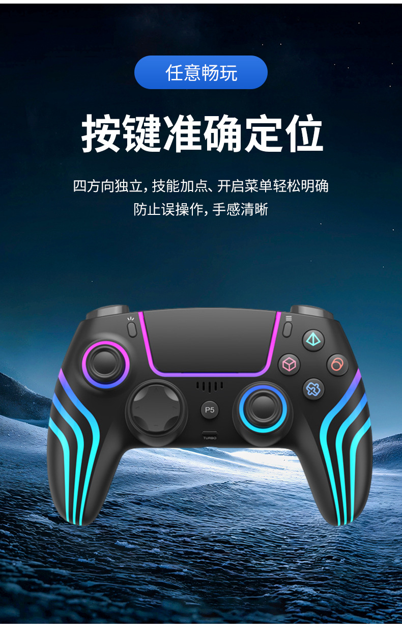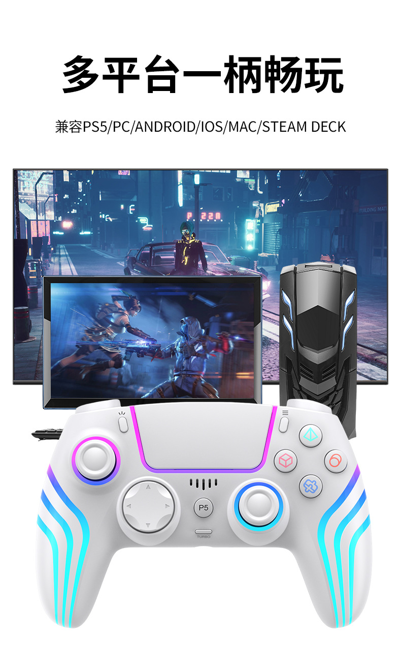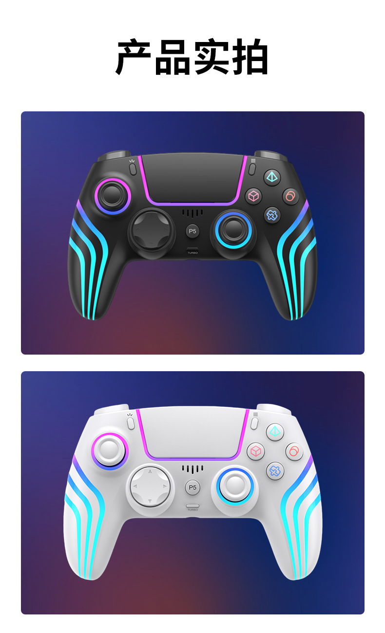 PS5 蓝牙无线手柄。带轴带触摸带语音带震动。LT/RT带霍尔传感器。内置1500毫安电池。蓝牙支持P安卓/X-INPUT/IOS,有线支持D-input/x-input/steam.