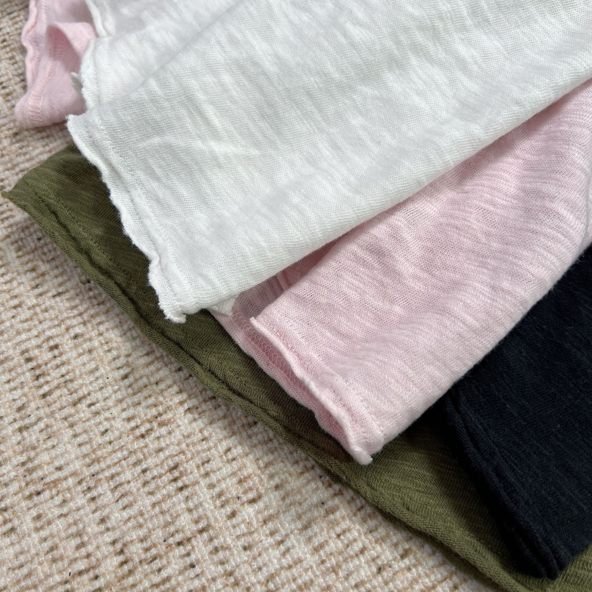松弛感满满领口、袖口和下摆处自然的轻微卷边效果,